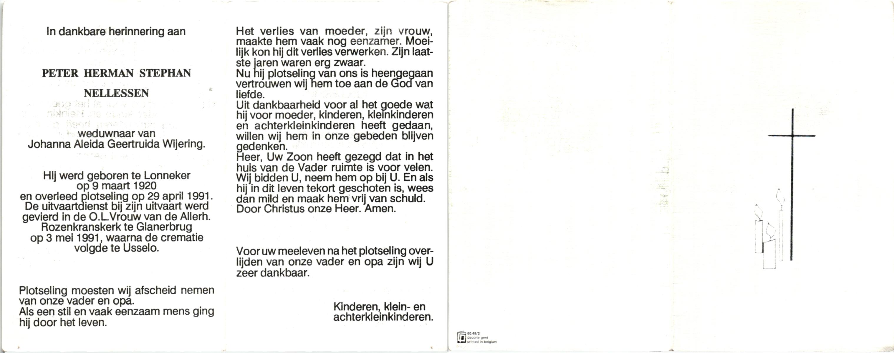 NELLESSEN, , Peter Herman Stephan, geboren op 9-3-1920 te Lonneker, overleden op 29-4-1991 te Glanerbrug op 71-jarige leeftijd, gecremeerd op 3-5-1991 te Usselo.