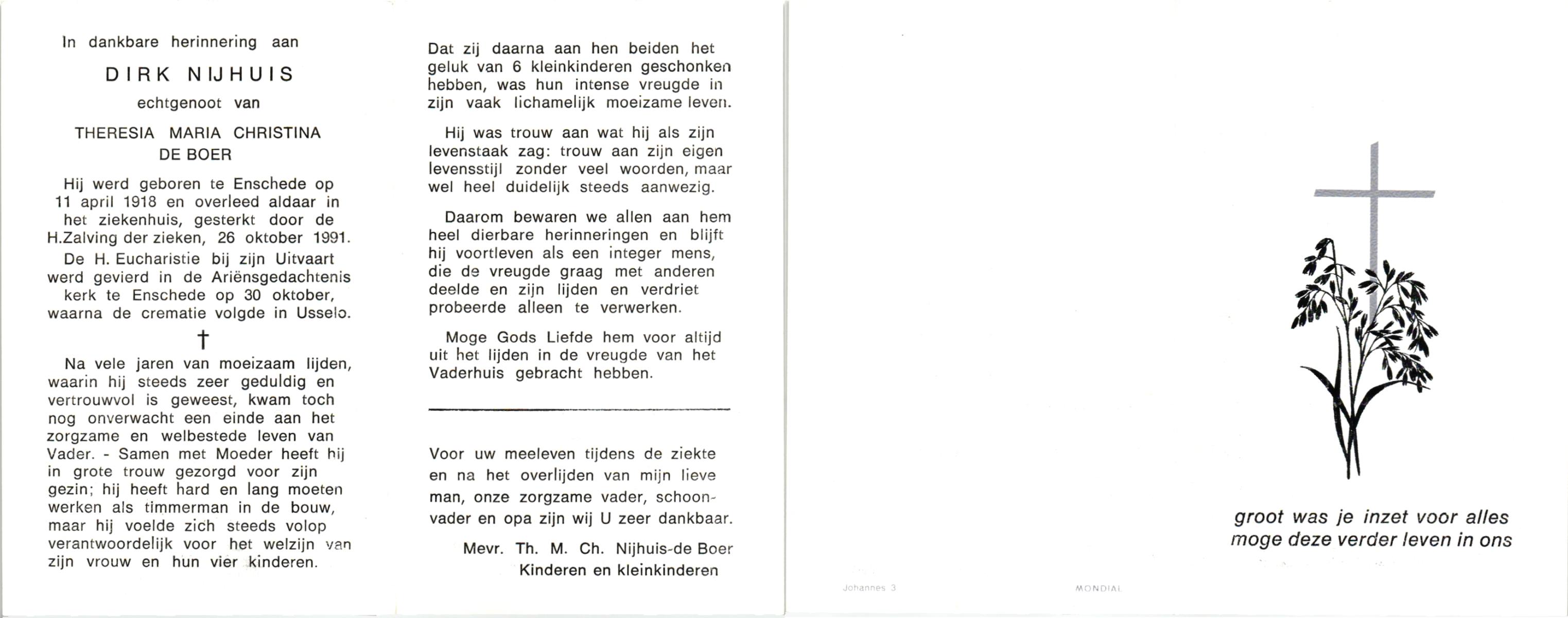 NIJHUIS, , Dirk, geboren op 11-4-1918 te Enschede, overleden op 26-10-1991 te Enschede op 73-jarige leeftijd, gecremeerd op 30-10-1991 te Usselo.