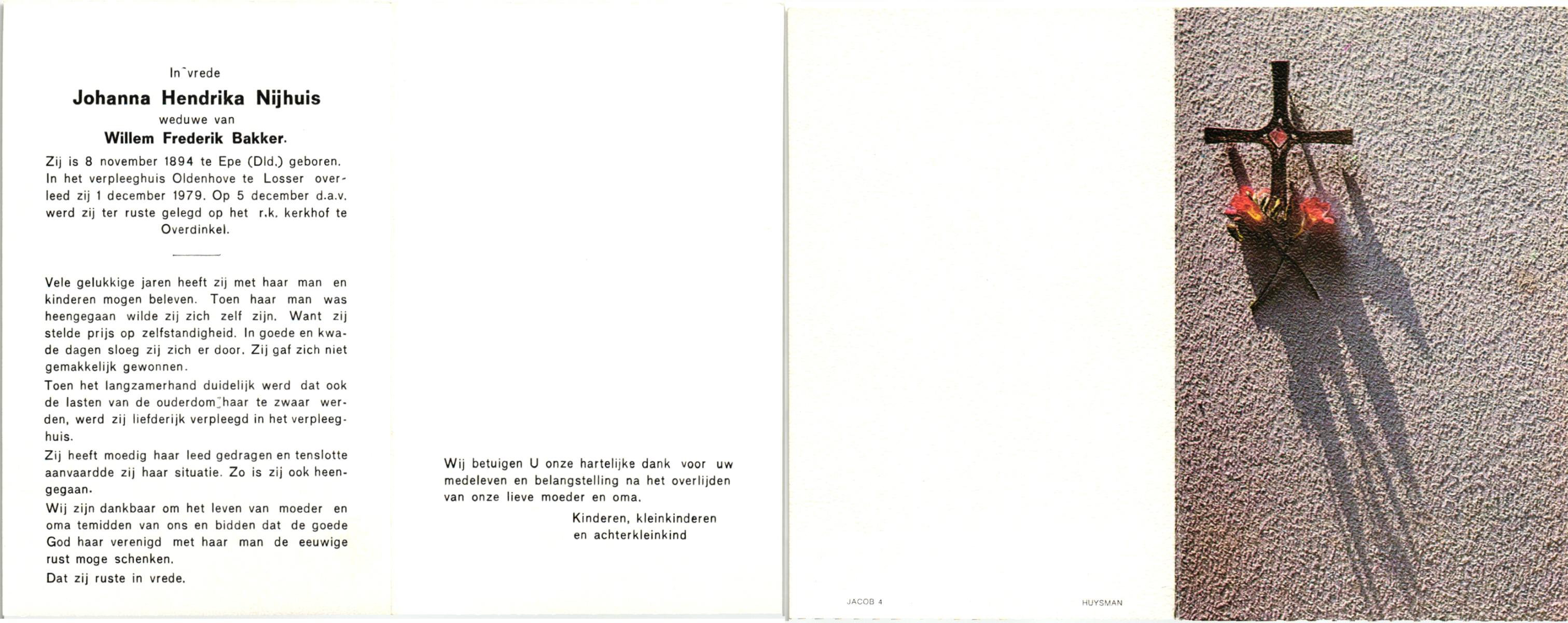 NIJHUIS, , Johanna Hendrika, geboren op 08-11-1894 te Epe, Dld, overleden op 1-12-1979 te Losser op 85-jarige leeftijd, begraven op 5-12-1979 te Overdinkel.