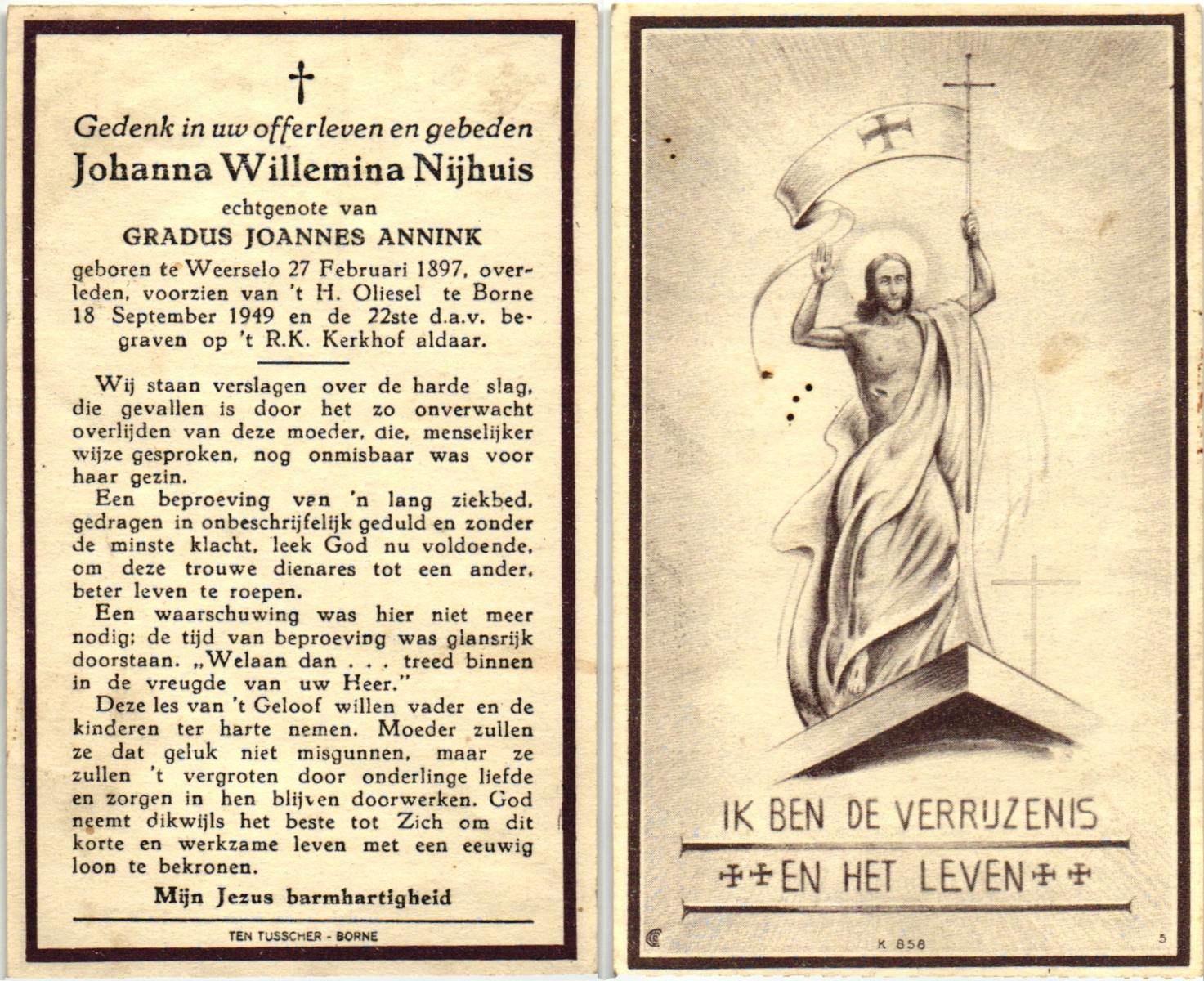 NIJHUIS, , Johanna Willemina, geboren op 27-02-1897 te Weerselo, overleden op 18-9-1949 te Borne op 52-jarige leeftijd, begraven op 22-9-1949 te Borne.