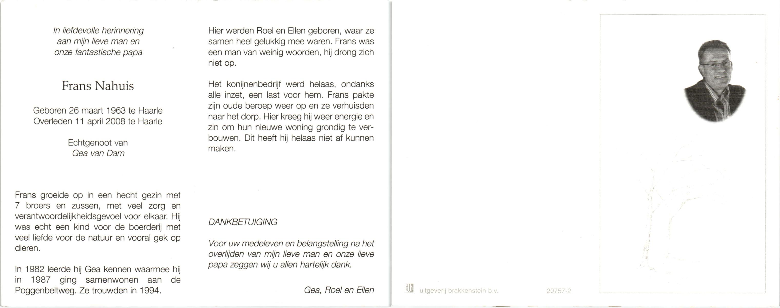 NAHUIS, Frans, geboren op 26-3-1963 te Hellendoorn, Haarle, overleden op 11-4-2008 te Hellendoorn, Haarle op 45-jarige leeftijd.