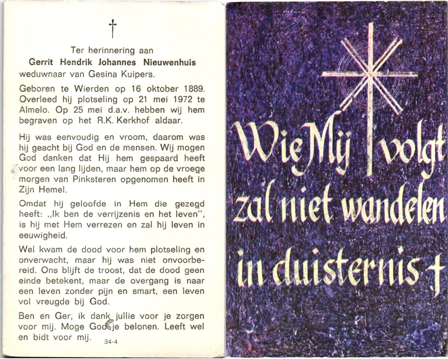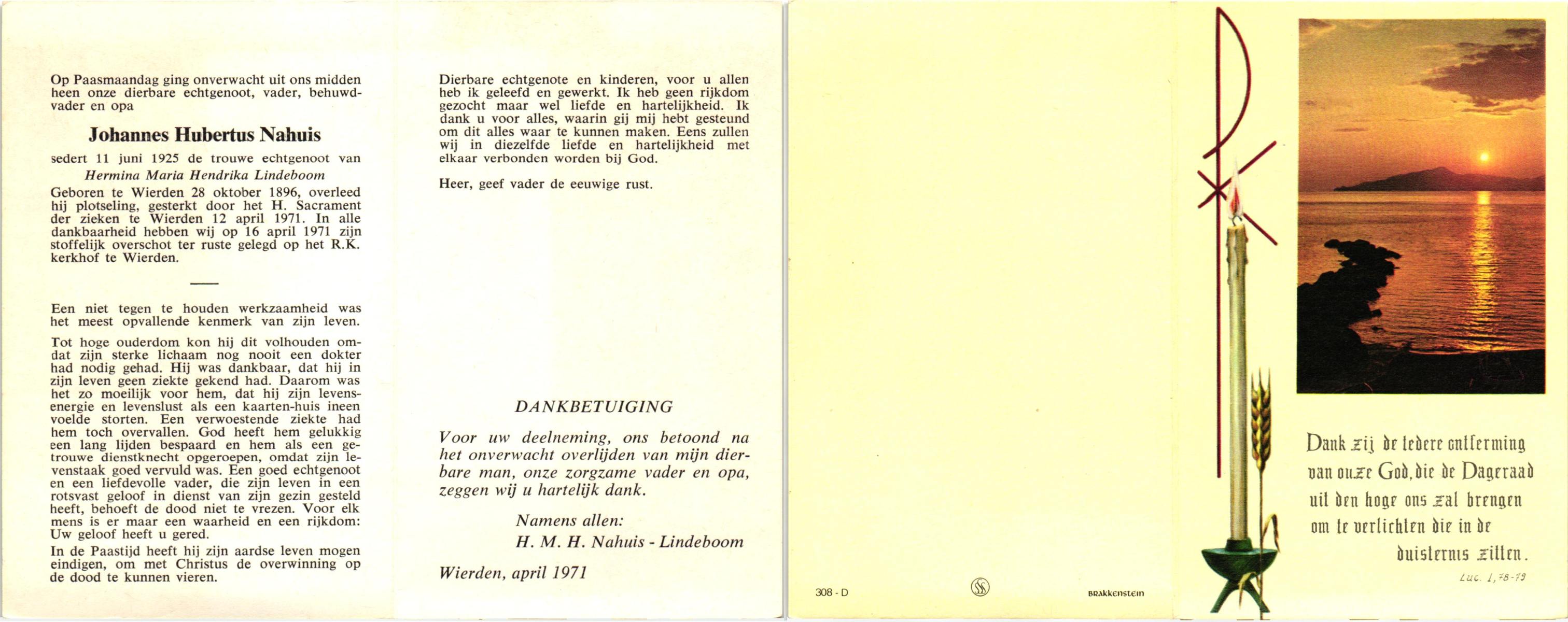 NAHUIS, Johannes Hubertus, geboren op 28-10-1896 te Wierden, overleden op 12-4-1971 te Wierden op 74-jarige leeftijd, begraven op 16-4-1971 te Wierden.