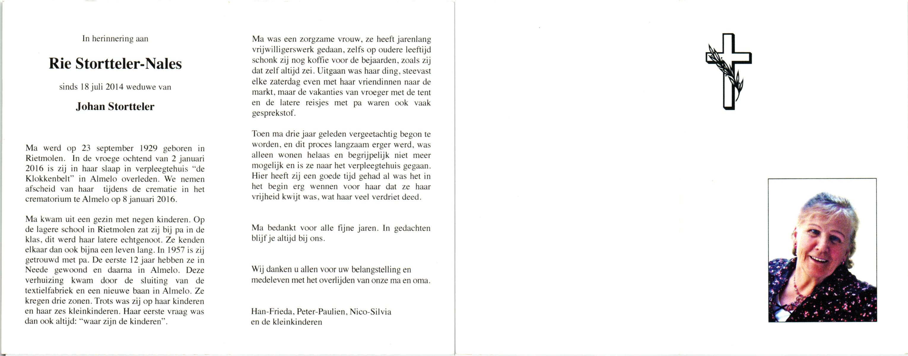 NALES, Rie, geboren op 23-9-1929 te Rietmolen, overleden op 2-1-2016 te Almelo op 86-jarige leeftijd, gecremeerd op 8-1-2016 te Almelo.