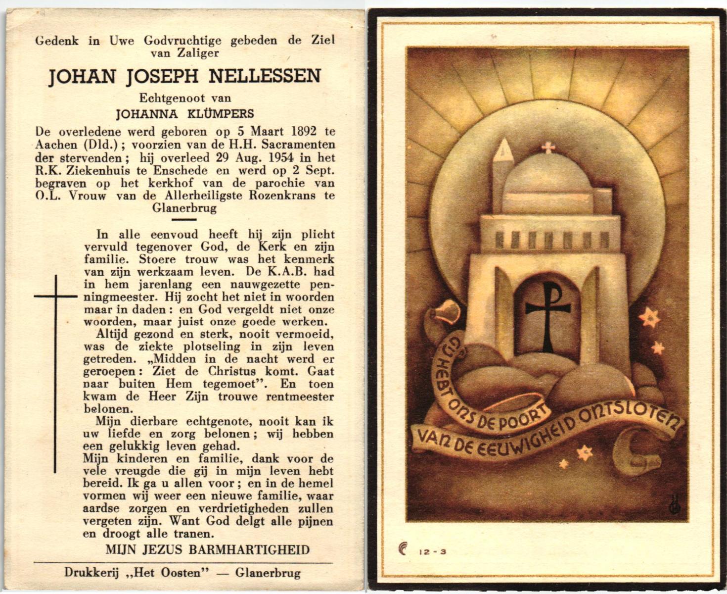 NELLESSEN, Johan Joseph, geboren op 05-03-1892 te Aschen, Dld, overleden op 29-8-1954 te Enschede, ziekenhuis op 62-jarige leeftijd, begraven op 2-9-1954 te Glanerbrug.