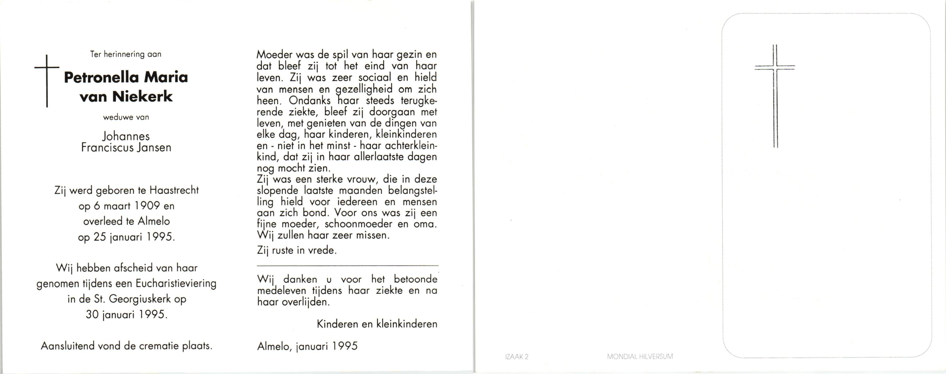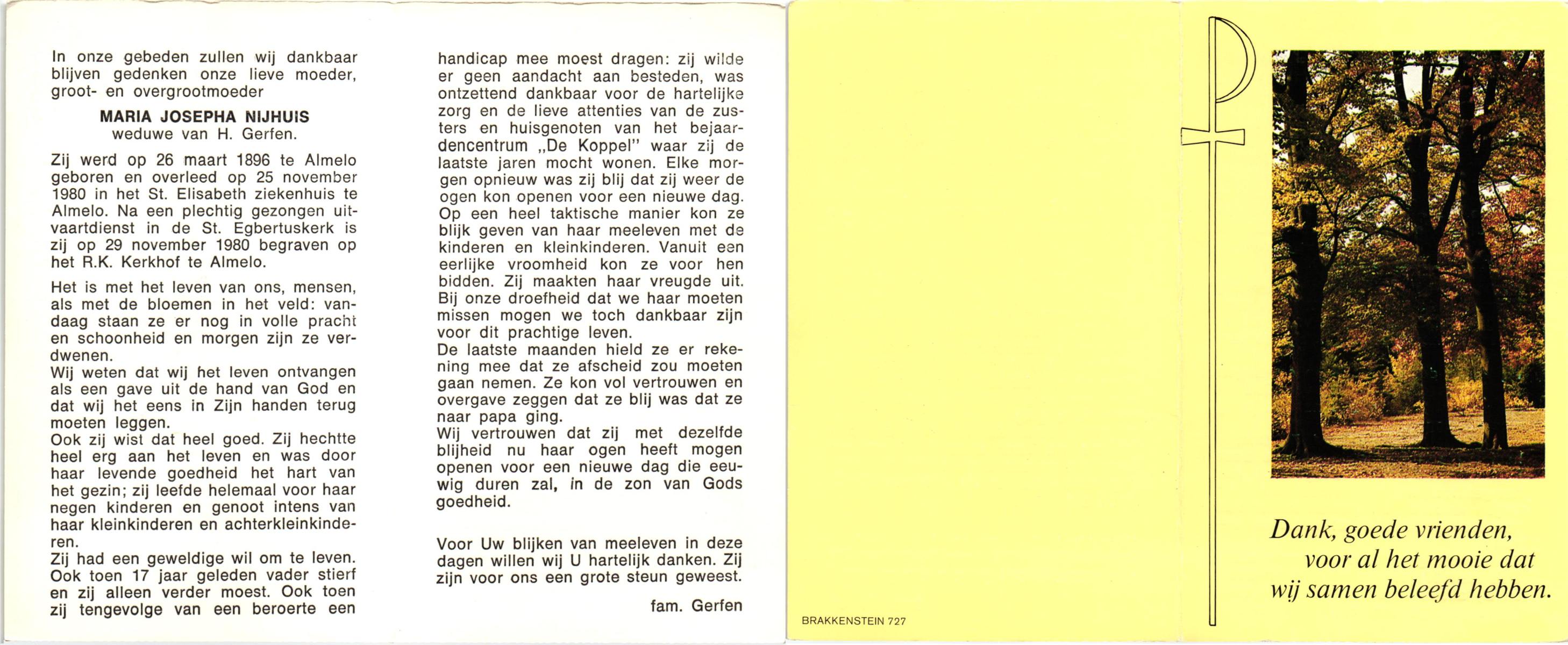 NIJHUIS, Maria Josepha, geboren op 26-03-1896 te Almelo, overleden op 25-11-1980 te Almelo, ziekenhuis op 84-jarige leeftijd, begraven op 29-11-1980 te Almelo.
