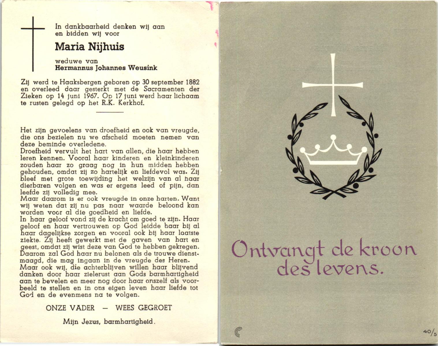NIJHUIS, Maria, geboren op 30-09-1882 te Haaksbergen, overleden op 14-6-1967 te Haaksbergen op 84-jarige leeftijd, begraven op 17-6-1967 te Haaksbergen.