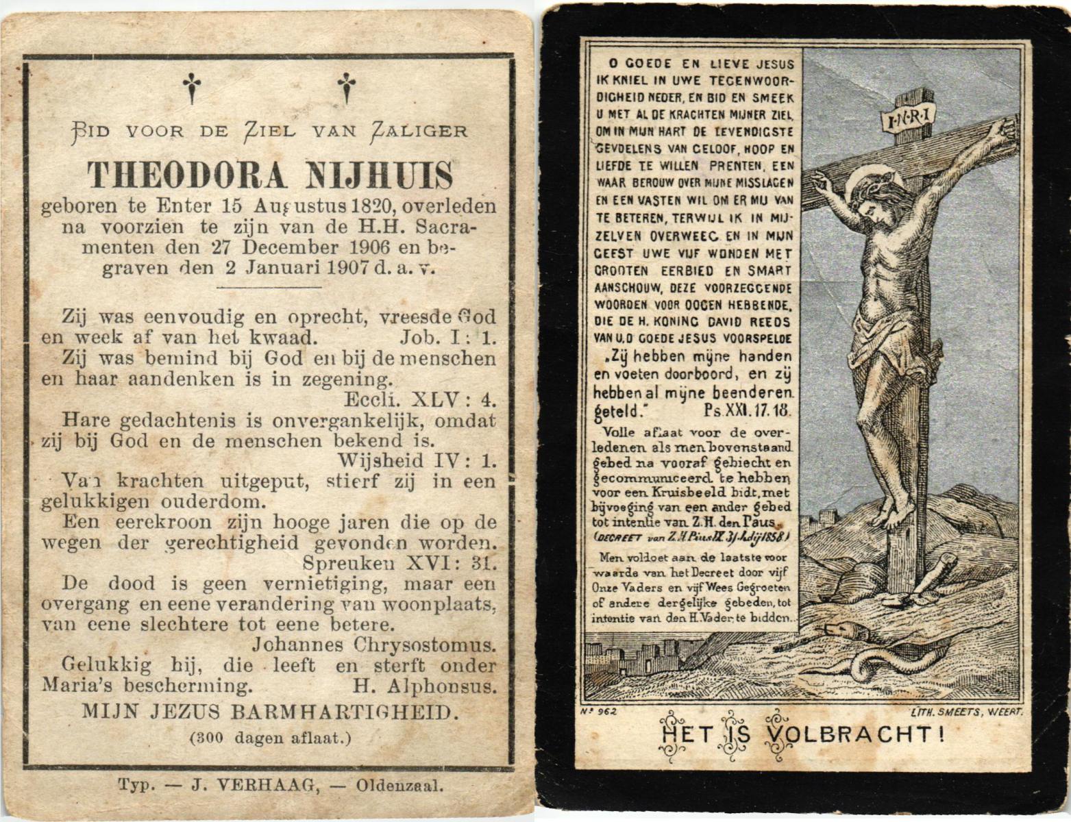 NIJHUIS, Theodora, geboren op 15-08-1820 te Wierden, Enter, overleden op 27-12-1906 te Wierden, Enter op 86-jarige leeftijd, begraven op 20-1-1907 te Wierden, Enter.