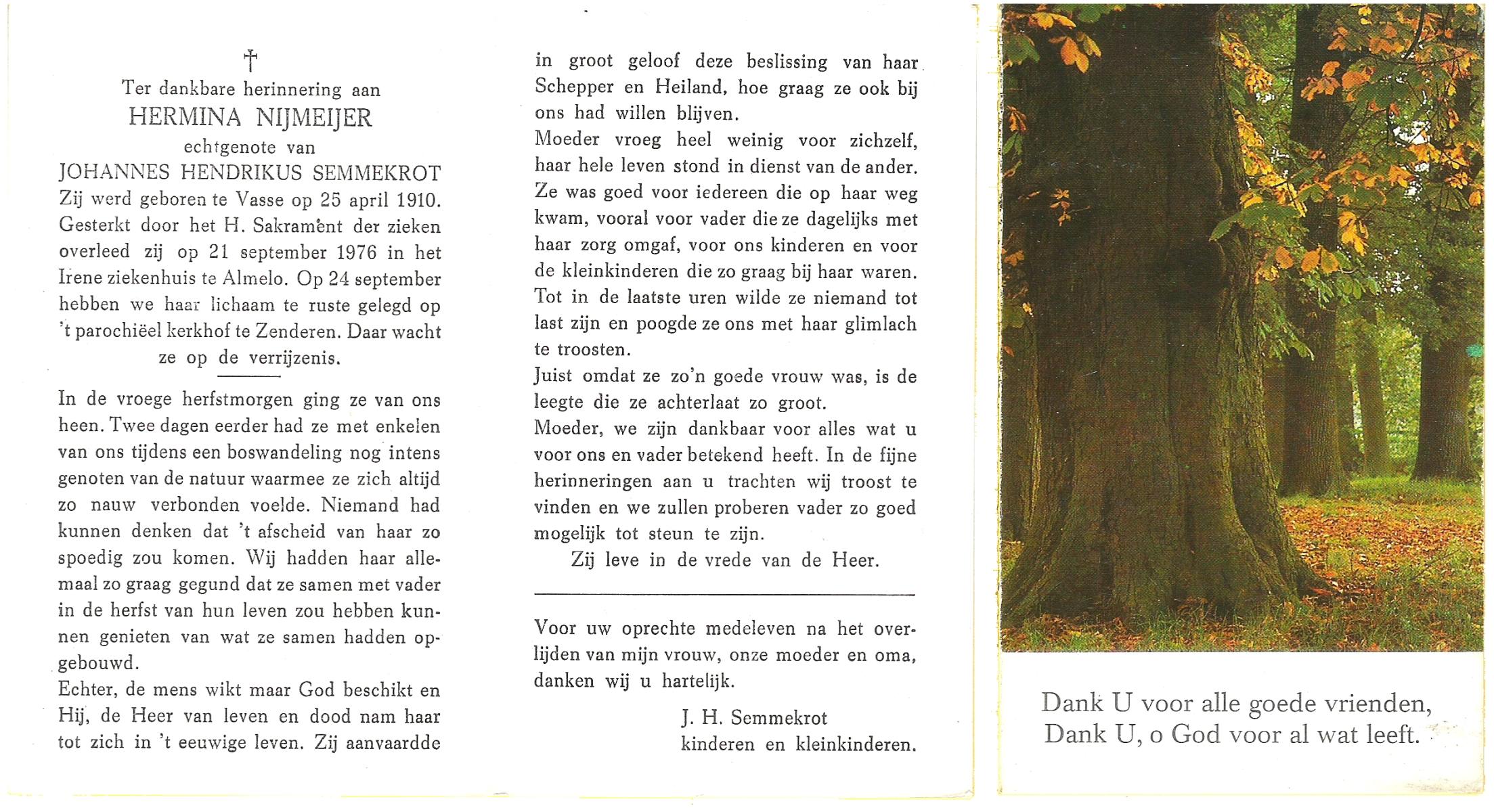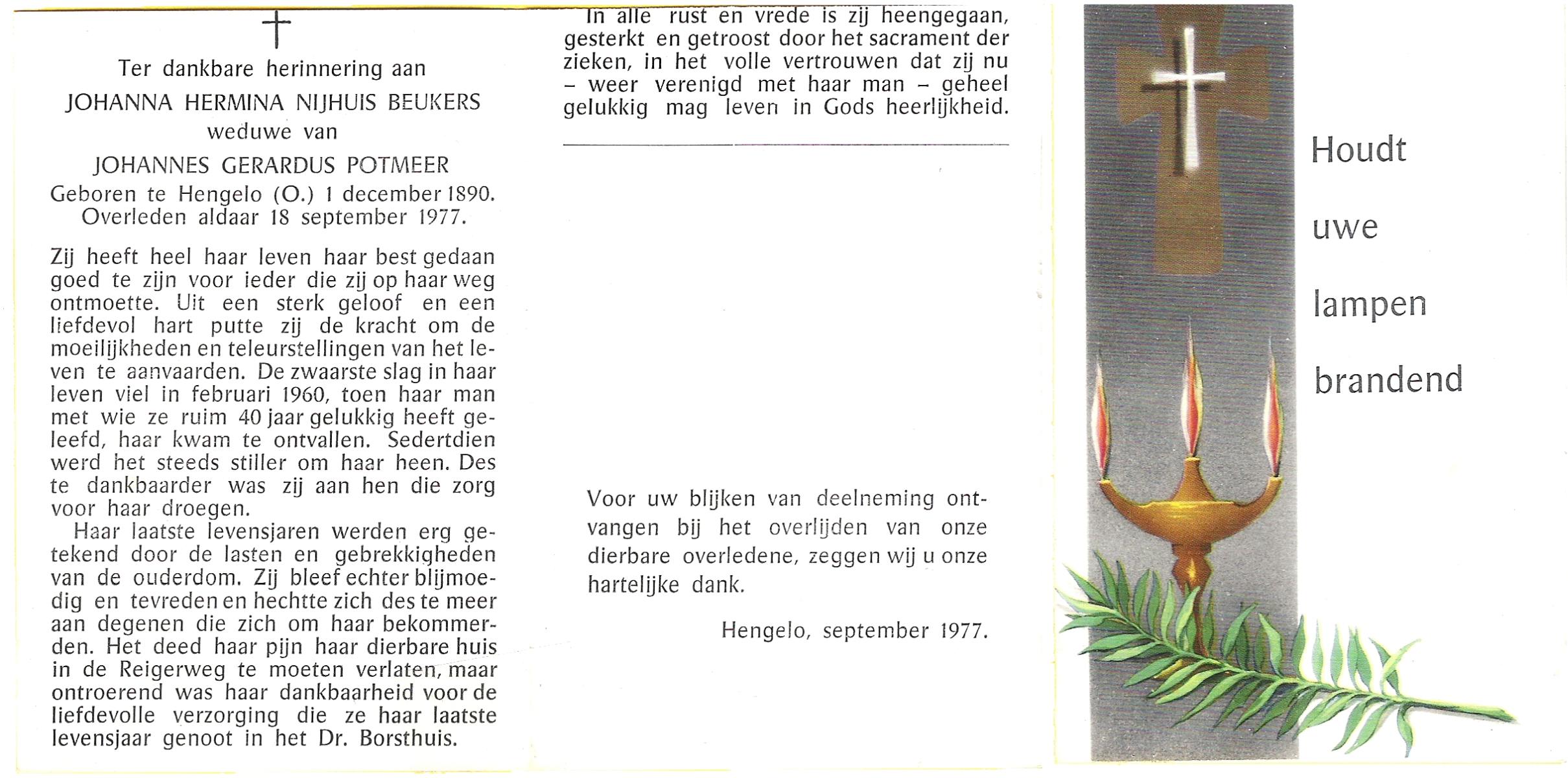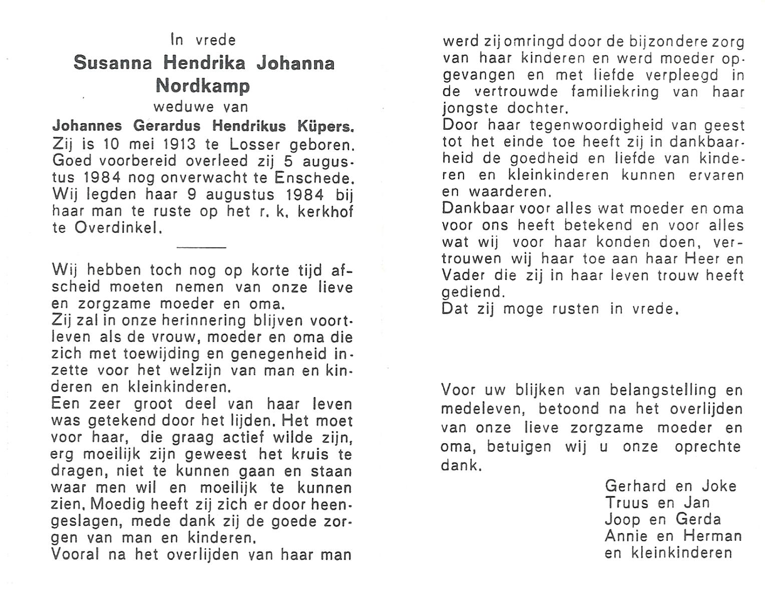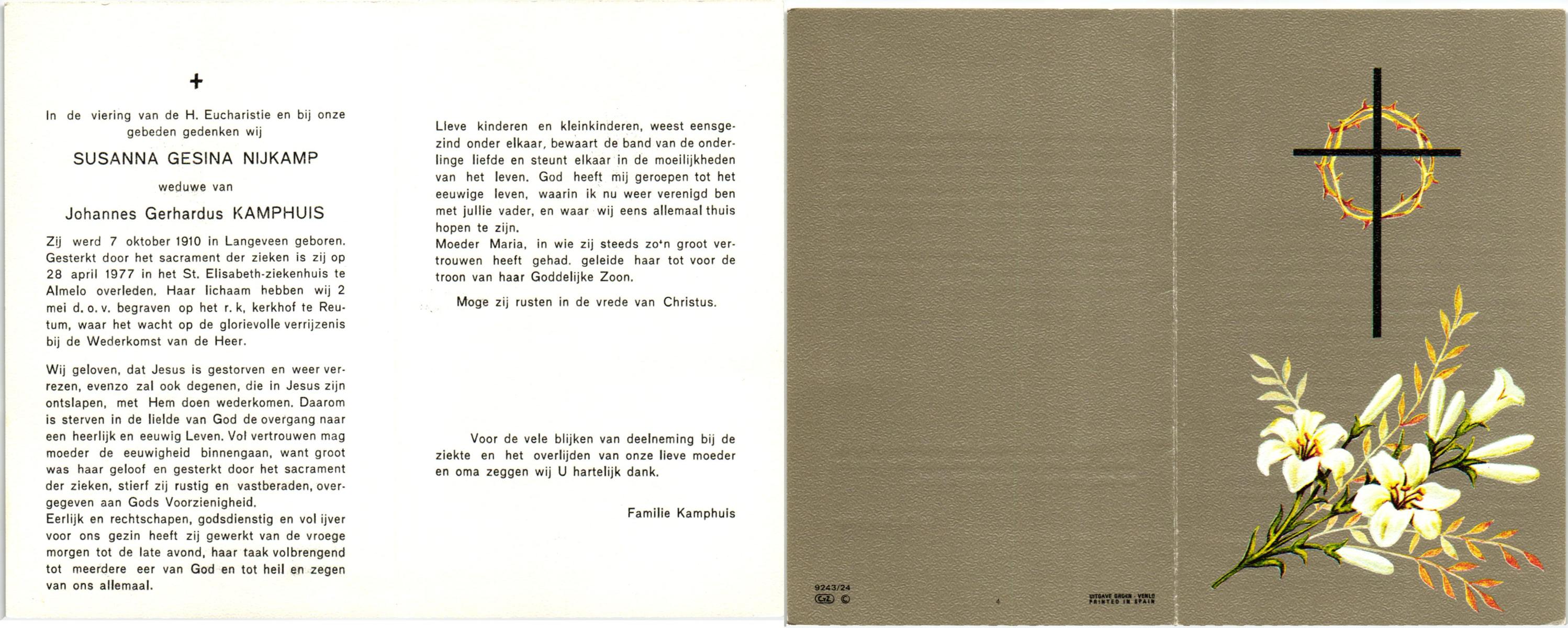 NIJKAMP, Susanna Gesina, geboren op 7-10-1910 te Langeveen, overleden op 28-4-1977 te Almelo, ziekenhuis op 66-jarige leeftijd, begraven op 2-5-1977 te Reutum.