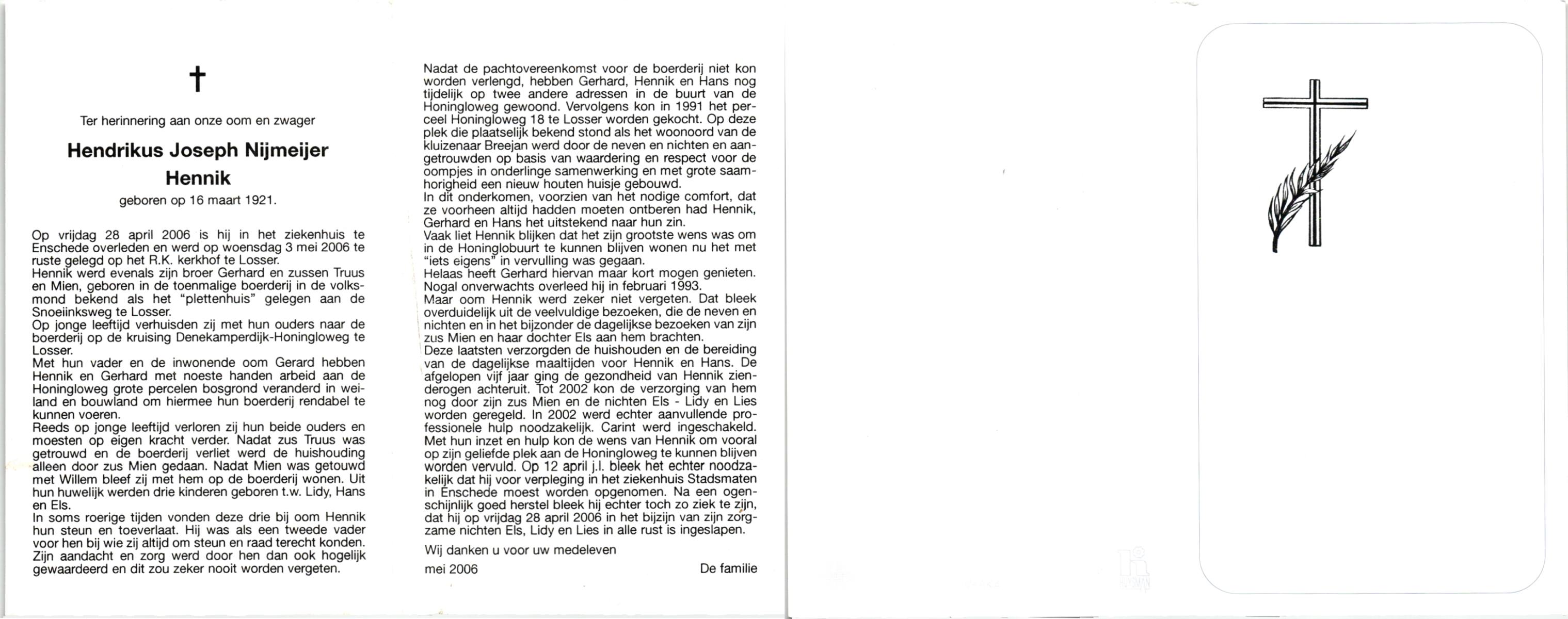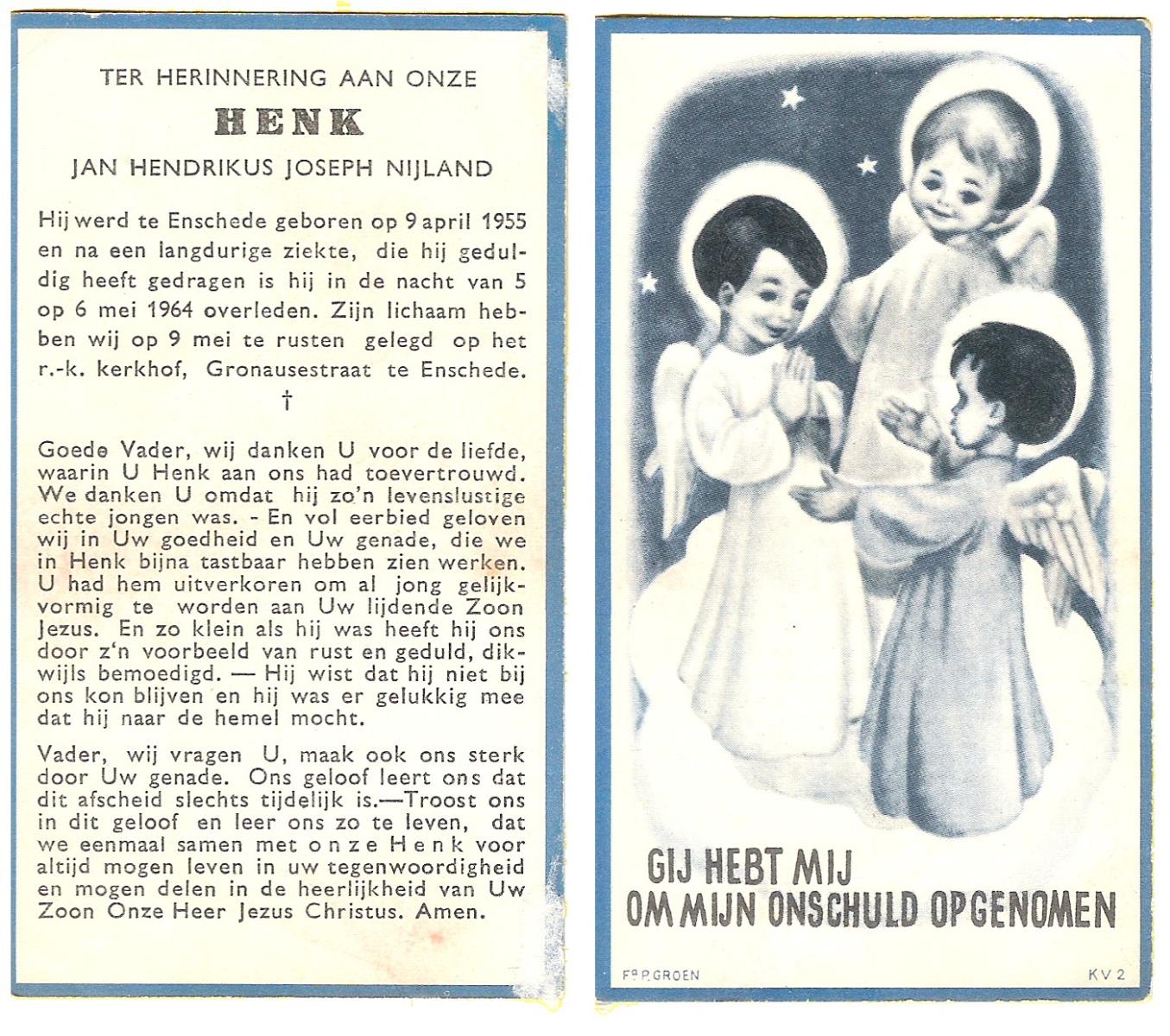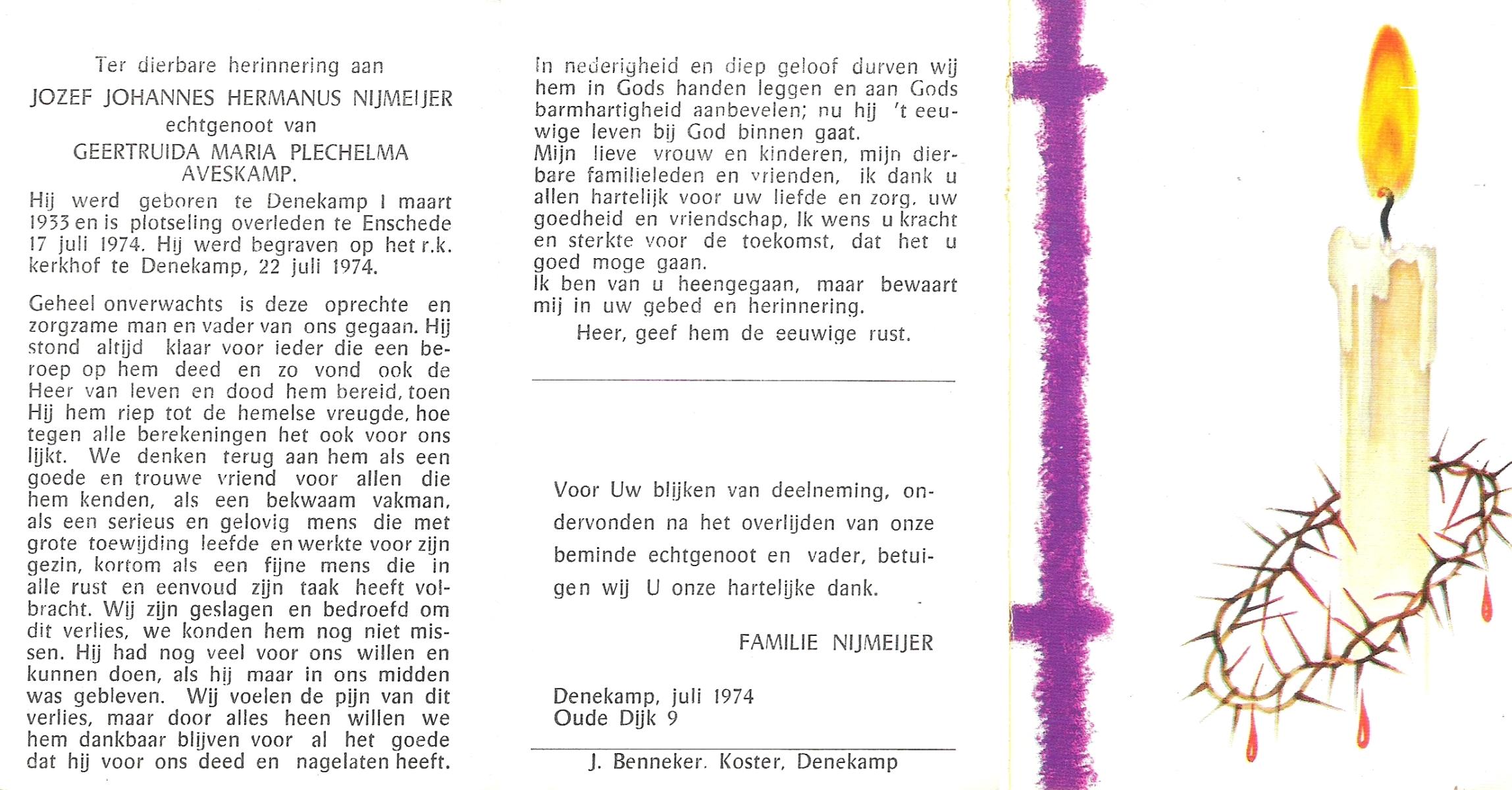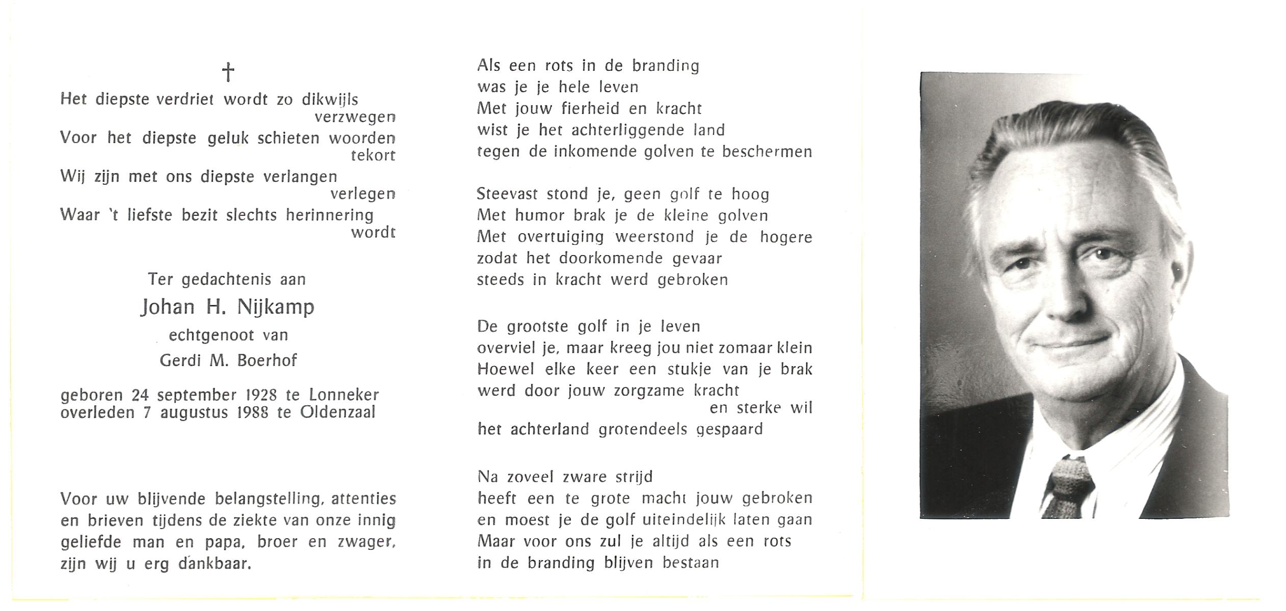 NIJKAMP, Johan H., geboren op 24-9-1928 te Lonneker, overleden op 7-8-1988 te Oldenzaal op 59-jarige leeftijd.
