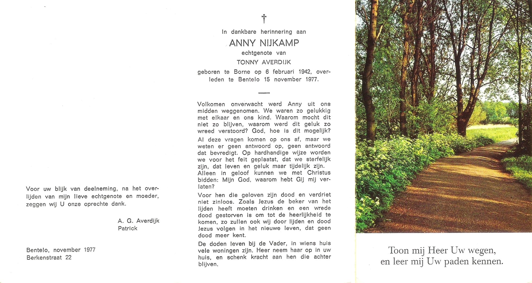 NIJKAMP, Anny, geboren op 6-2-1942 te Borne, overleden op 15-11-1977 te Bentelo op 35-jarige leeftijd.