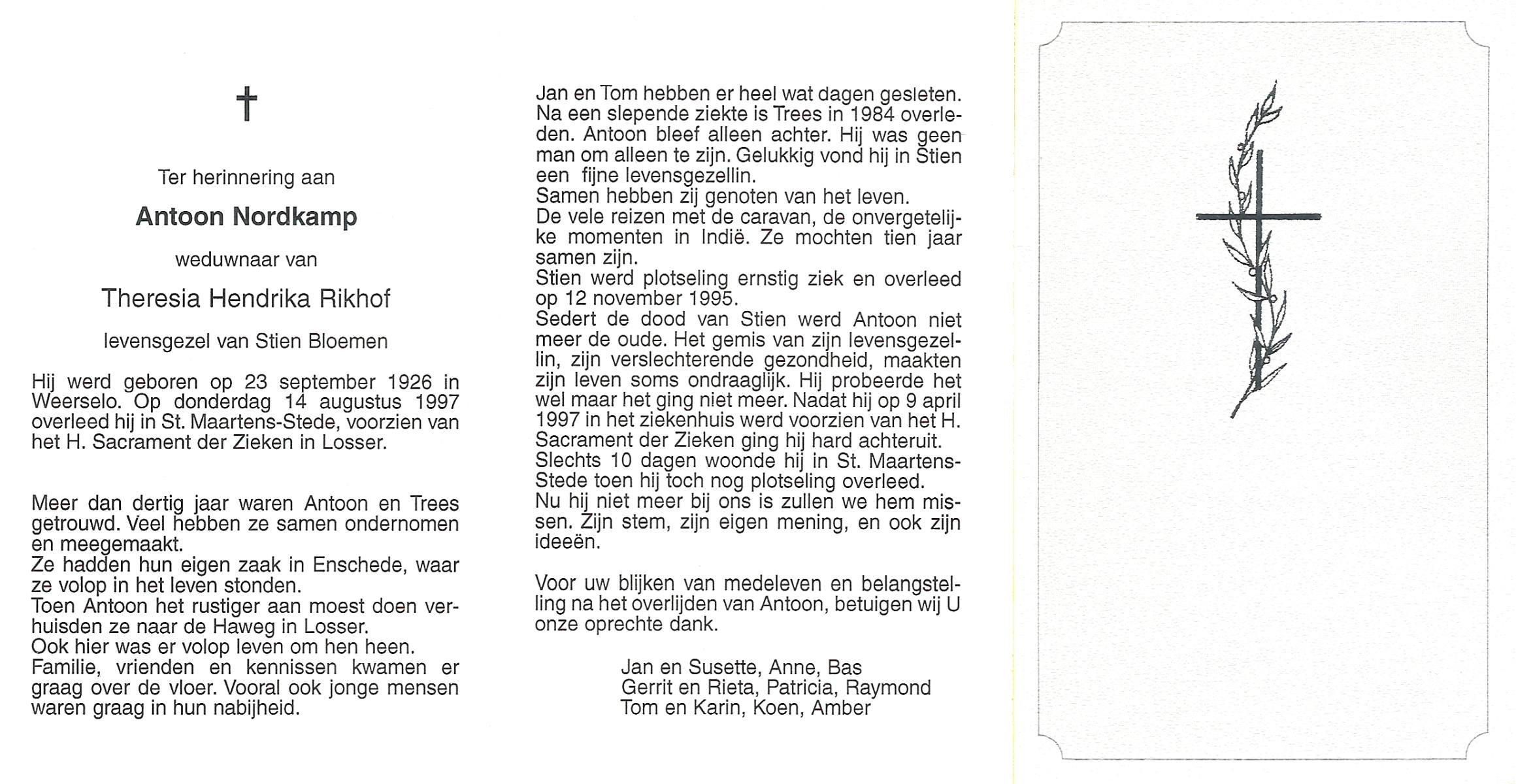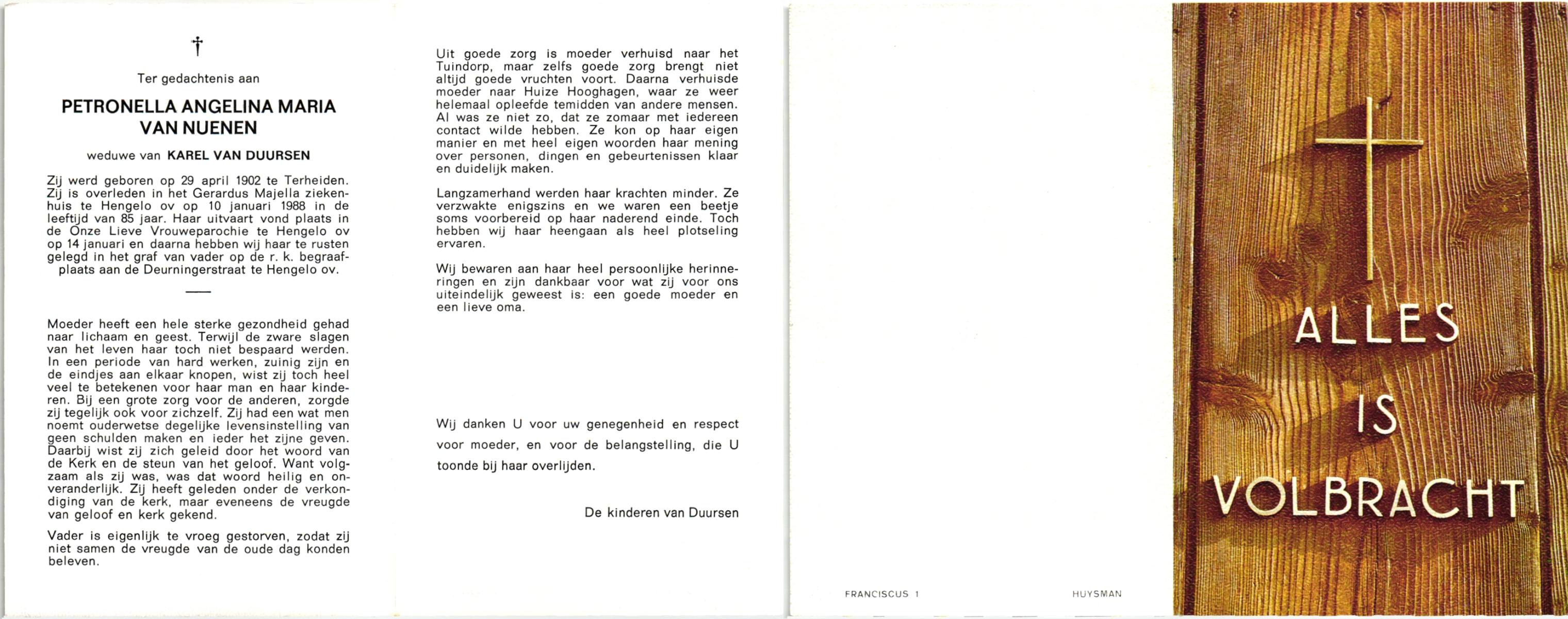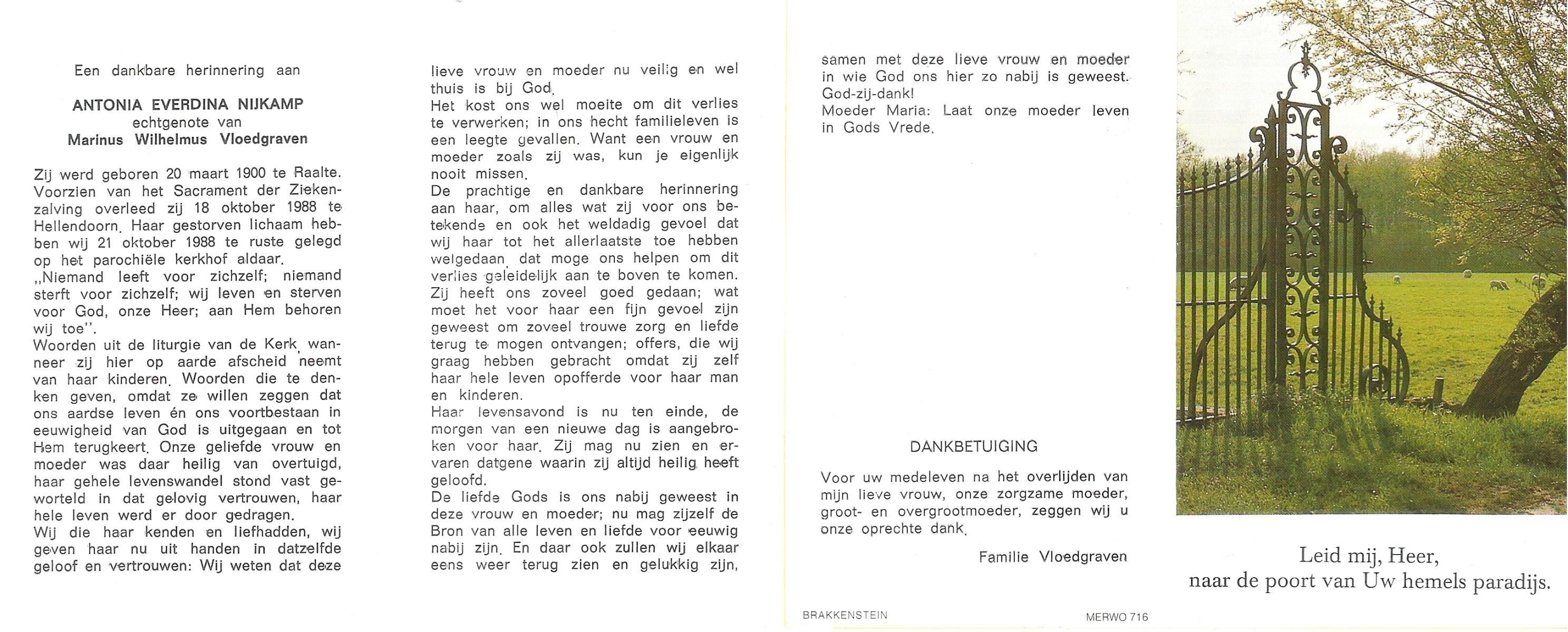 NIJKAMP, Antonia Everdina, geboren op 20-3-1900 te Raalte, overleden op 18-10-1988 te Hellendoorn op 88-jarige leeftijd, begraven op 21-10-1988 te Hellendoorn.