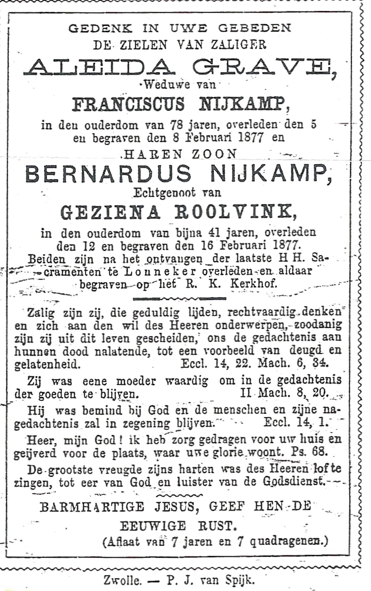 NIJKAMP, Bernardus, overleden op 12-02-1877 te Lonneker op 40-jarige leeftijd, begraven op 16-02-1877 te Lonneker.