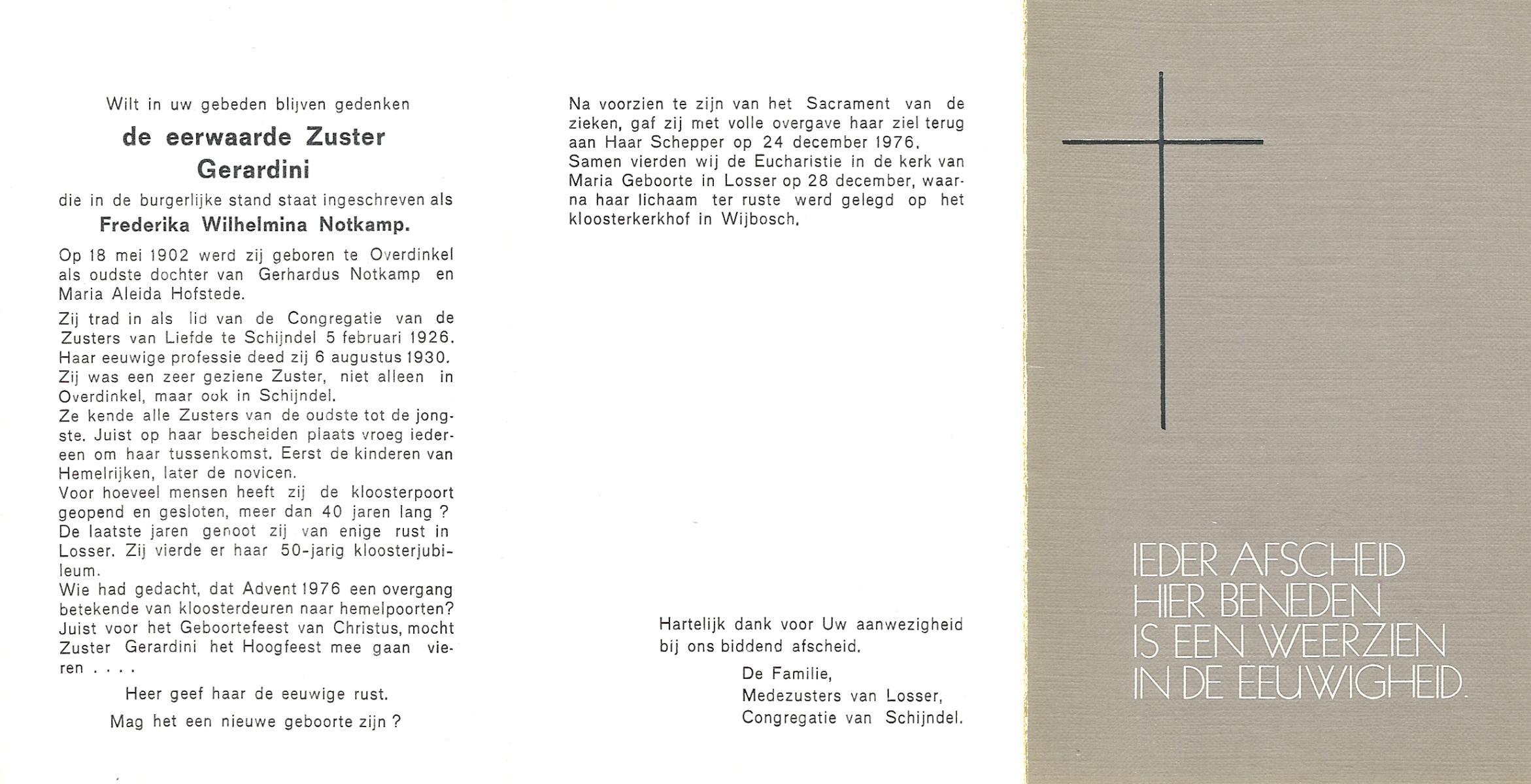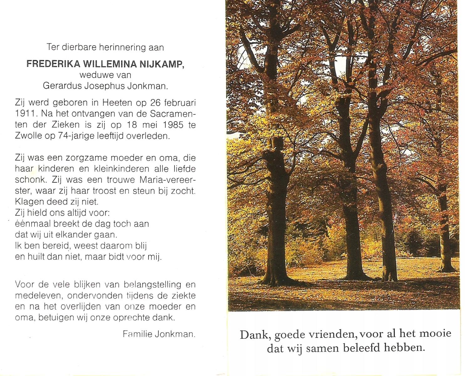 NIJKAMP, Frederika Willemina, geboren op 26-2-1911 te Heeten, overleden op 18-5-1985 te Zwolle op 74-jarige leeftijd.