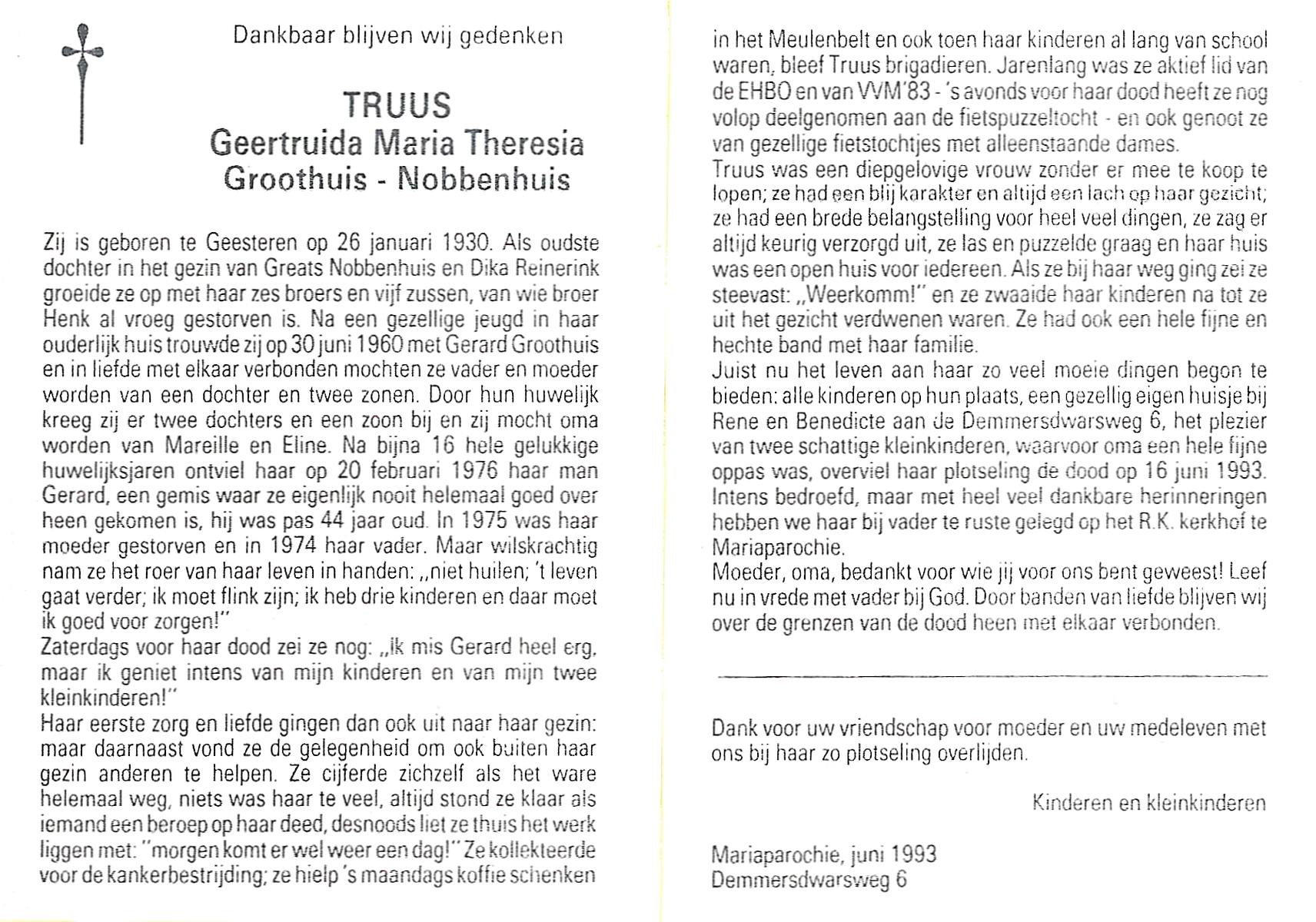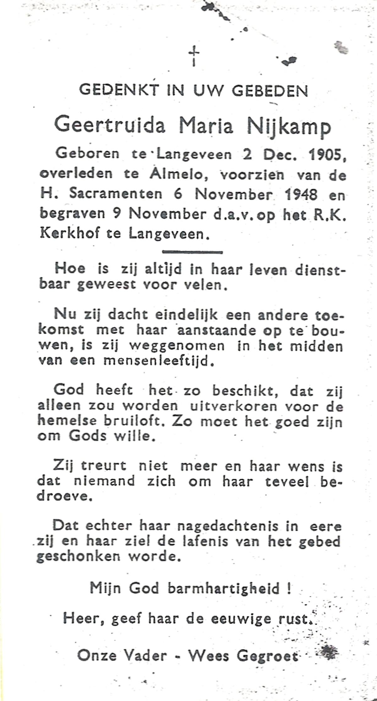 NIJKAMP, Geertruida Maria, geboren op 2-12-1905 te Langeveen, overleden op 6-11-1948 te Almelo op 42-jarige leeftijd, begraven op 9-11-1948 te Langeveen.