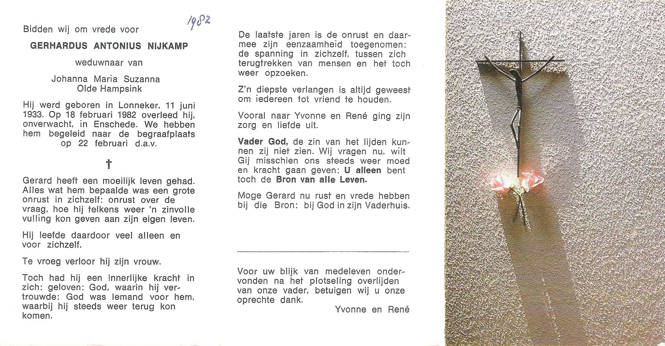 NIJKAMP, Gerhardus Antonius, geboren op 11-6-1933 te Lonneker, overleden op 18-2-1982 te Enschede op 48-jarige leeftijd, begraven op 22-2-1982 te Enschede.