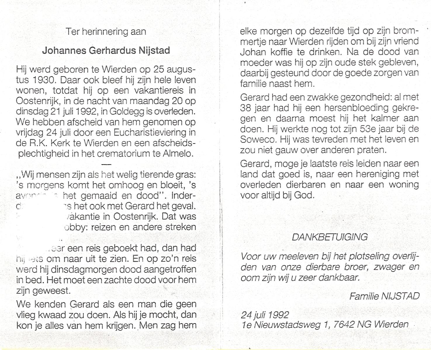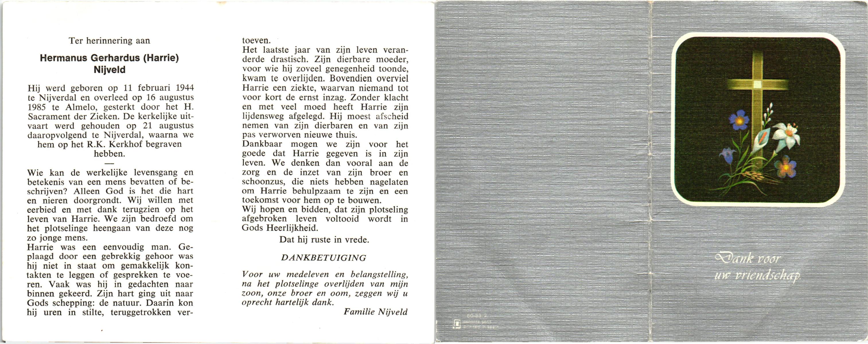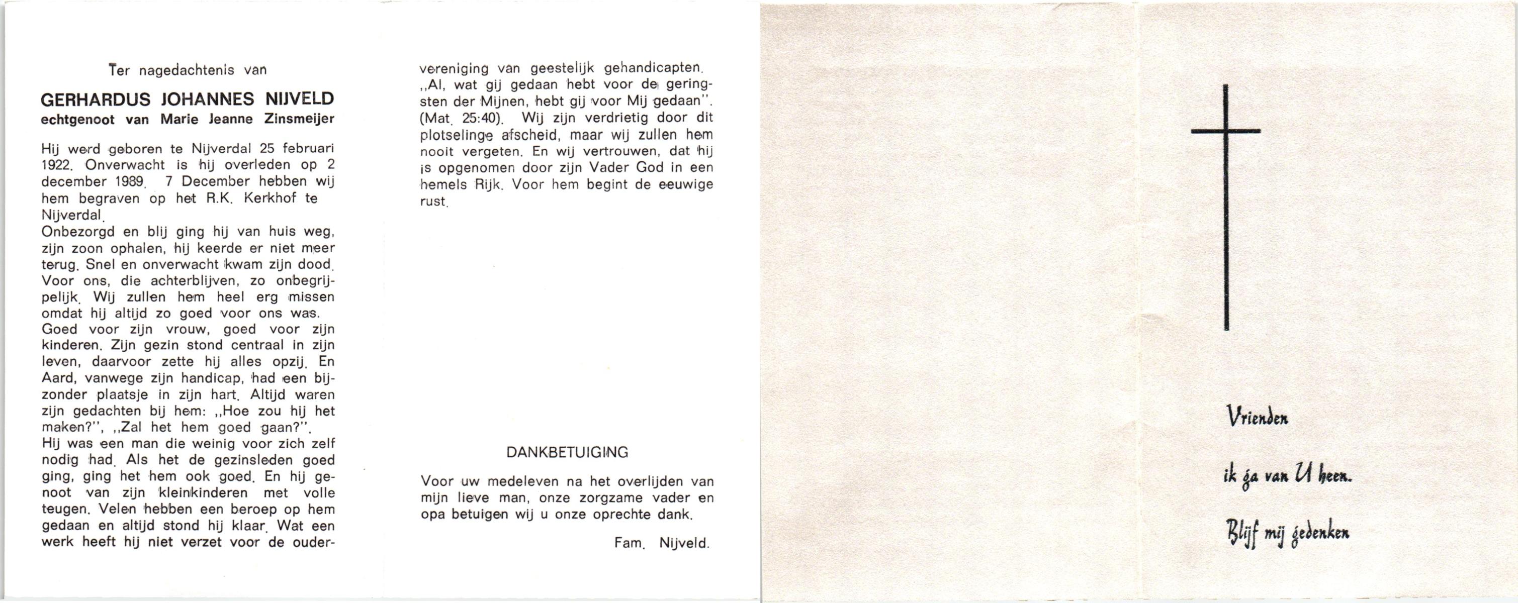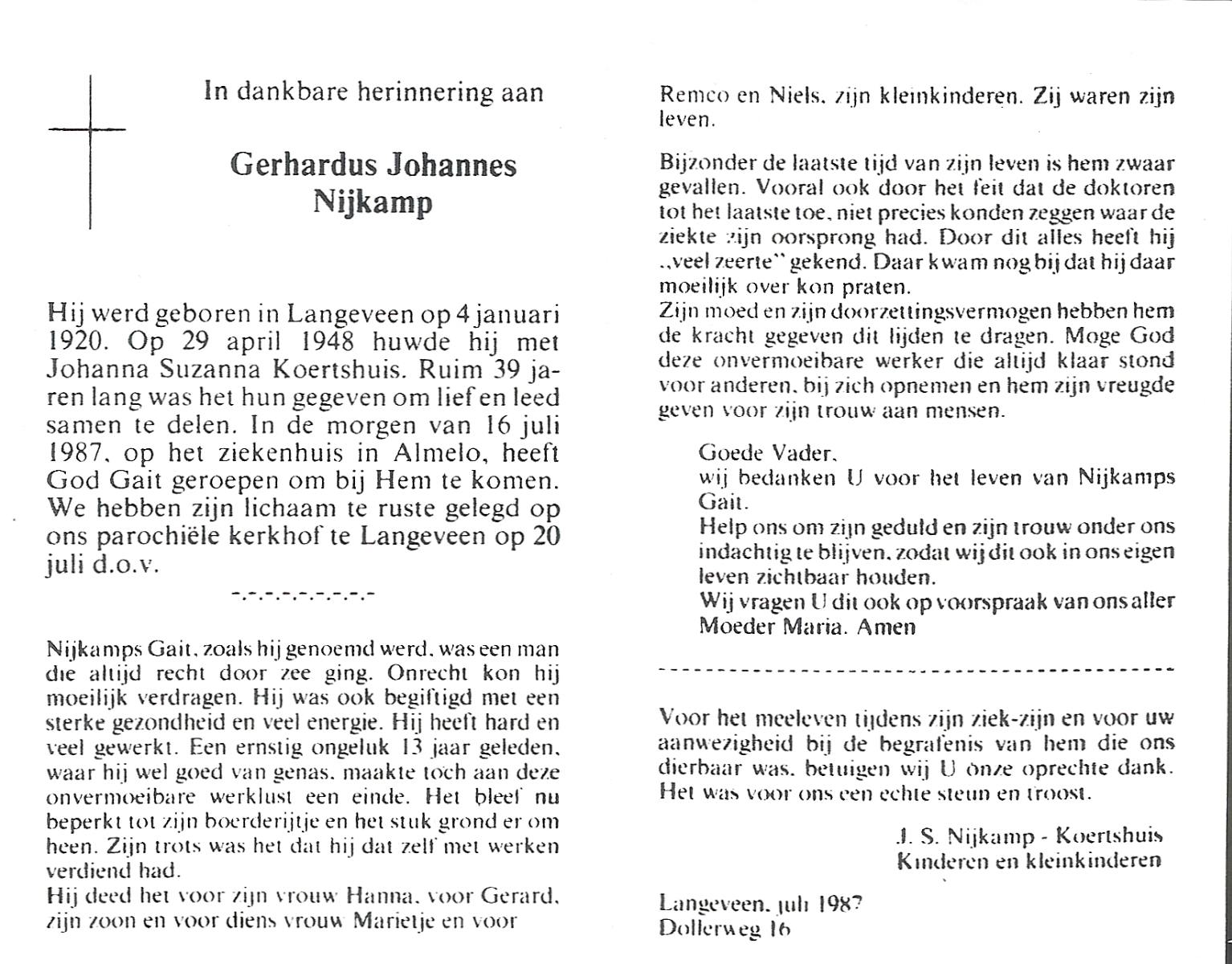 NIJKAMP, Gerhardus Johannes, geboren op 4-1-1920 te Langeveen, overleden op 16-7-1987 te Almelo op 67-jarige leeftijd, begraven op 20-7-1987 te Langeveen R.K.kerhof.