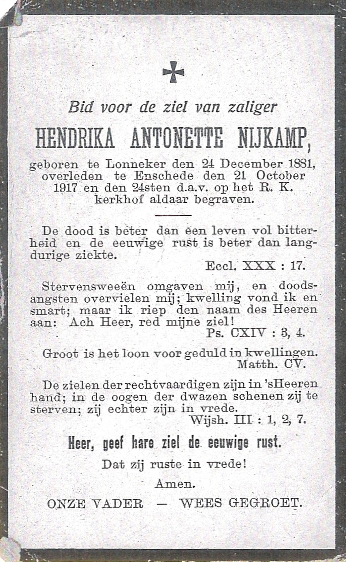NIJKAMP, Hendrika Antonette, geboren op 24-12-1881 te Lonneker, overleden op 21-10-1917 te Enschede op 35-jarige leeftijd, begraven op 24-10-1917 te Enschede.
