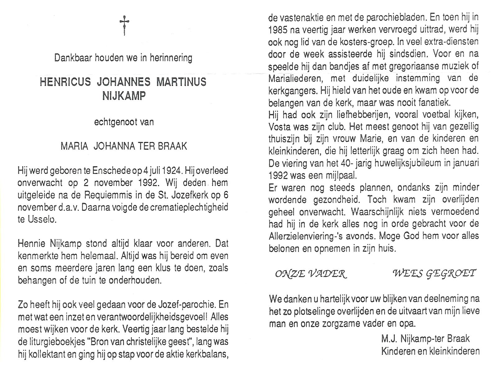 NIJKAMP, Henricus Johannes Martinus, geboren op 4-7-1924 te Enschede, overleden op 2-11-1992 op 68-jarige leeftijd, gecremeerd op 6-11-1992 te Usselo.