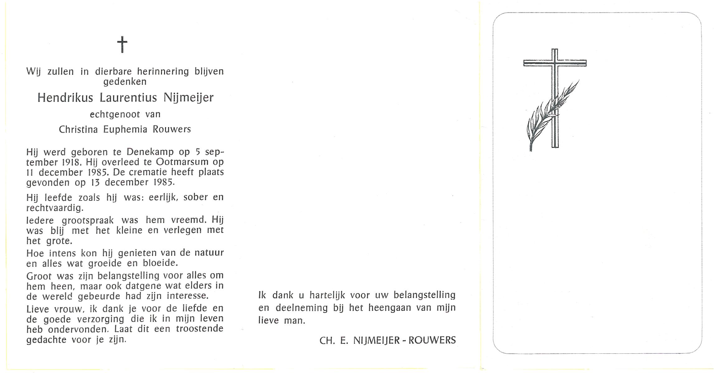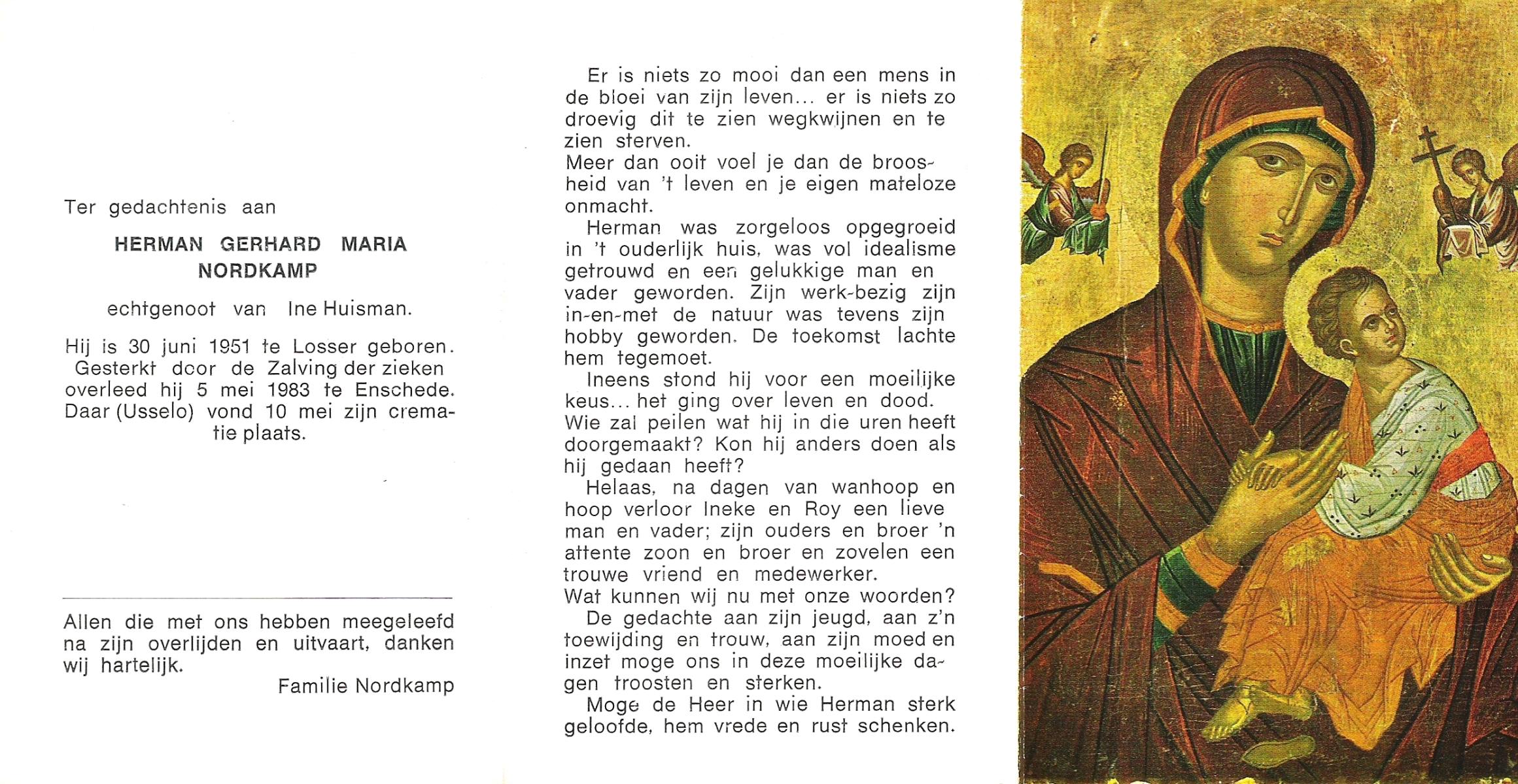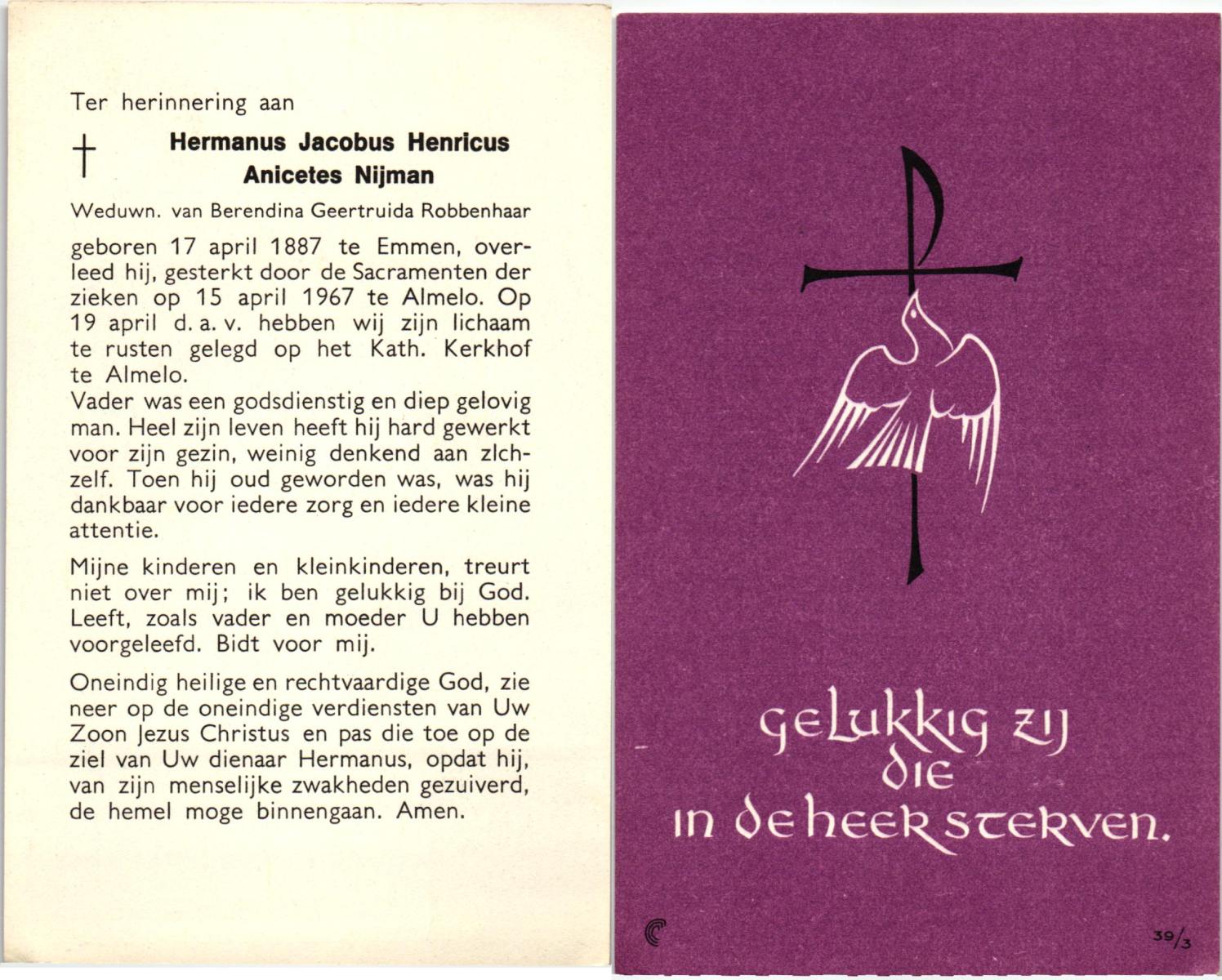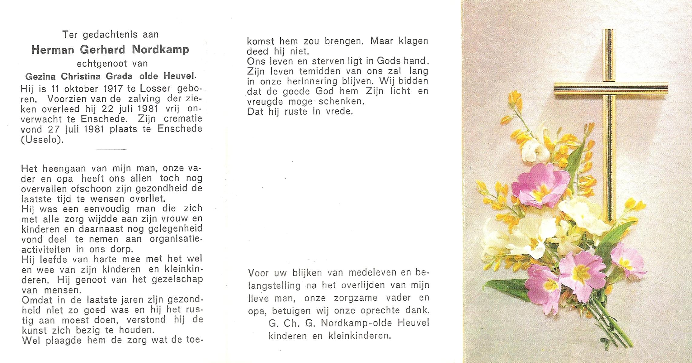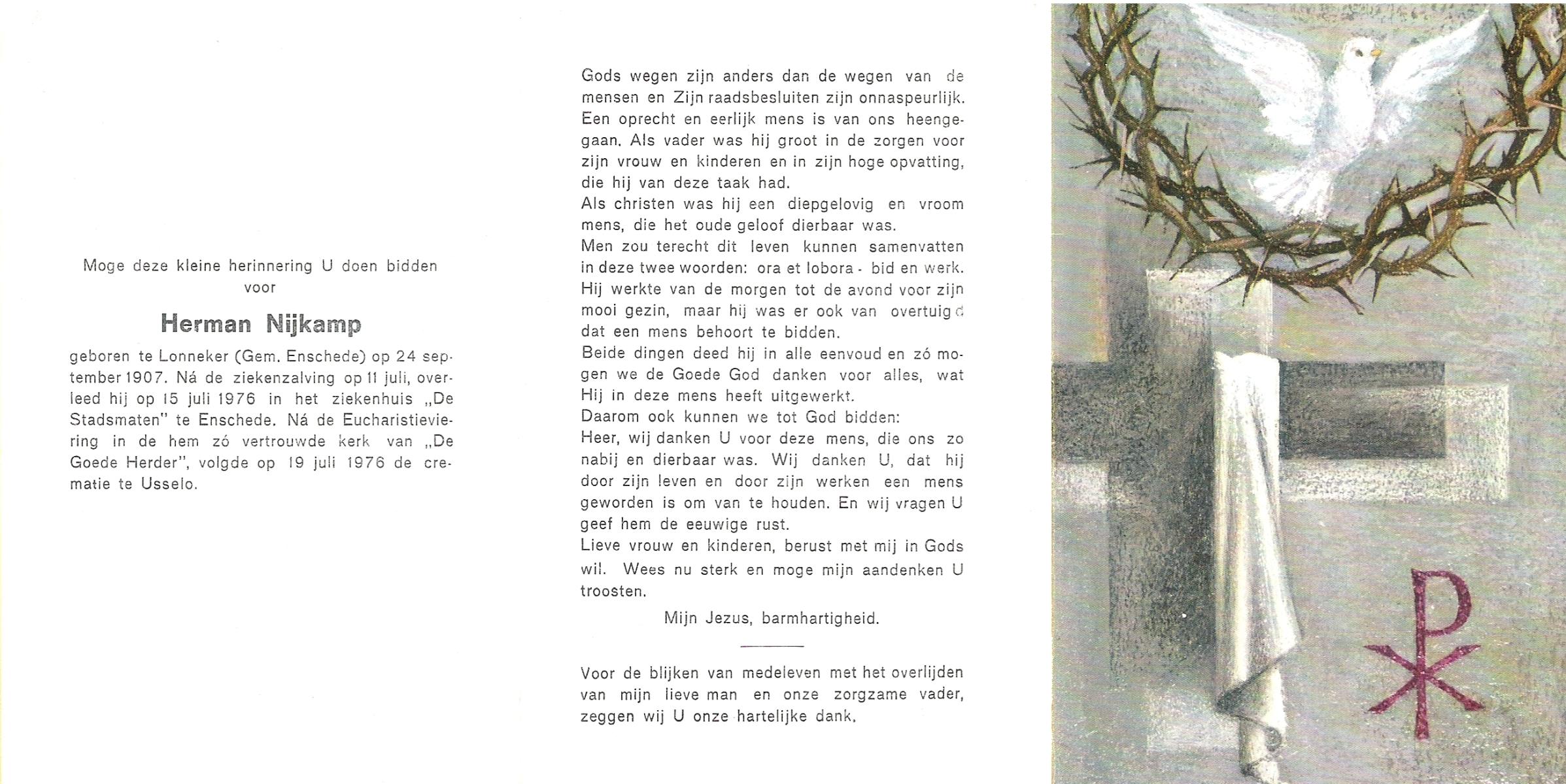 NIJKAMP, Herman, geboren op 24-9-1907 te Lonneker, overleden op 15-7-1976 te Enschede op 68-jarige leeftijd, gecremeerd op 19-7-1976 te Usselo.