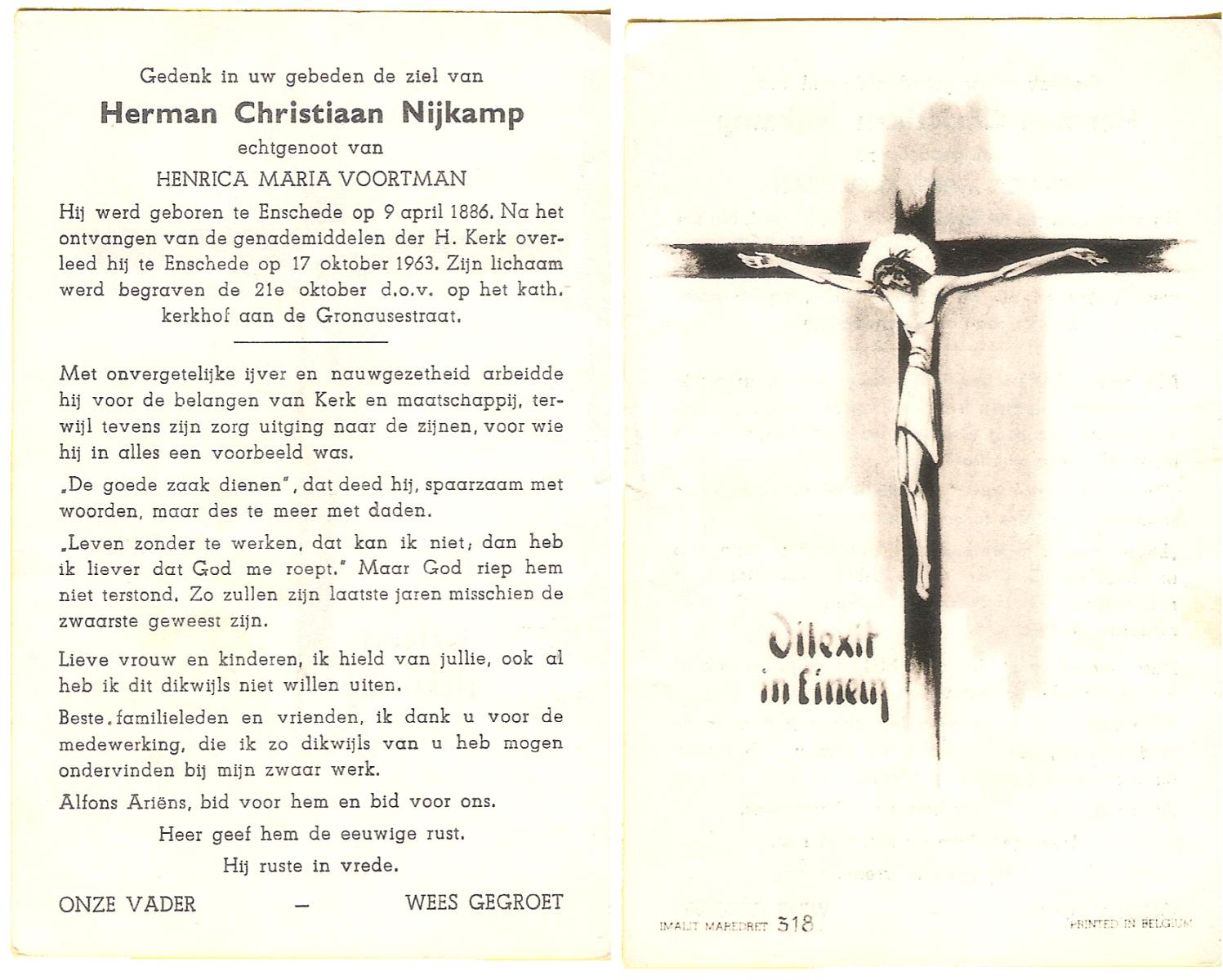 NIJKAMP, Herman Christiaan, geboren op 09-04-1886 te Enschede, overleden op 17-10-1963 te Enschede op 77-jarige leeftijd, begraven op 21-10-1963 te Enschede.