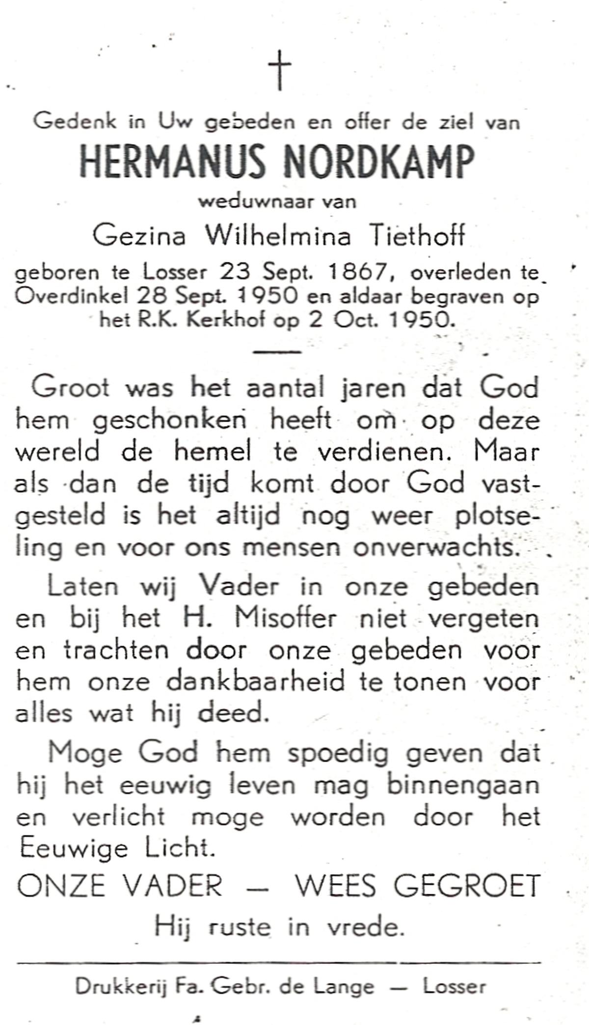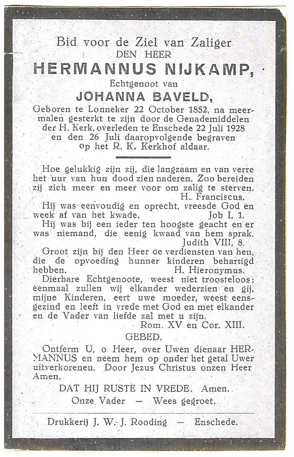NIJKAMP, Hermannus, geboren op 22-10-1852 te Lonneker, overleden op 22-7-1928 te Enschede op 75-jarige leeftijd, begraven op 26-7-1928 te Enschede.