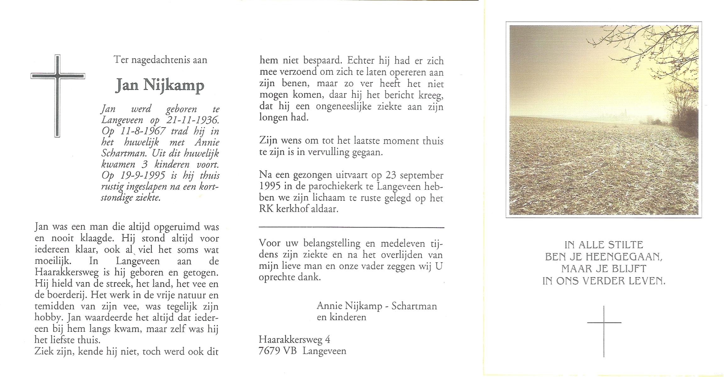 NIJKAMP, Jan, geboren op 21-11-1936 te Langeveen, overleden op 19-9-1995 te Langeveen op 58-jarige leeftijd, begraven op 23-9-1995 te Langeveen.