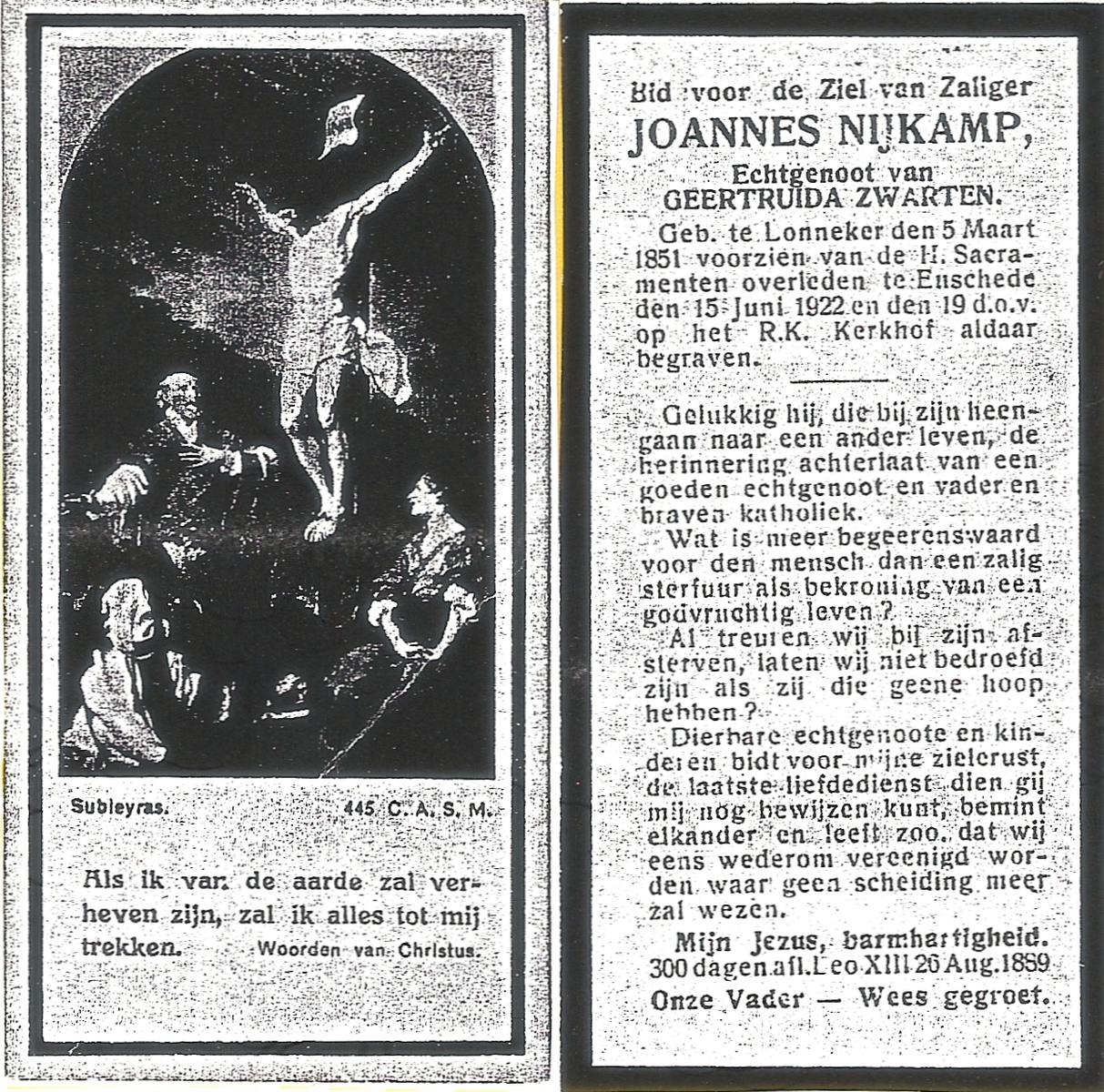 NIJKAMP, Joannes, geboren op 05-03-1851 te Lonneker, overleden op 15-6-1922 te Enschede op 71-jarige leeftijd, gecremeerd op 19-6-1922 te Enschede.