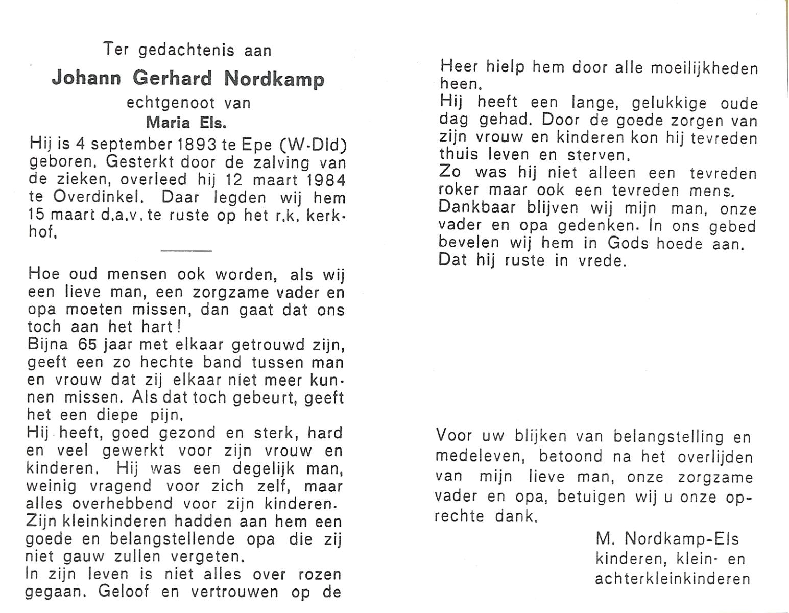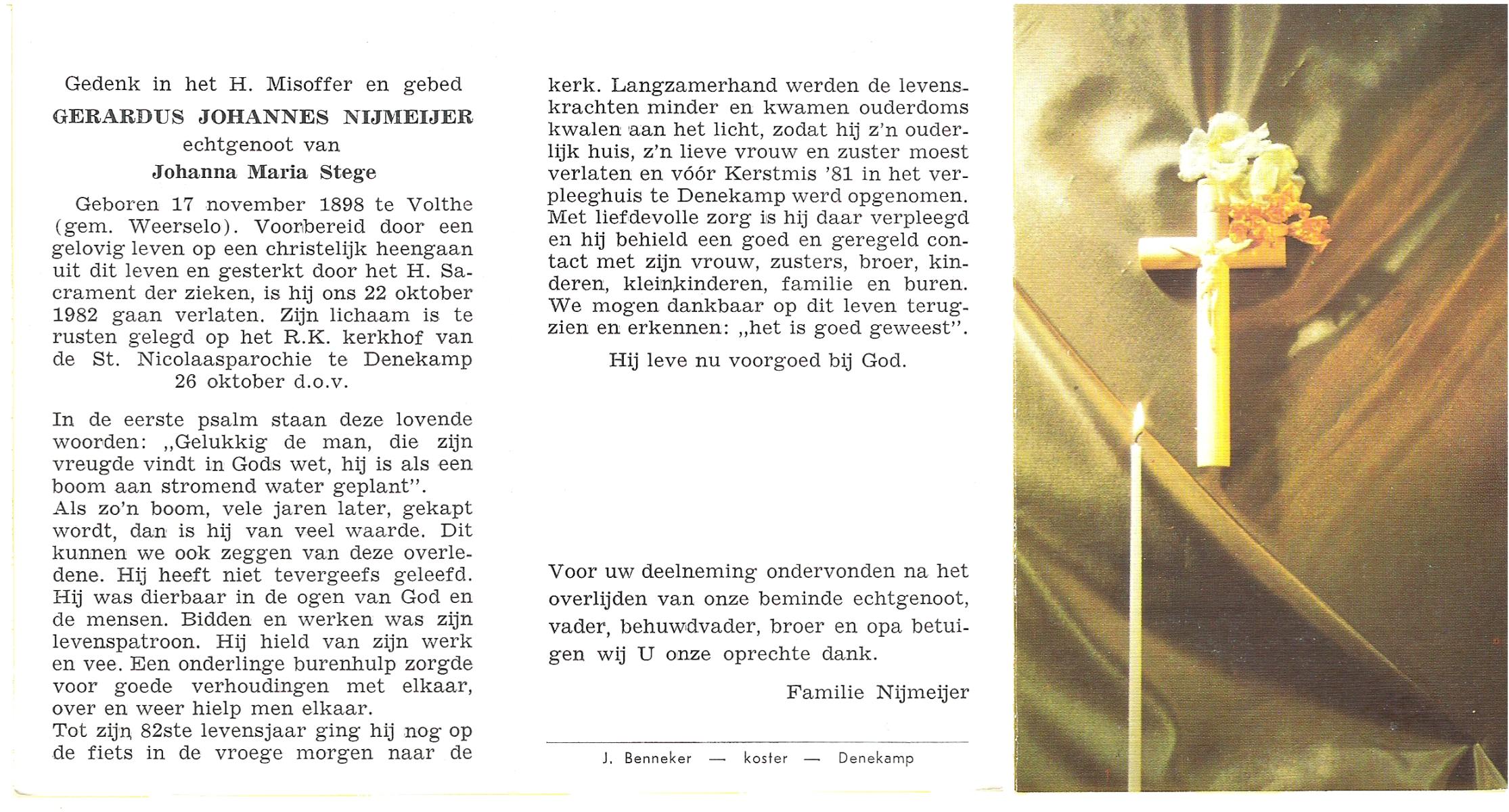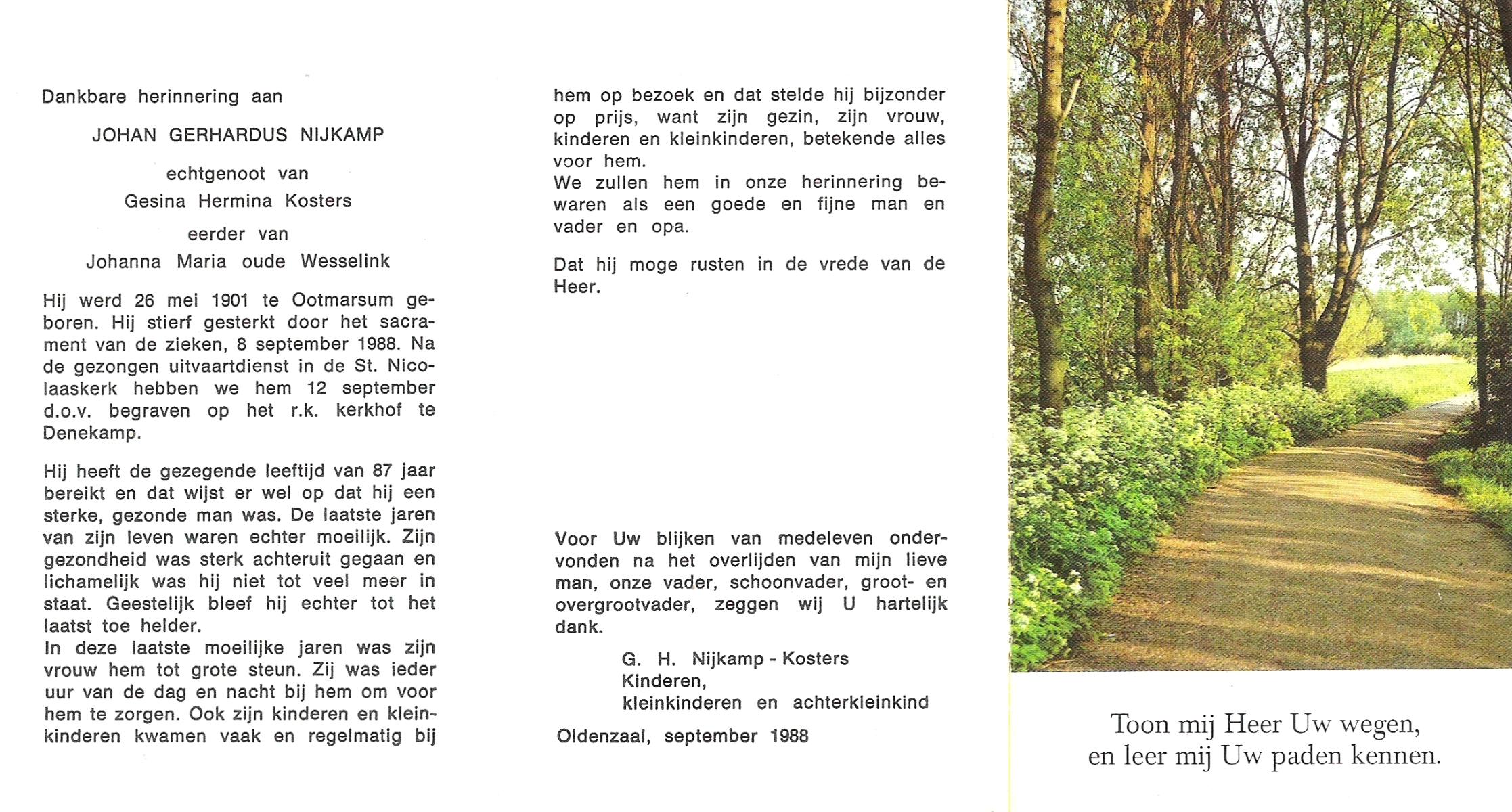 NIJKAMP, Johan Gerhardus, geboren op 26-5-1901 te Ootmarsum, overleden op 8-9-1988 op 87-jarige leeftijd, begraven op 12-9-1988 te Denekamp.