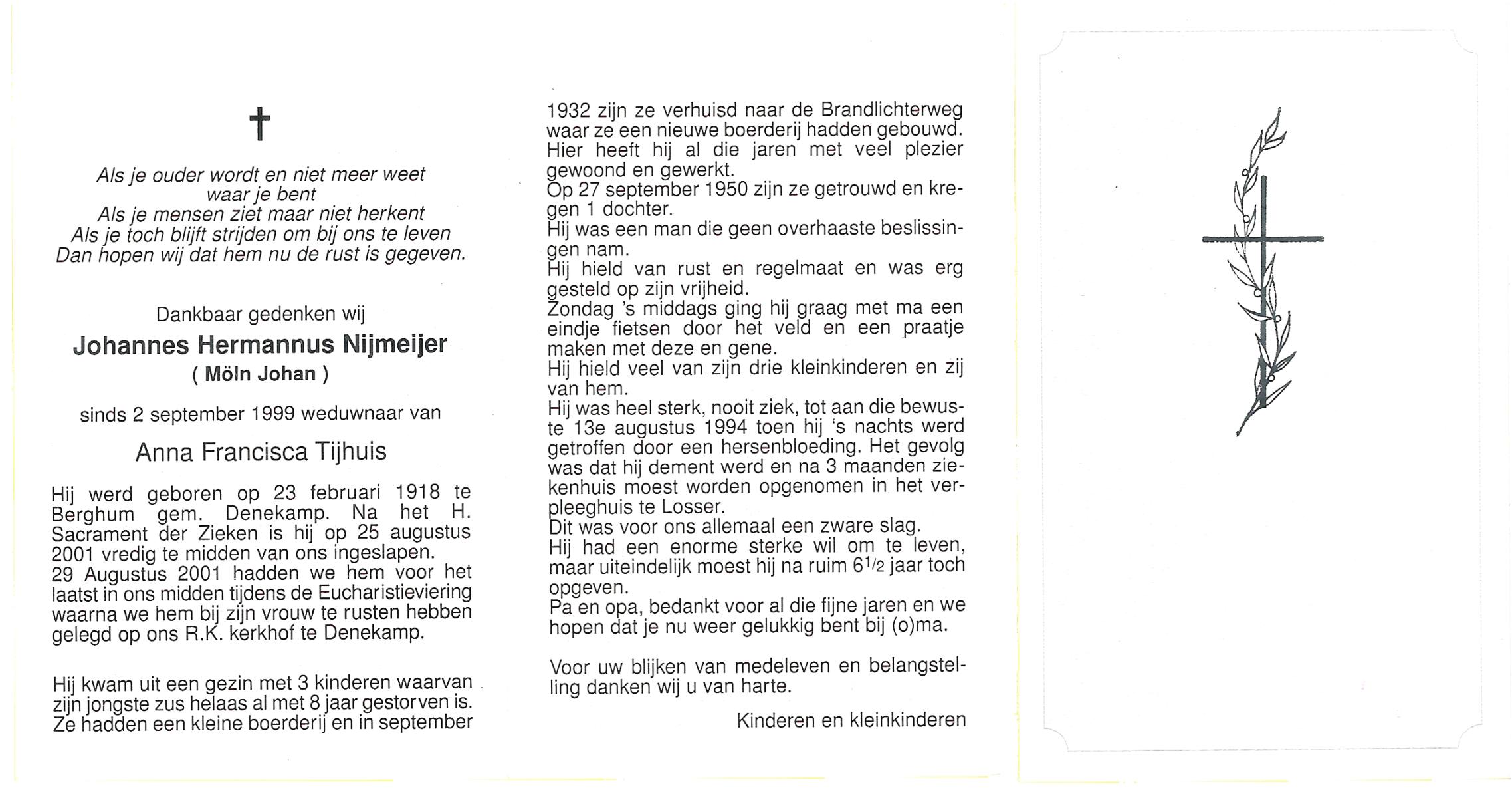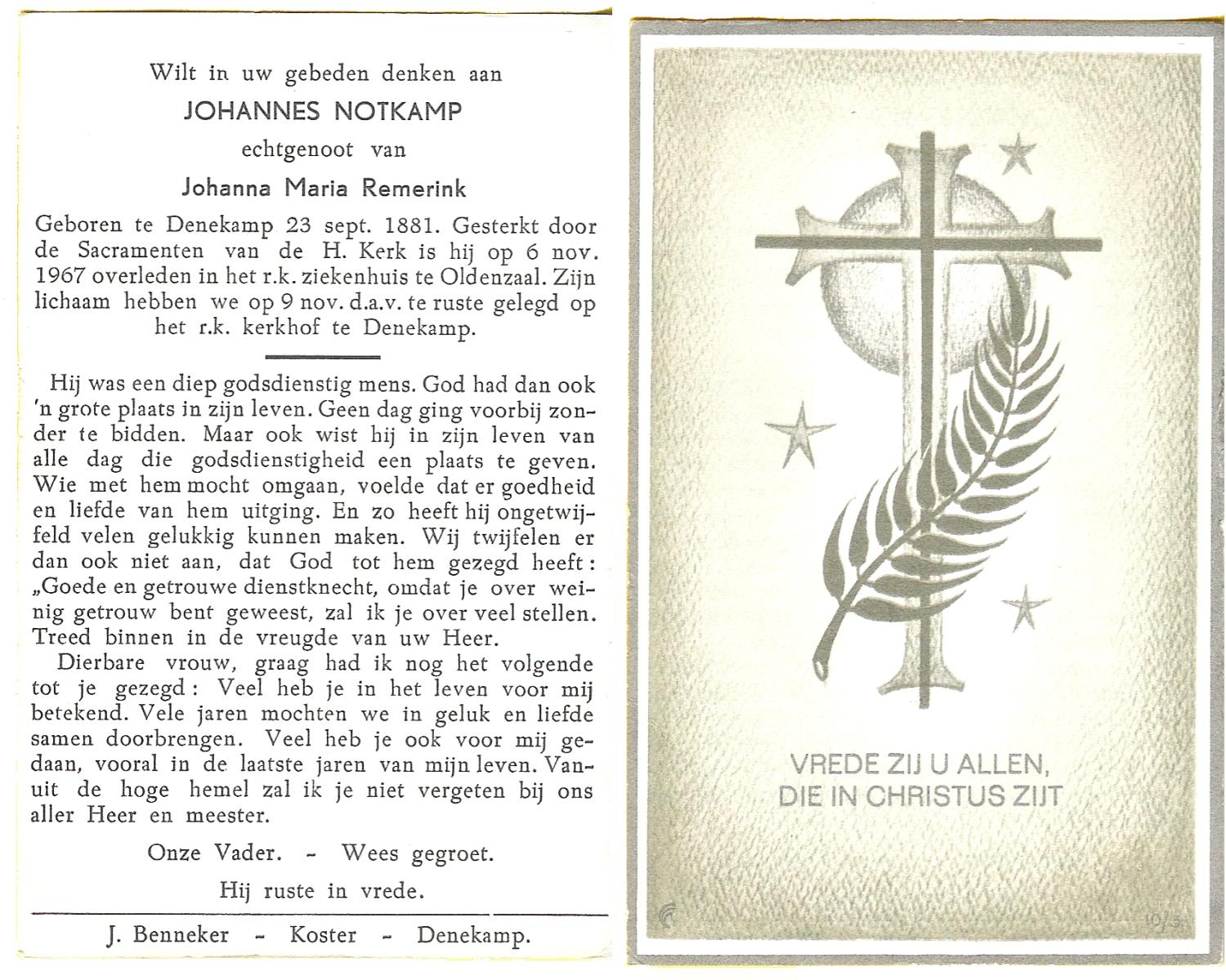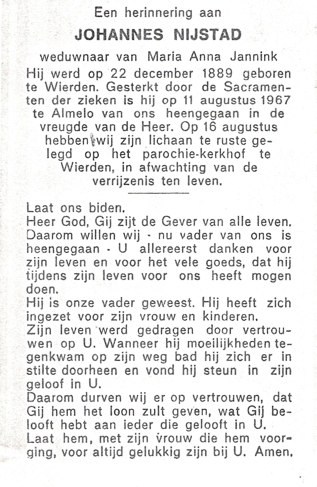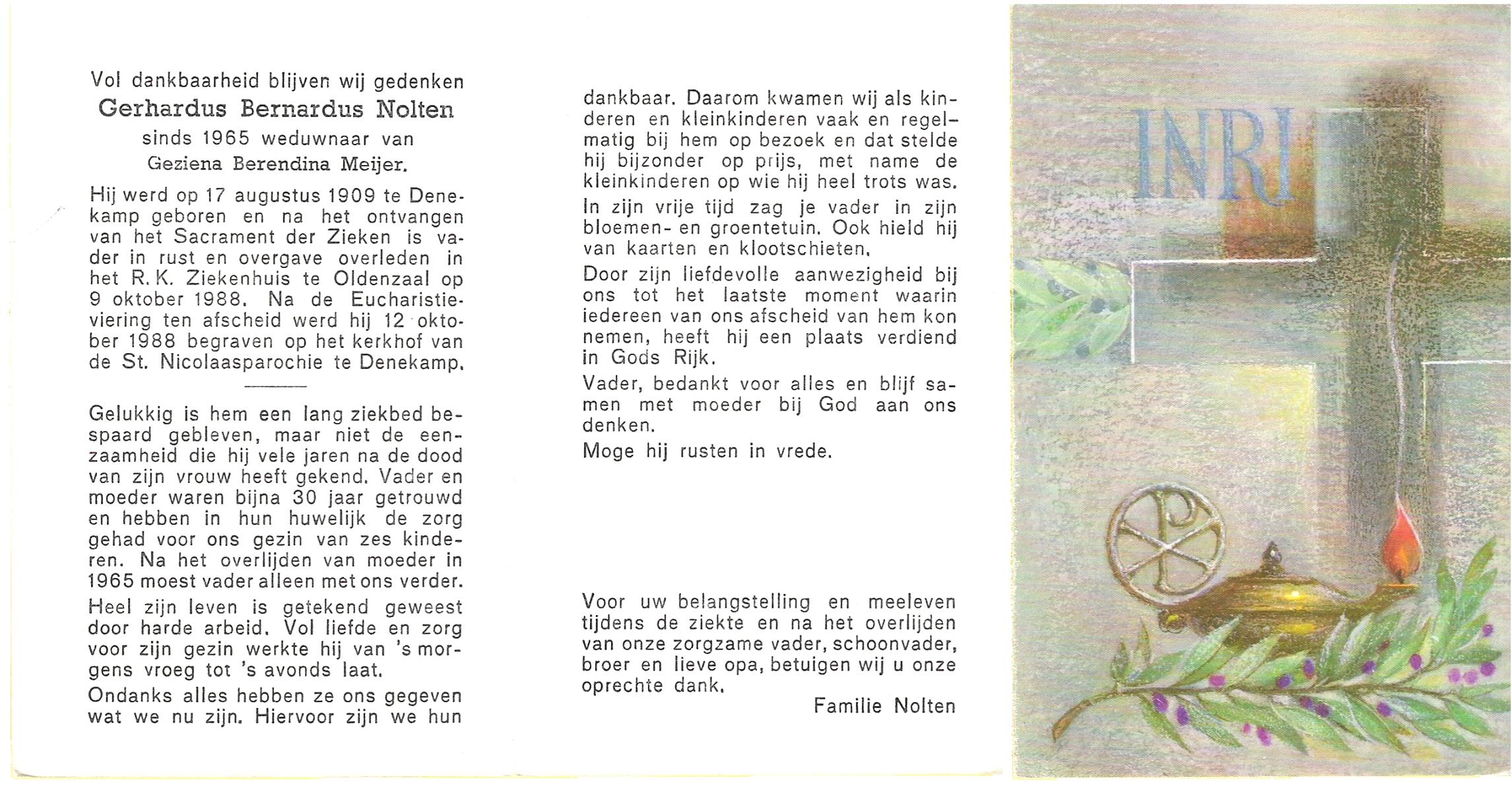 NIJKAMP, Johan Gerhardus, geboren op 26-5-1901 te Ootmarsum, overleden op 8-9-1988 op 87-jarige leeftijd, begraven op 12-9-1988 te Denekamp.