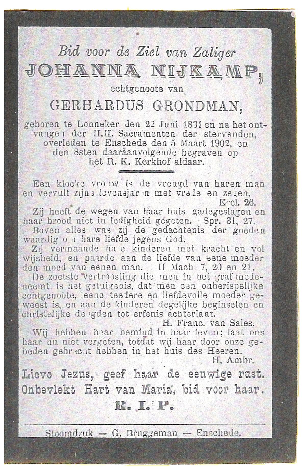 NIJKAMP, Johanna, geboren op 22-06-1831 te Lonneker, overleden op 5-3-1902 te Enschede op 70-jarige leeftijd, begraven te Enschede.
