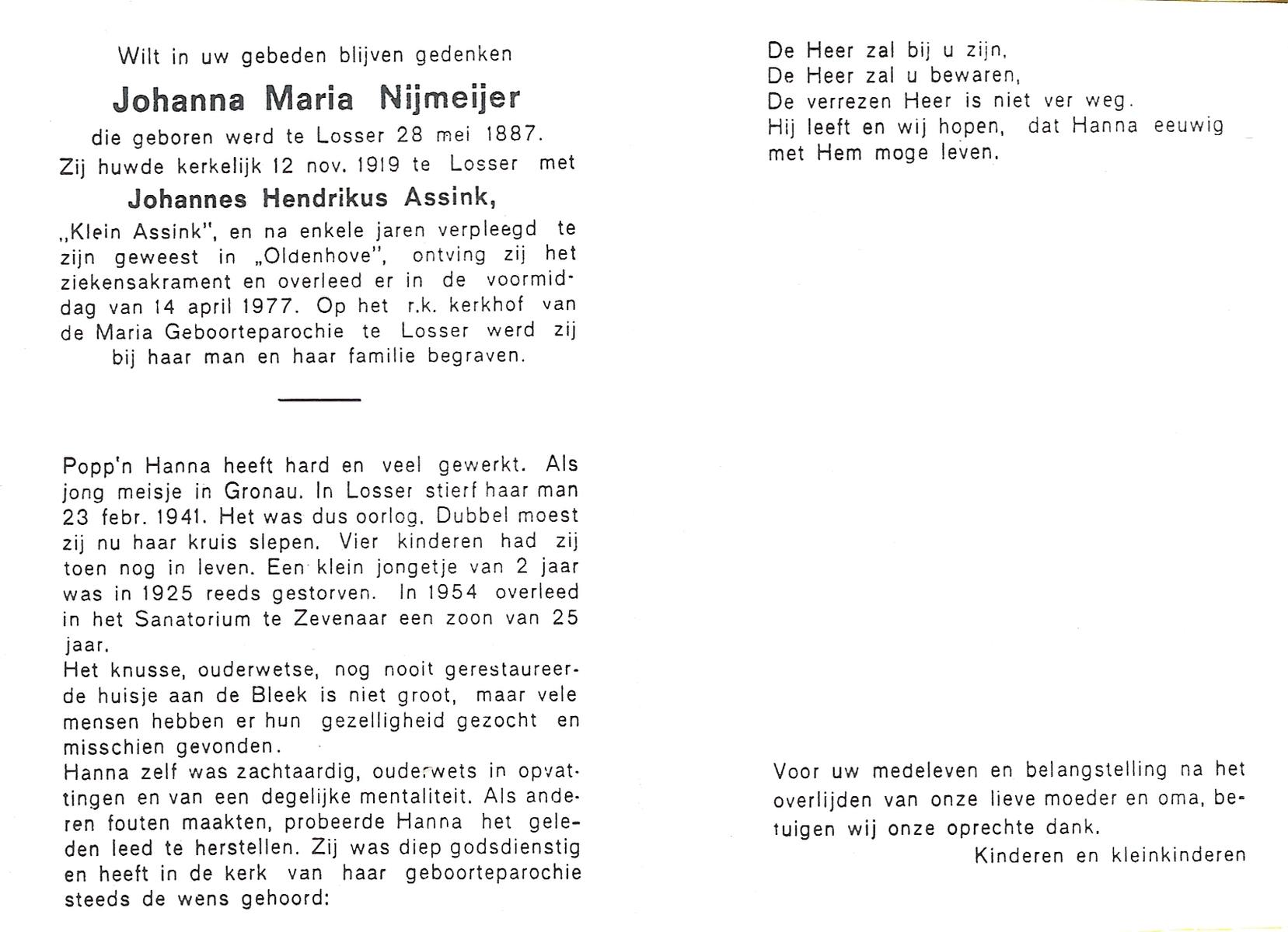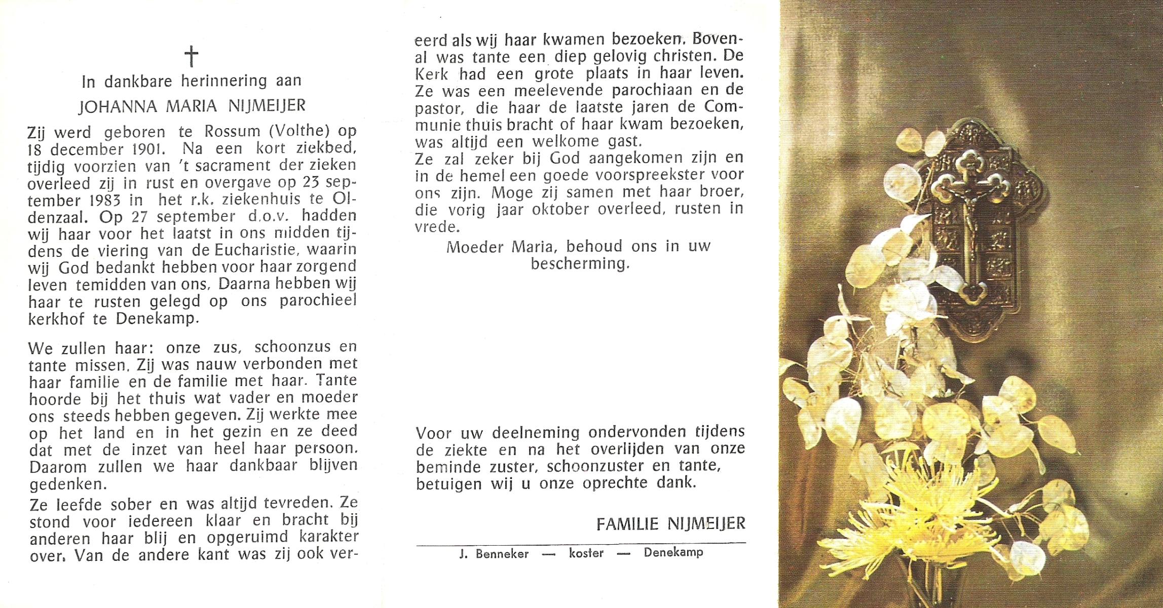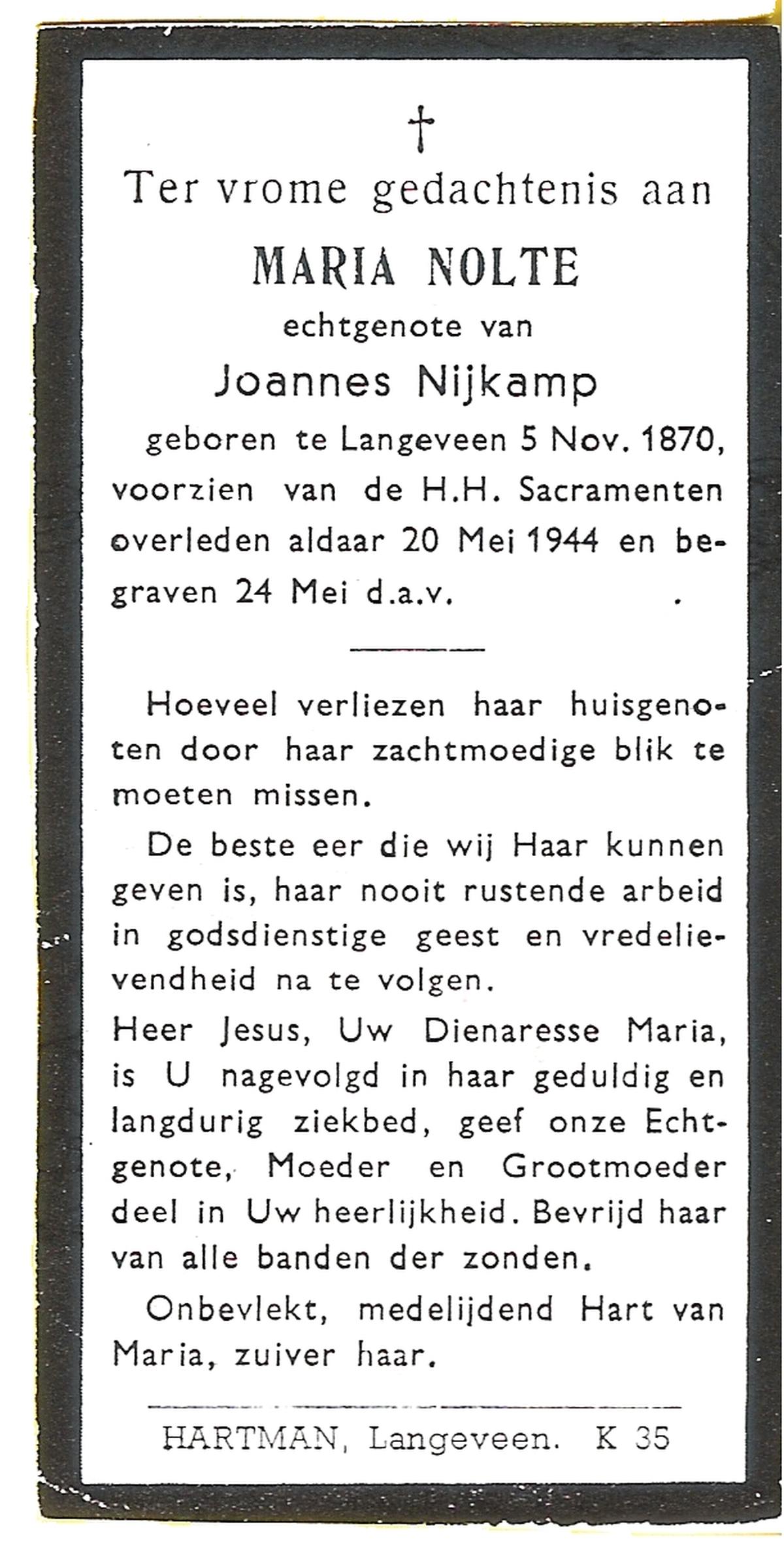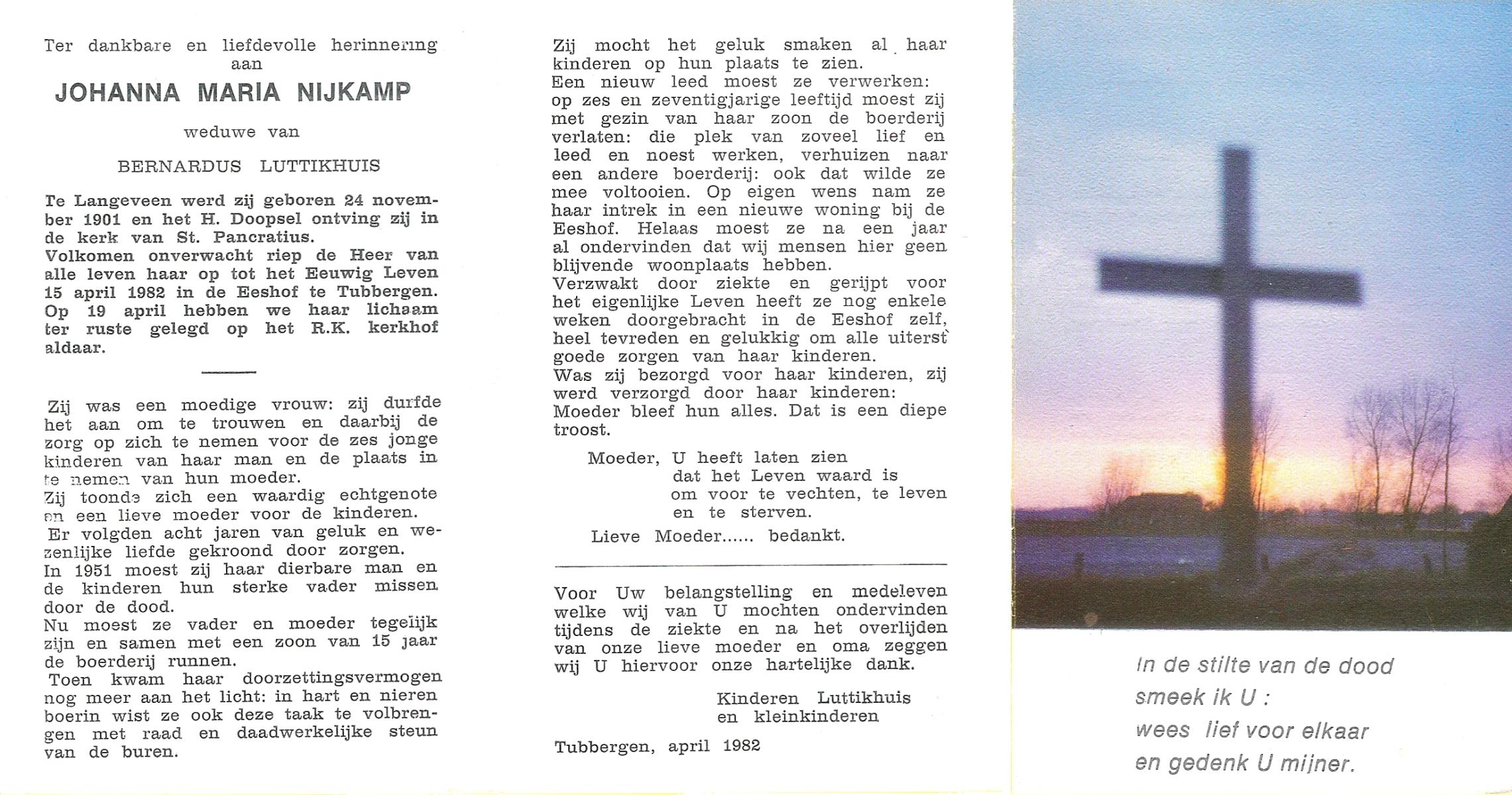 NIJKAMP, Johanna Maria, geboren op 24-11-1901 te Langeveen, overleden op 15-4-1982 te Tubbergen op 80-jarige leeftijd, begraven op 19-4-1982 te Tubbergen.
