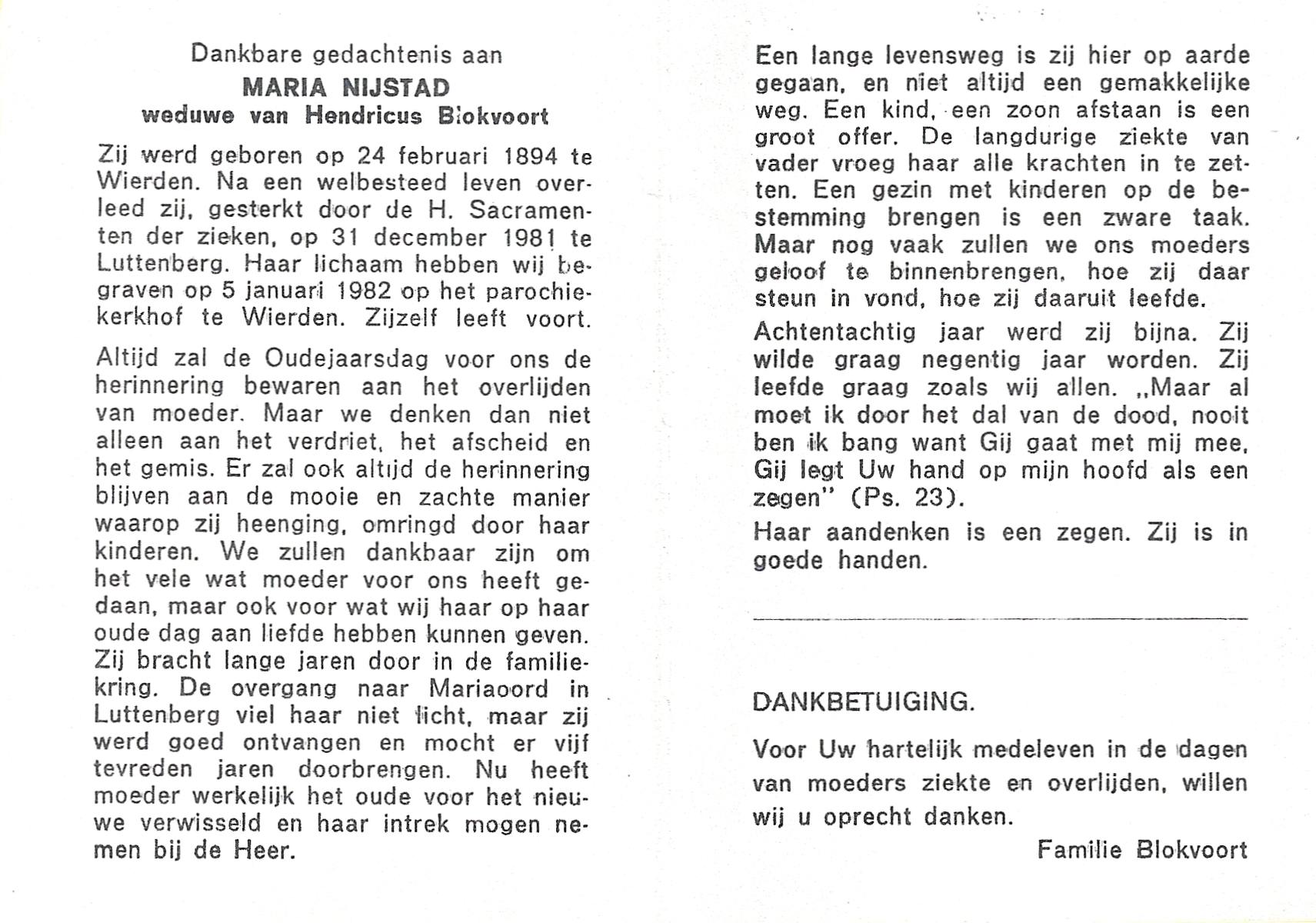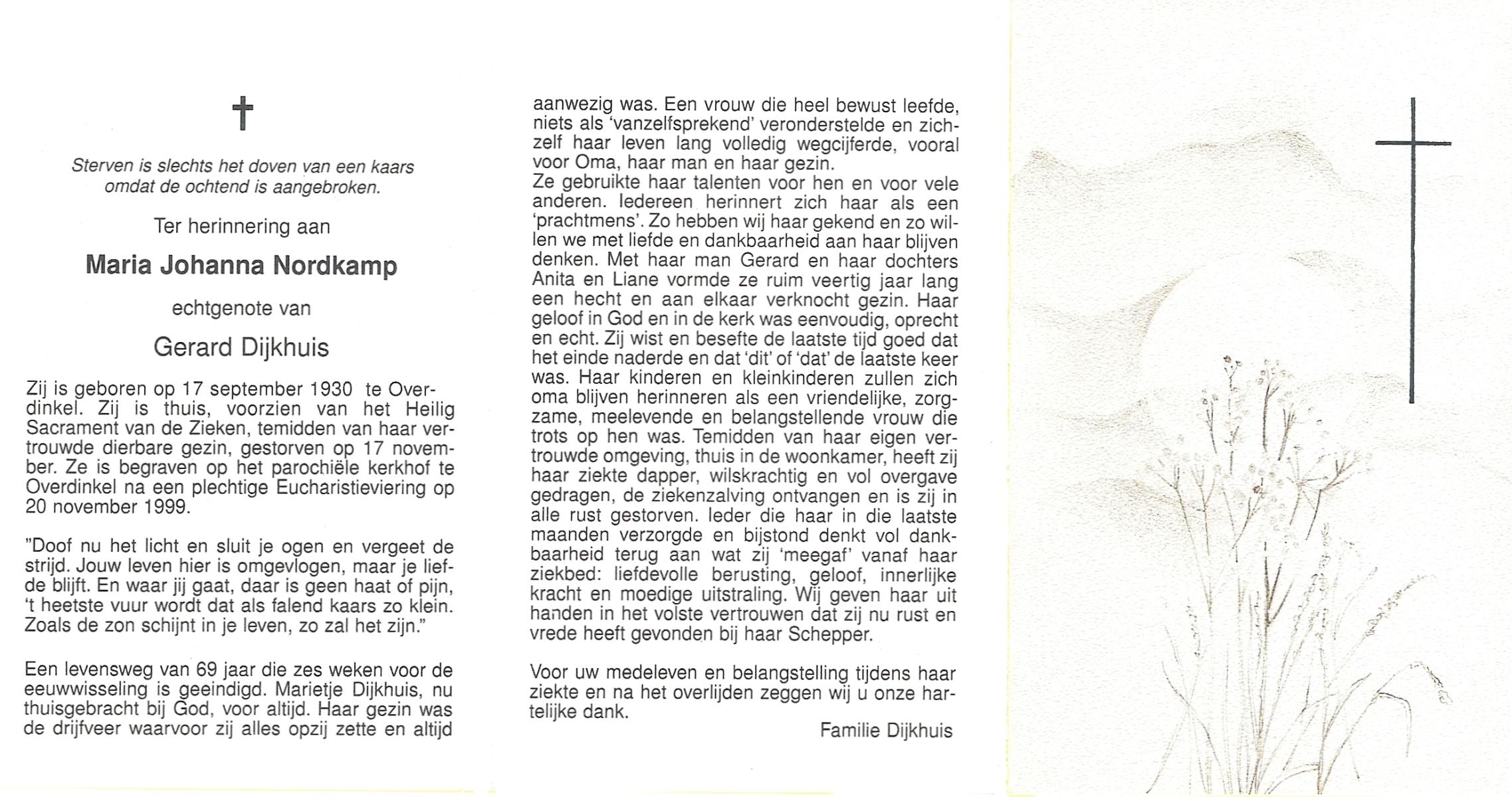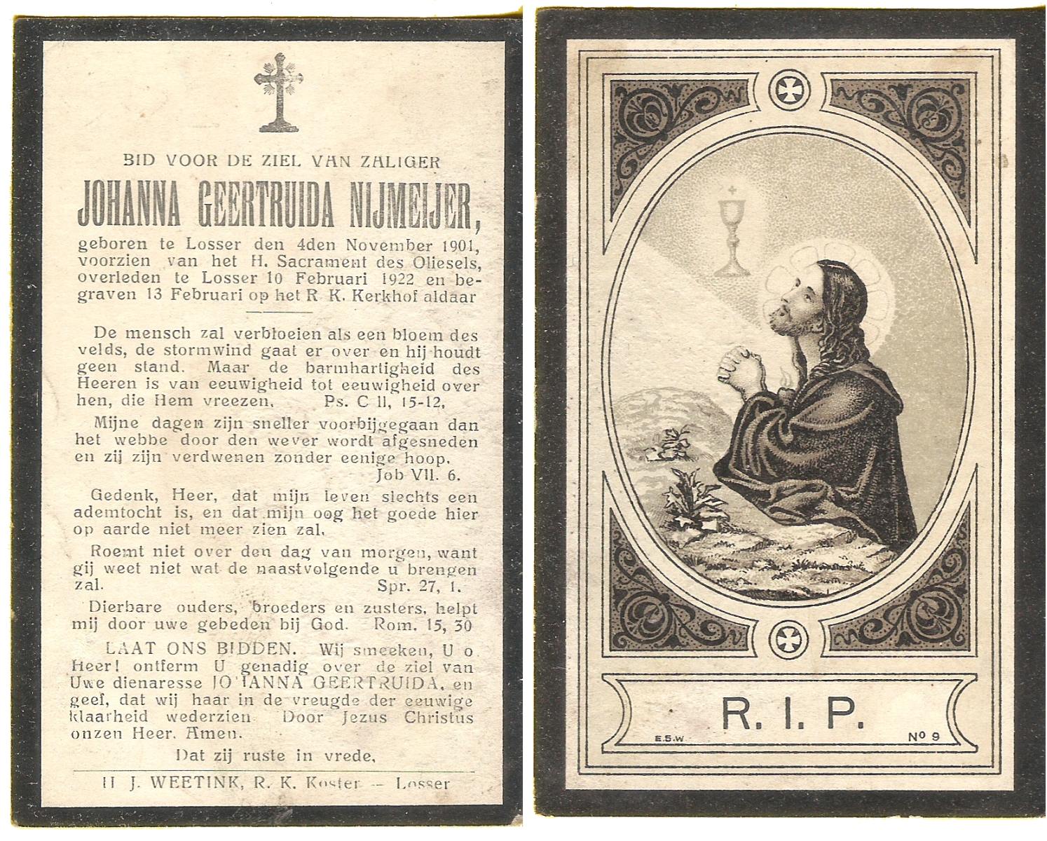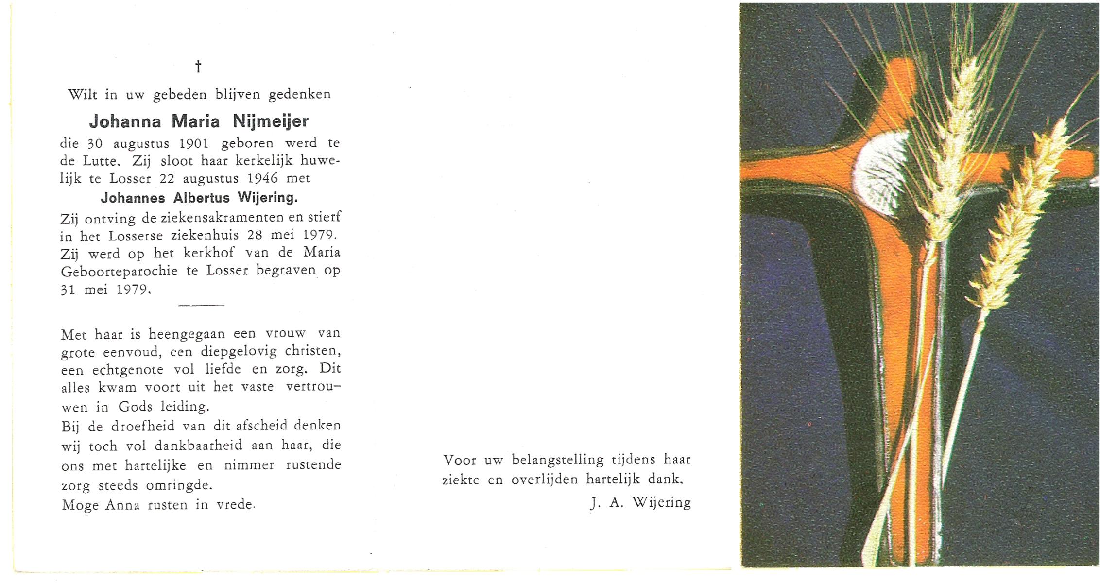 NIJKAMP, Johanna Maria, geboren op 24-11-1901 te Langeveen, overleden op 15-4-1982 te Tubbergen op 80-jarige leeftijd, begraven op 19-4-1982 te Tubbergen.