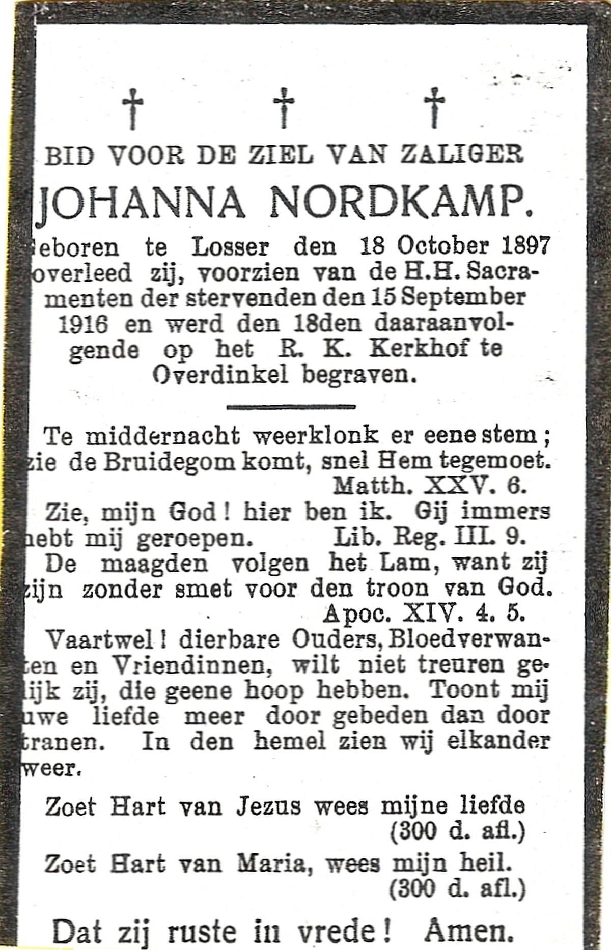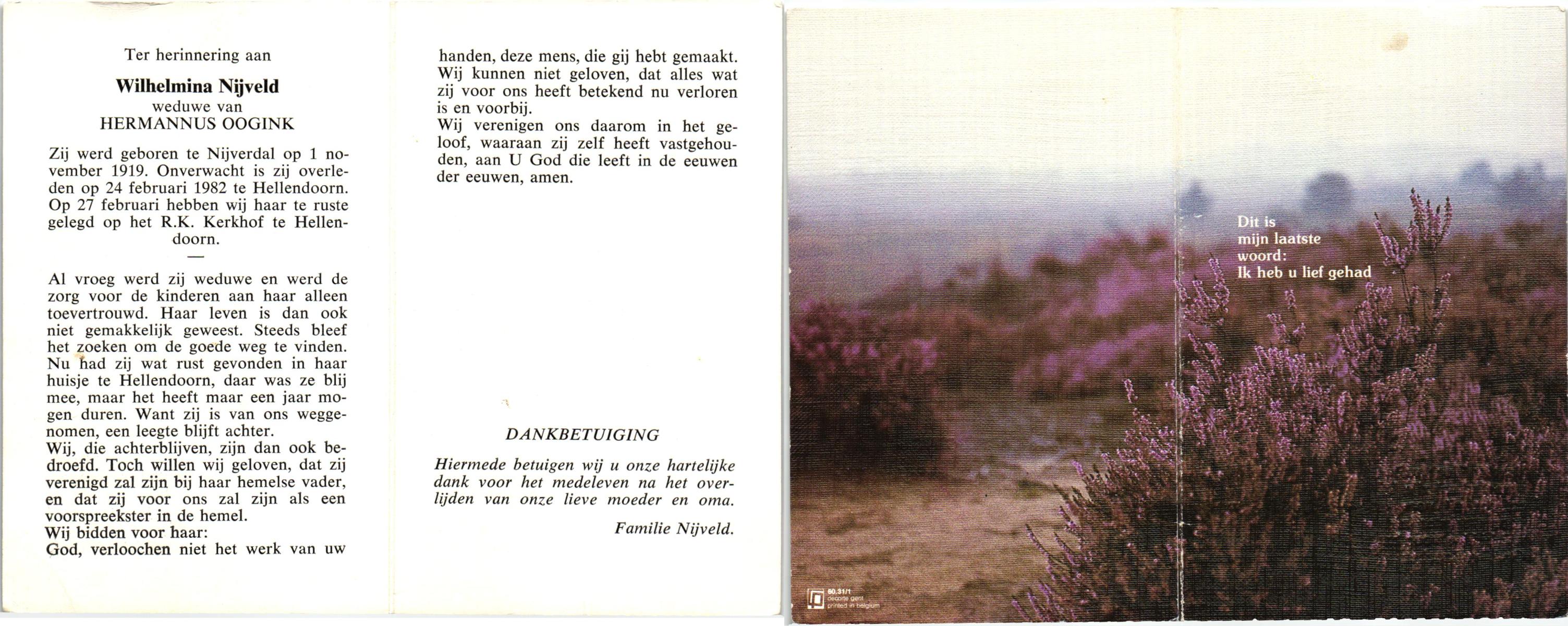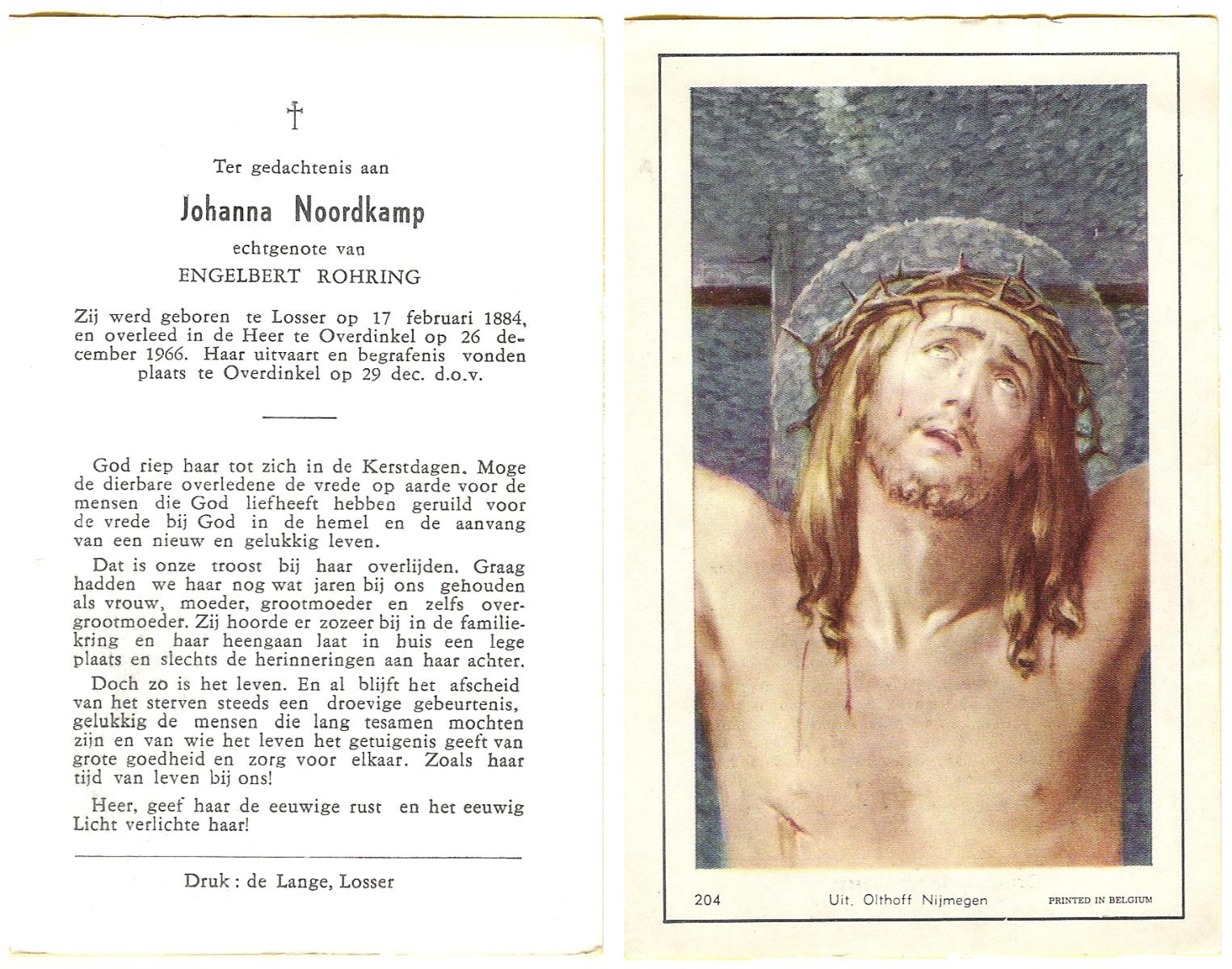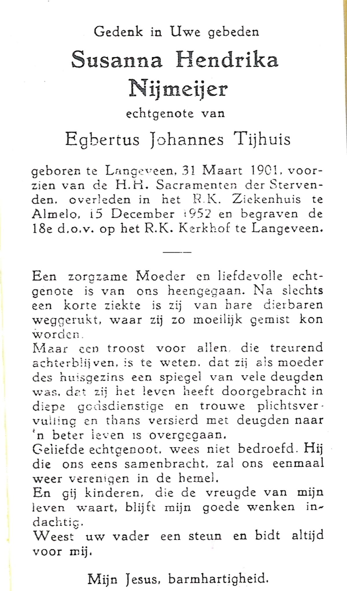 NIJKAMP, Johanna Maria, geboren op 24-11-1901 te Langeveen, overleden op 15-4-1982 te Tubbergen op 80-jarige leeftijd, begraven op 19-4-1982 te Tubbergen.