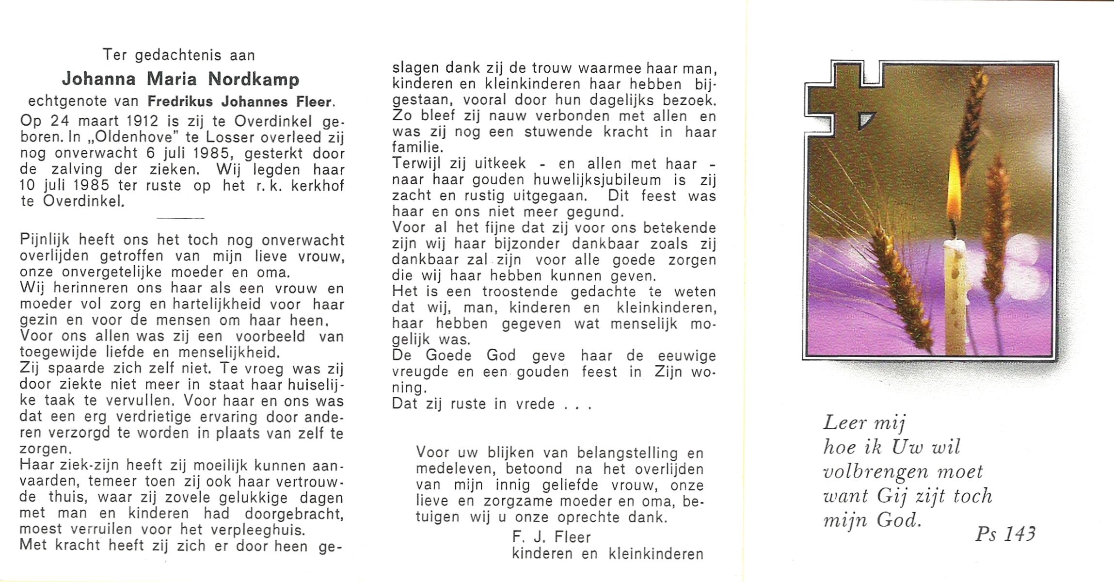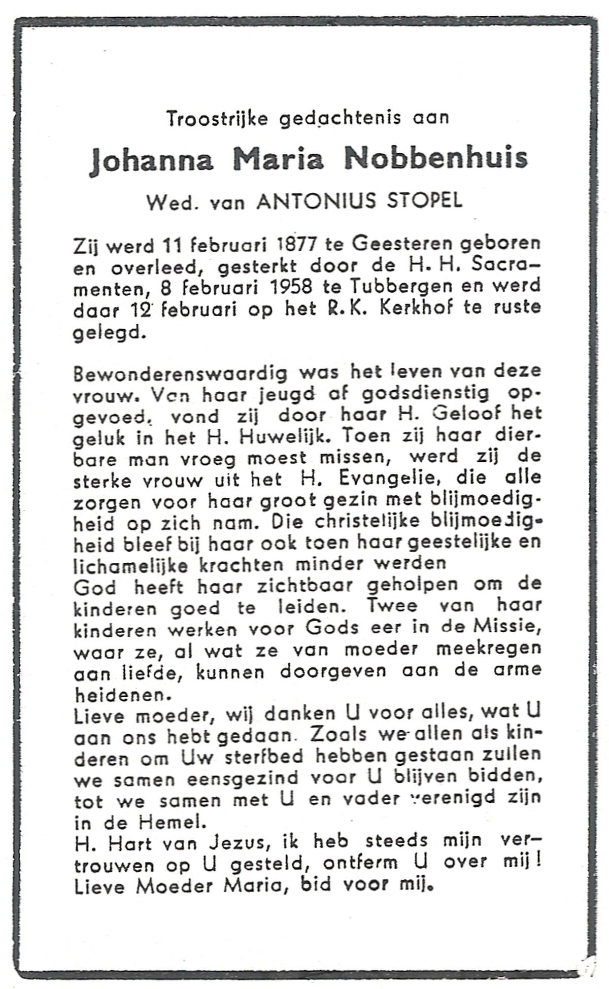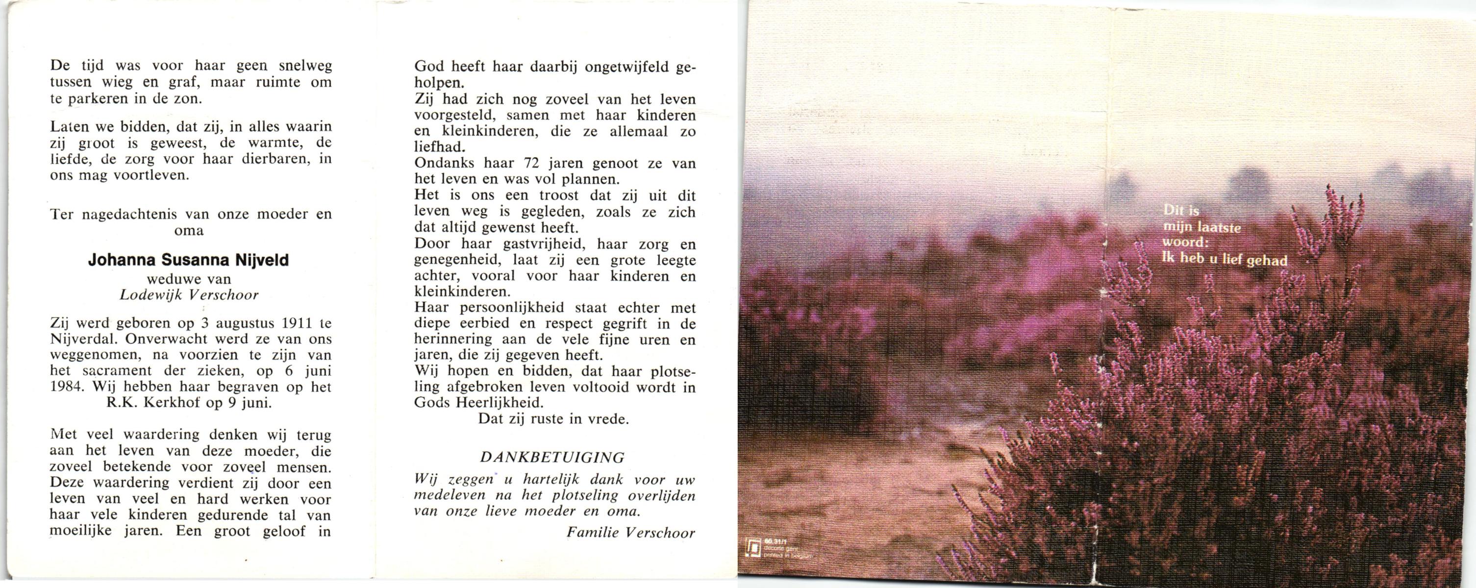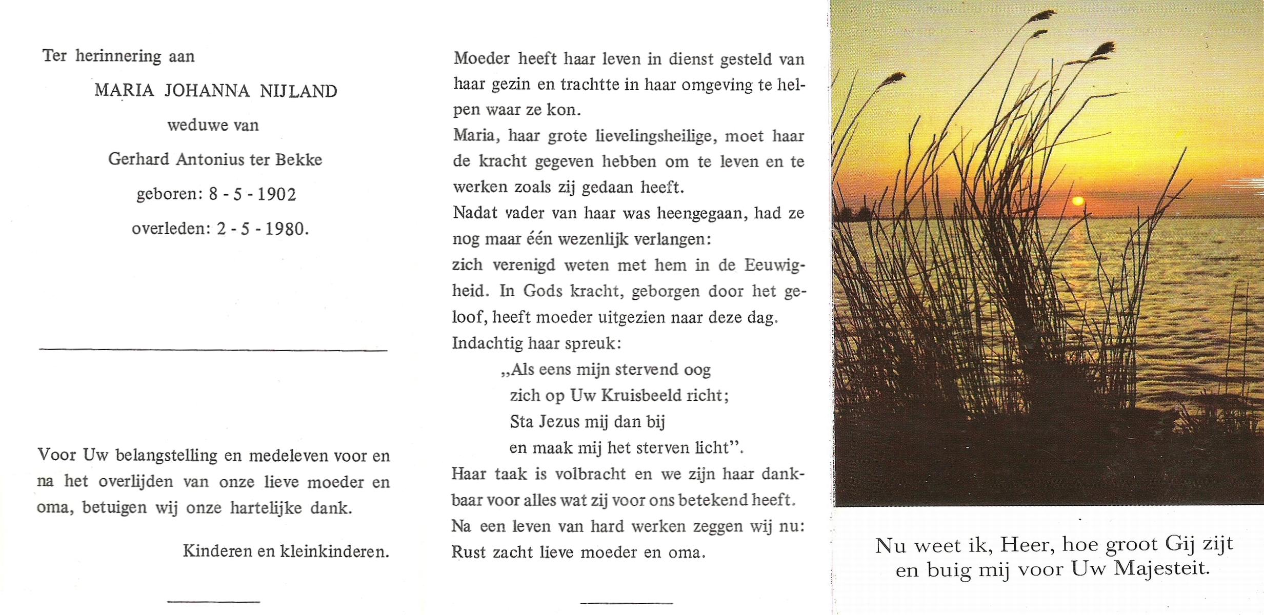 NIJKAMP, Johanna Maria, geboren op 24-11-1901 te Langeveen, overleden op 15-4-1982 te Tubbergen op 80-jarige leeftijd, begraven op 19-4-1982 te Tubbergen.