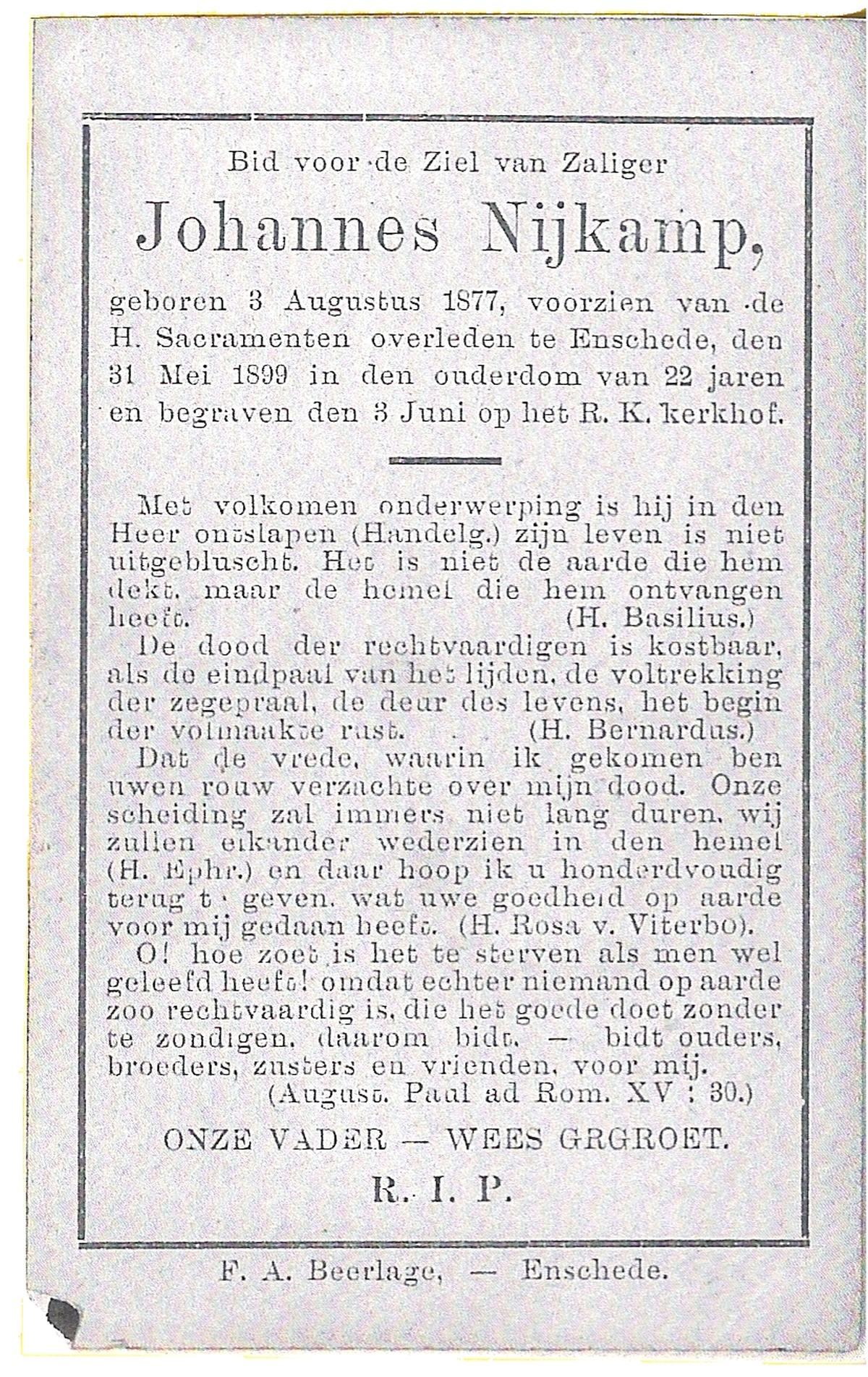 NIJKAMP, Johannes, geboren op 03-08-1877, overleden op 31-05-1899 te Enschede op 21-jarige leeftijd, begraven op 03-06-1899 te Enschede.