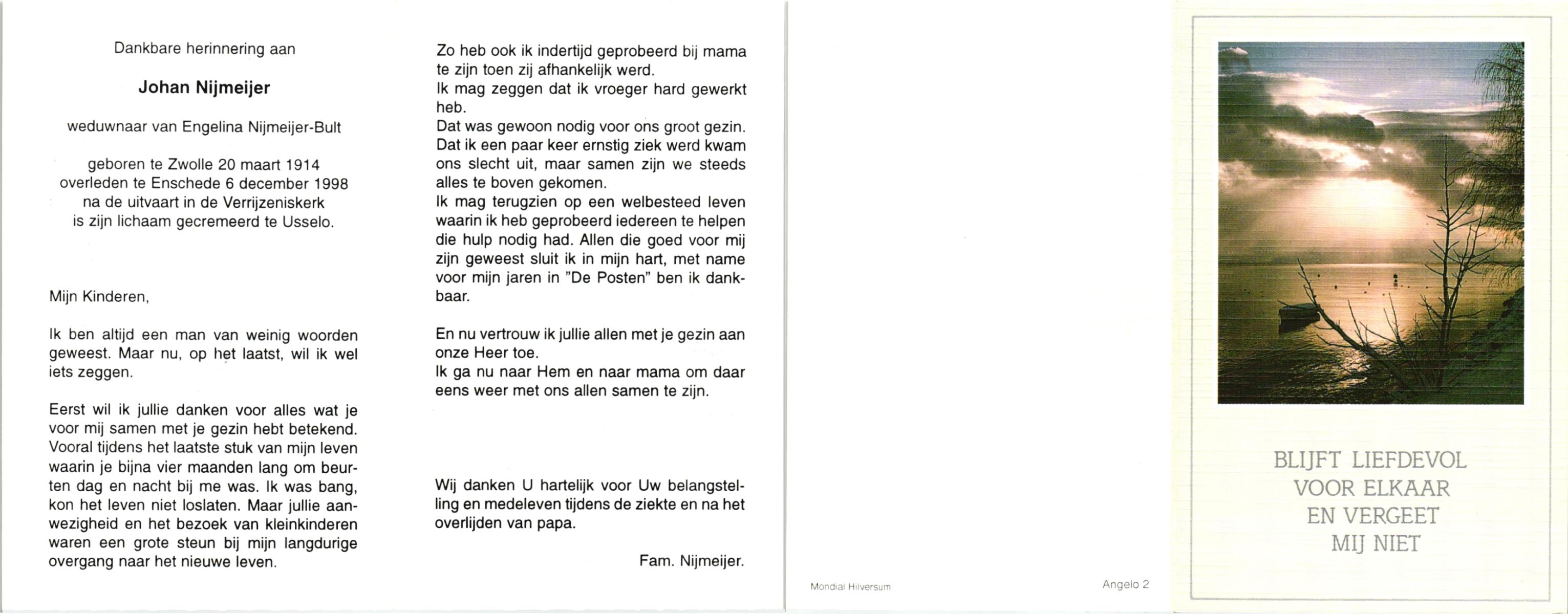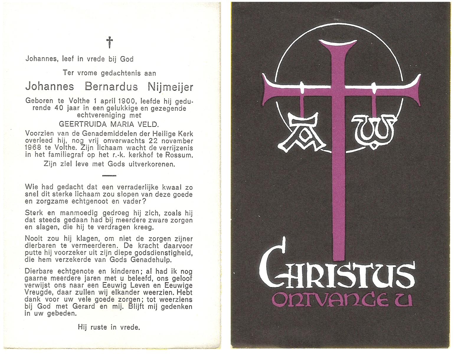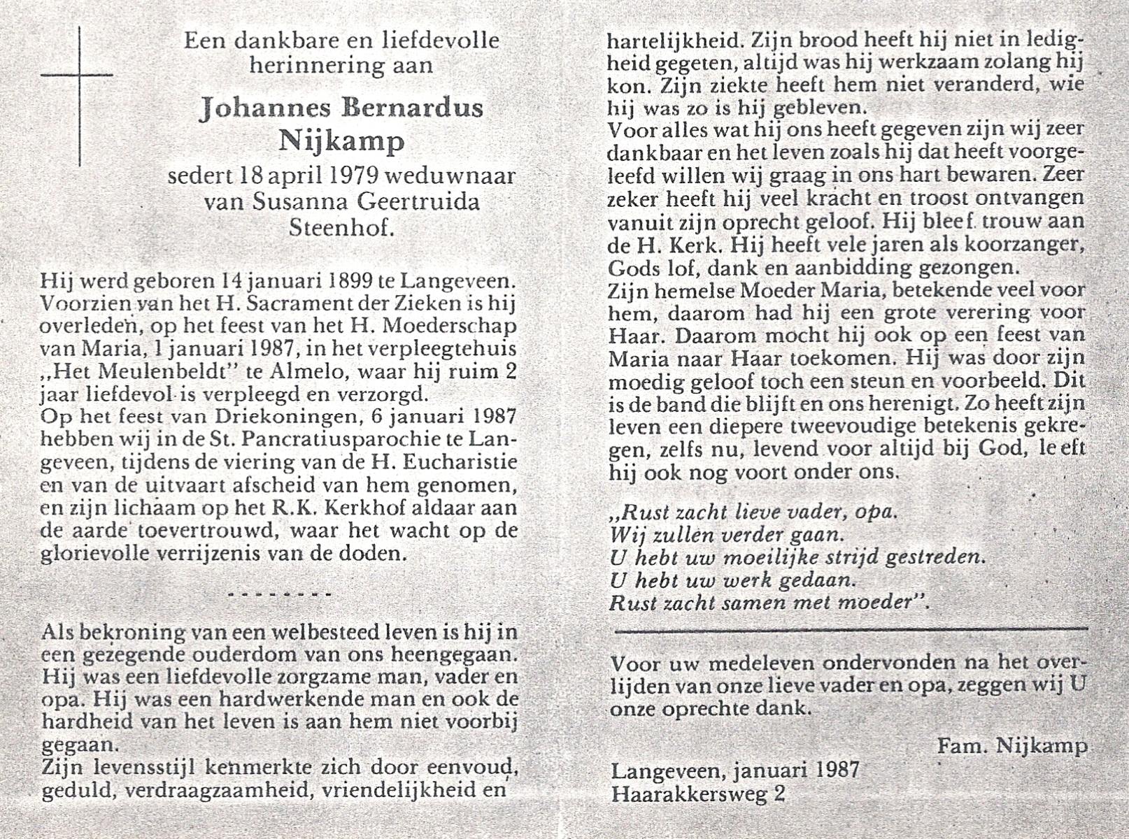 NIJKAMP, Johannes Bernardus, geboren op 14-01-1899 te Langeveen, overleden op 1-1-1987 te Almelo op 87-jarige leeftijd, begraven op 6-1-1987.