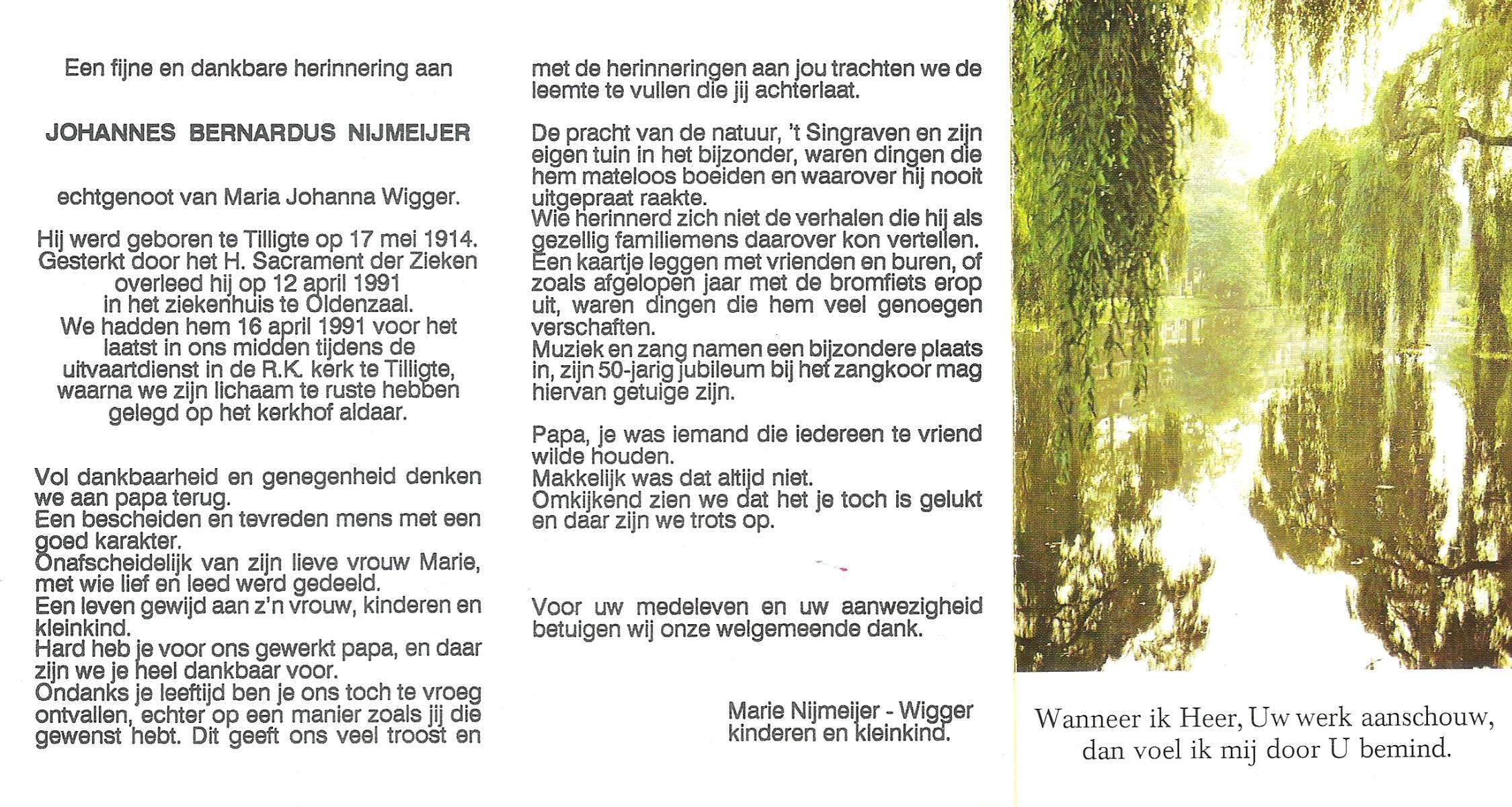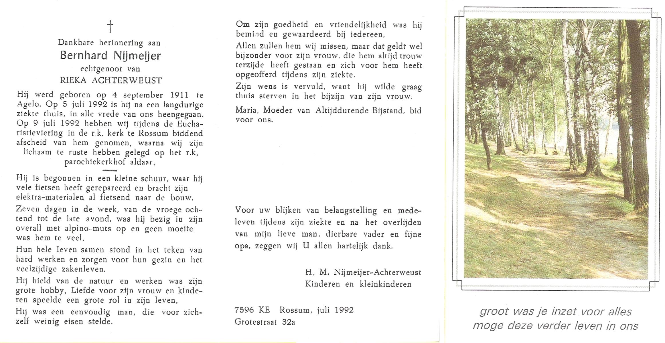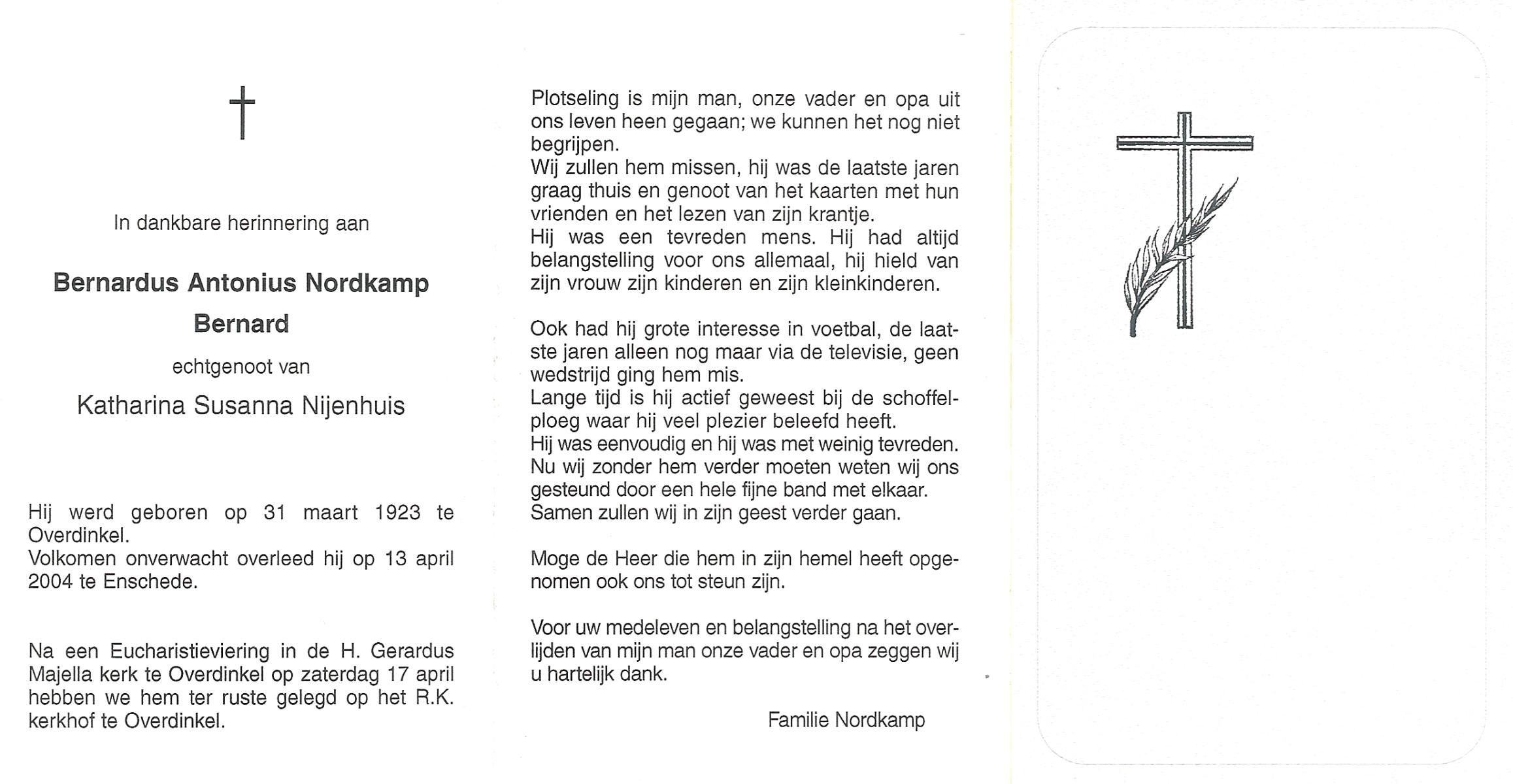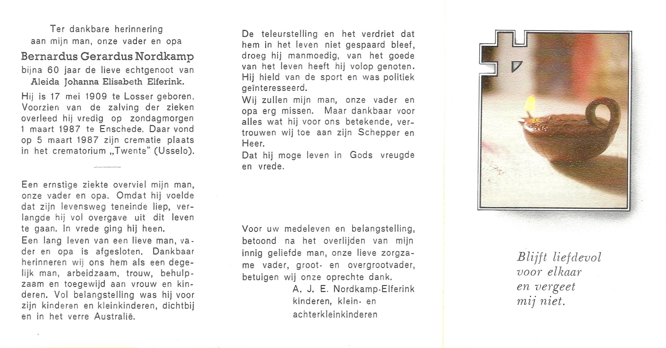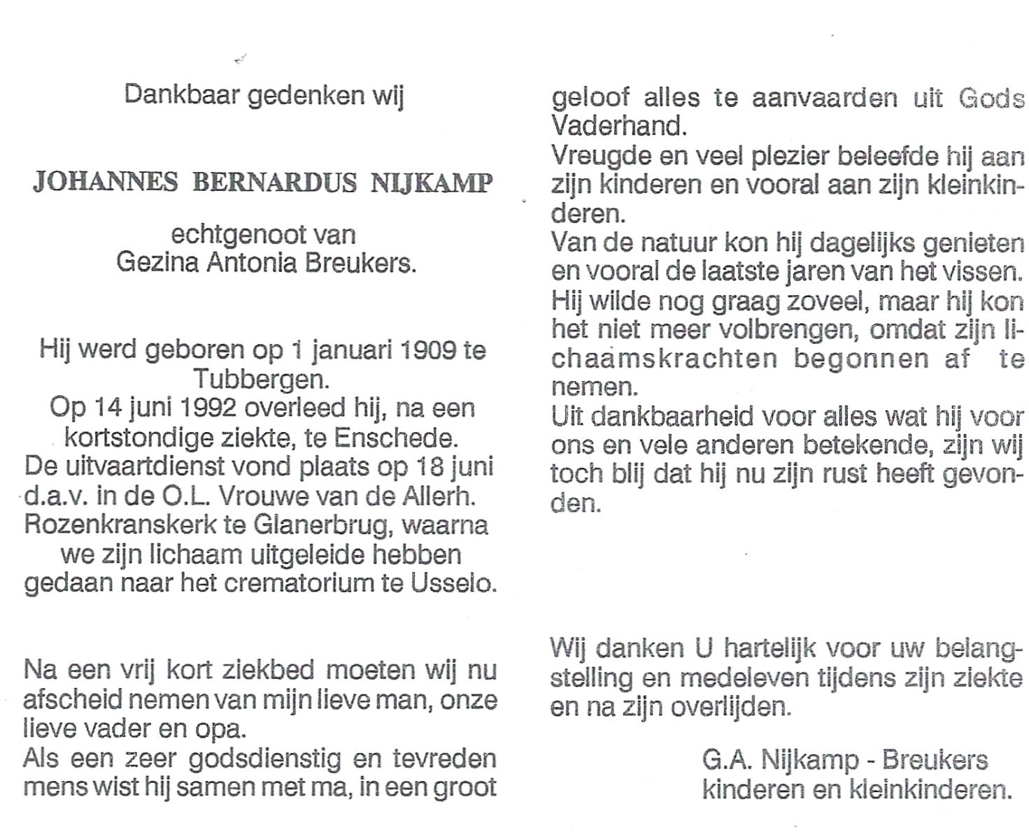 NIJKAMP, Johannes Bernardus, geboren op 1-1-1909 te Tubbergen, overleden op 14-6-1992 te Enschede op 83-jarige leeftijd, gecremeerd op 18-6-1992 te Usselo.
