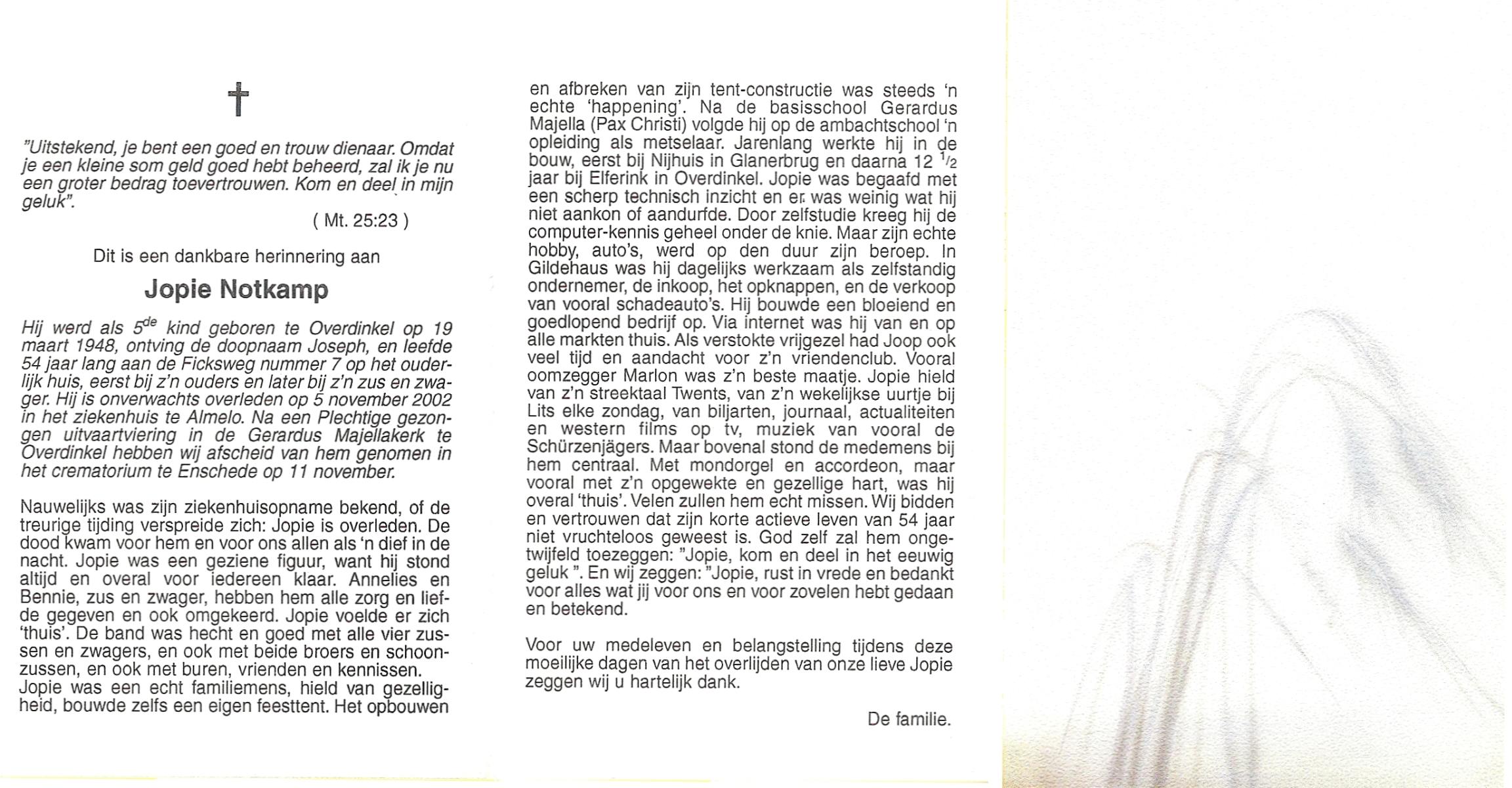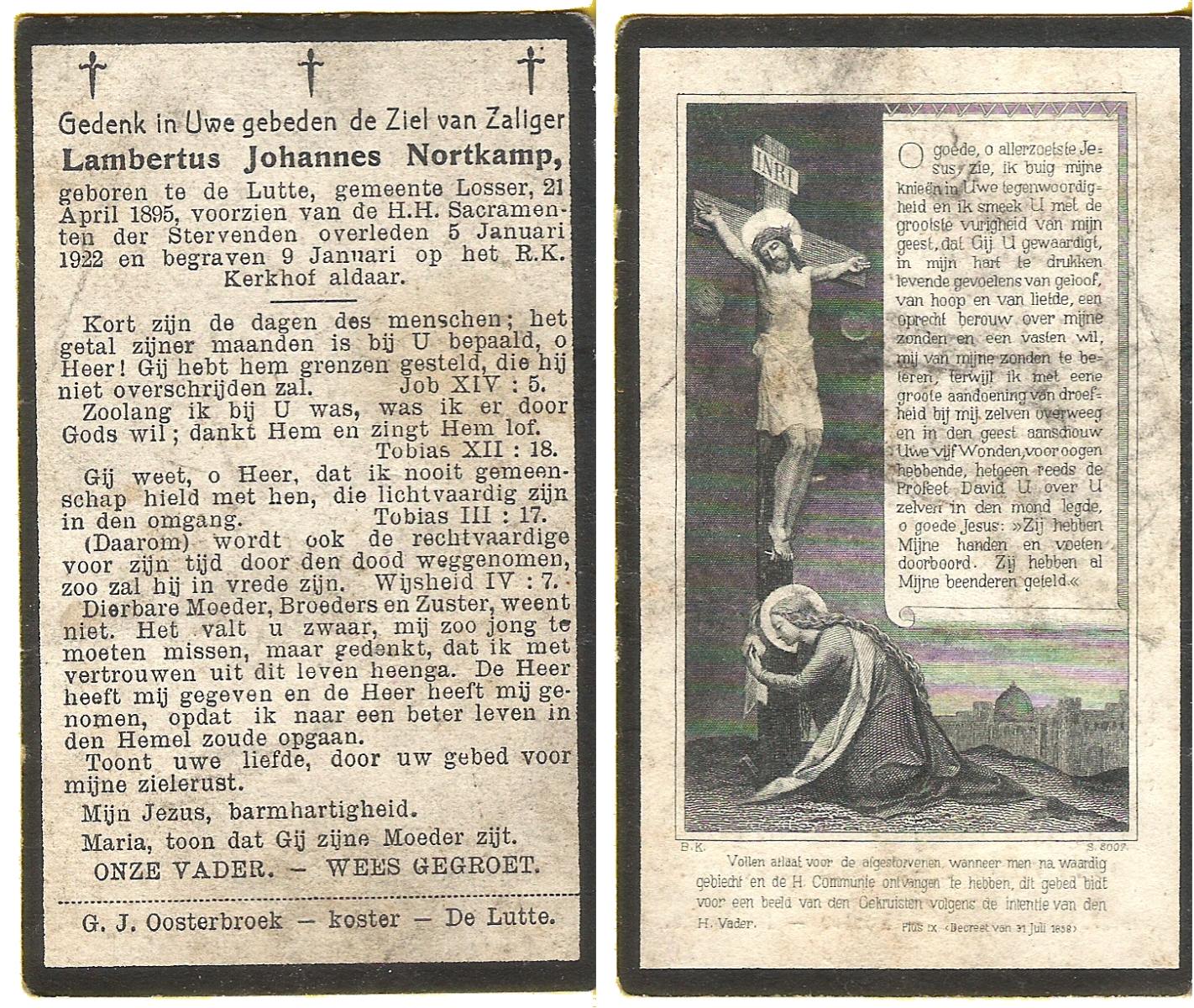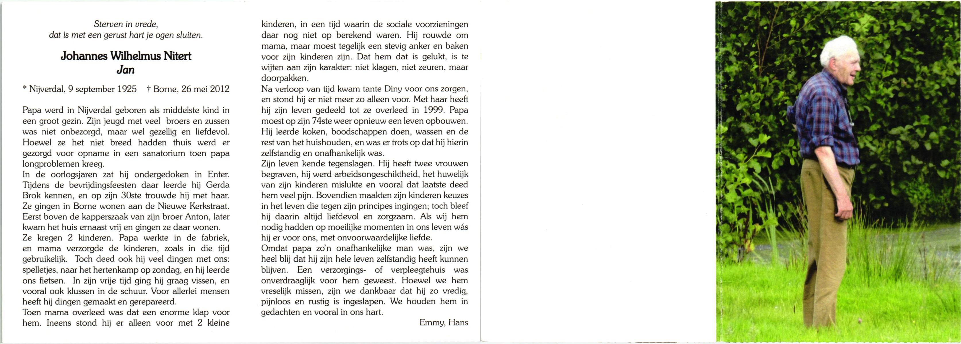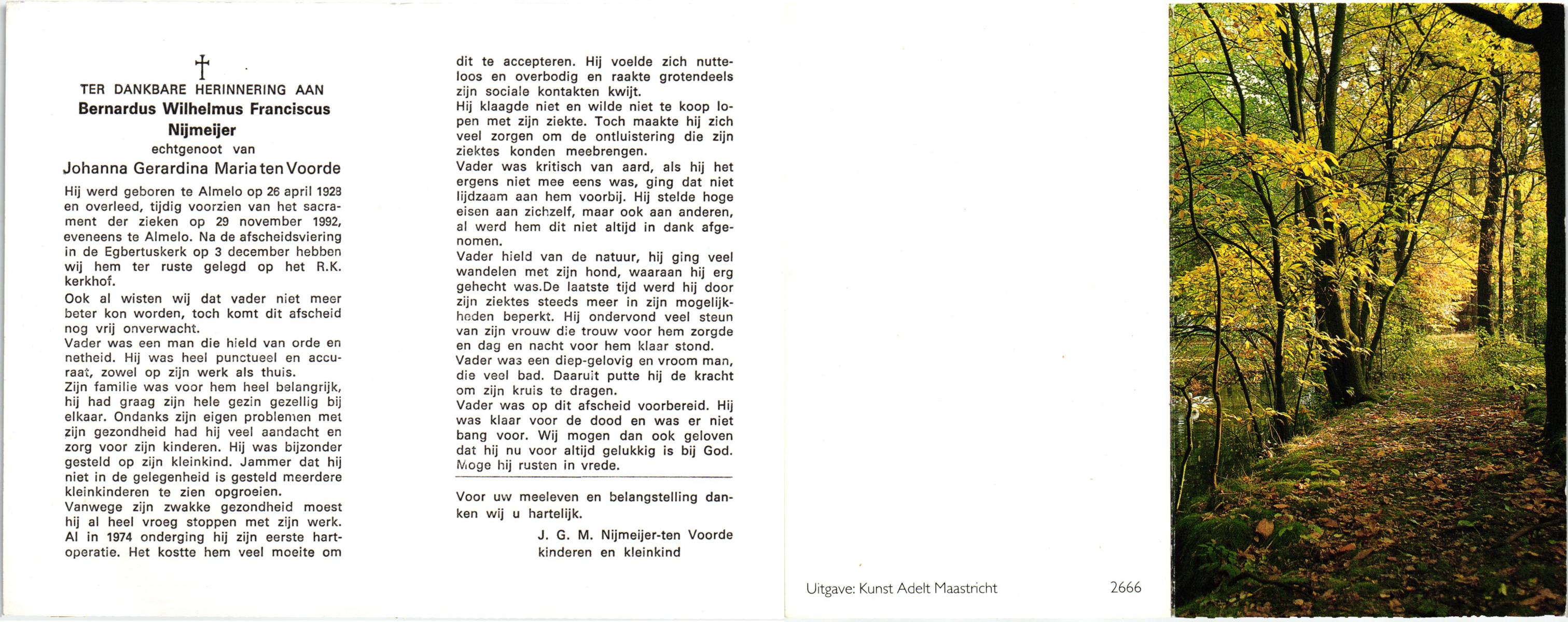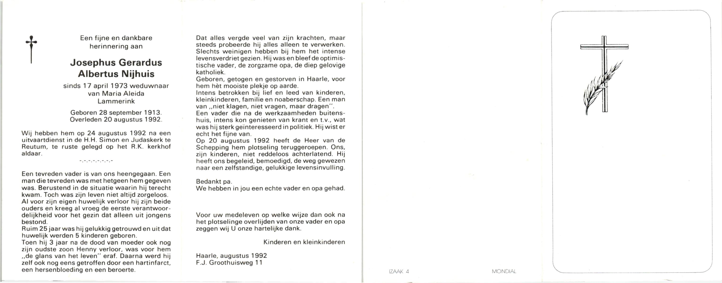 NIJKAMP, Johannes Bernardus, geboren op 1-1-1909 te Tubbergen, overleden op 14-6-1992 te Enschede op 83-jarige leeftijd, gecremeerd op 18-6-1992 te Usselo.