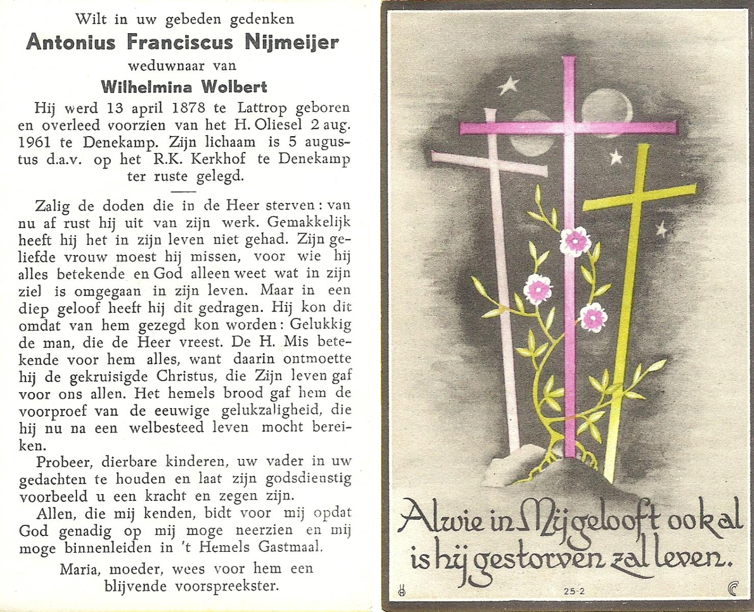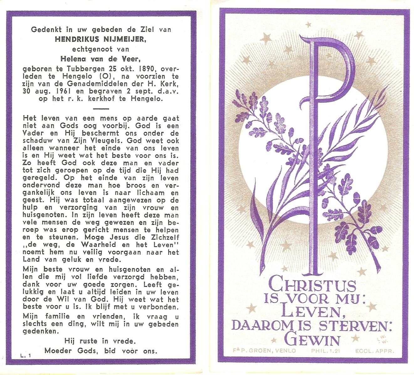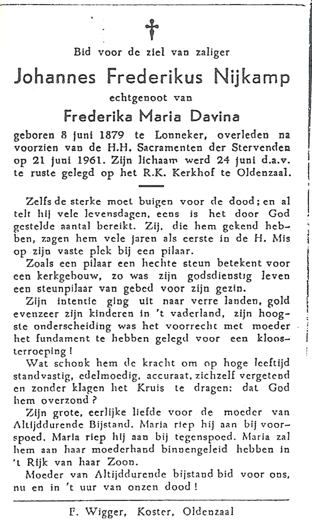 NIJKAMP, Johannes Frederikus, geboren op 08-07-1879 te Lonneker, overleden op 21-6-1961 te Oldenzaal op 82-jarige leeftijd, begraven op 24-6-1961 te Oldenzaal.