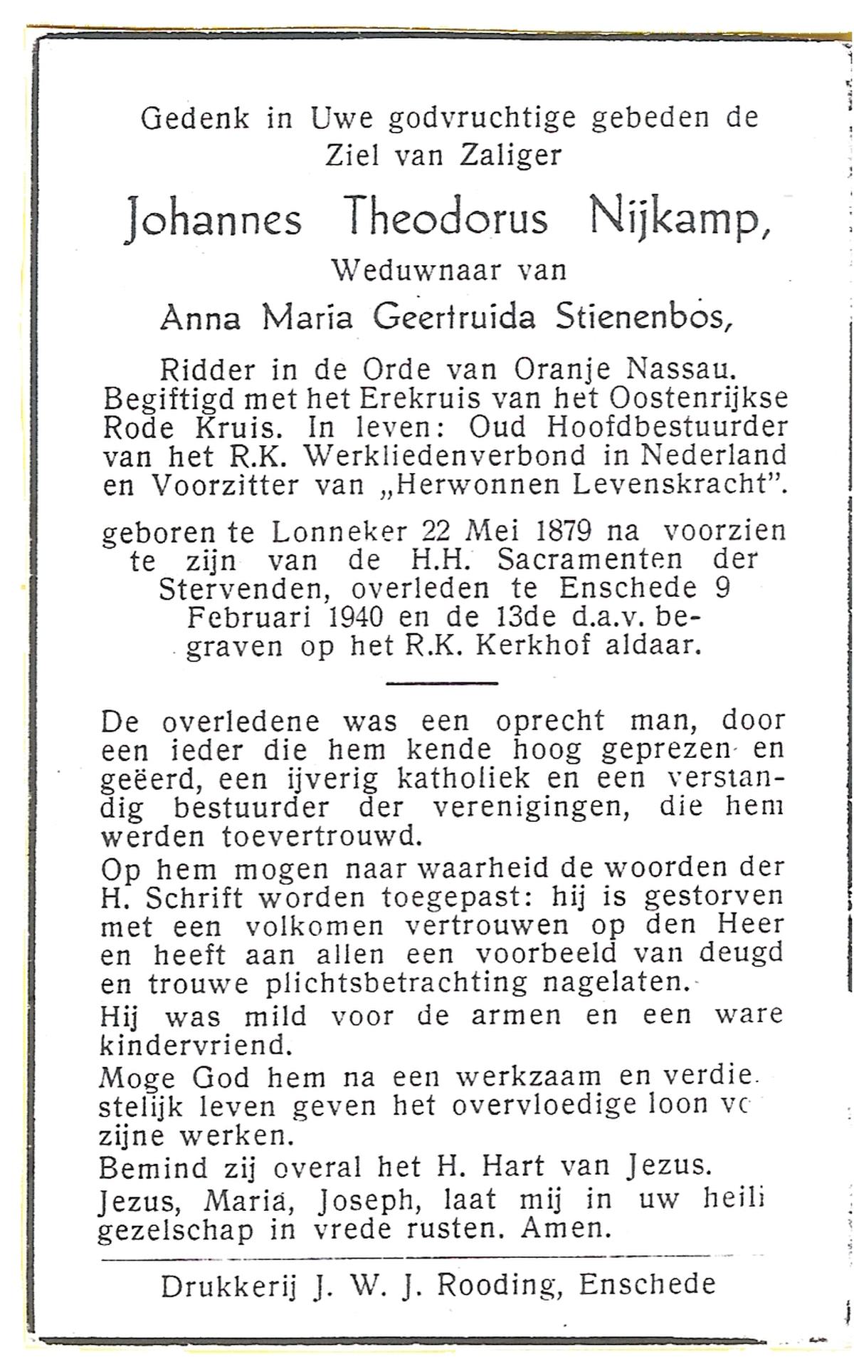 NIJKAMP, Johannes Theodorus, geboren op 22-05-1879 te Lonneker, overleden op 9-2-1940 te Enschede op 60-jarige leeftijd, begraven op 13-2-1940 te Enschede.