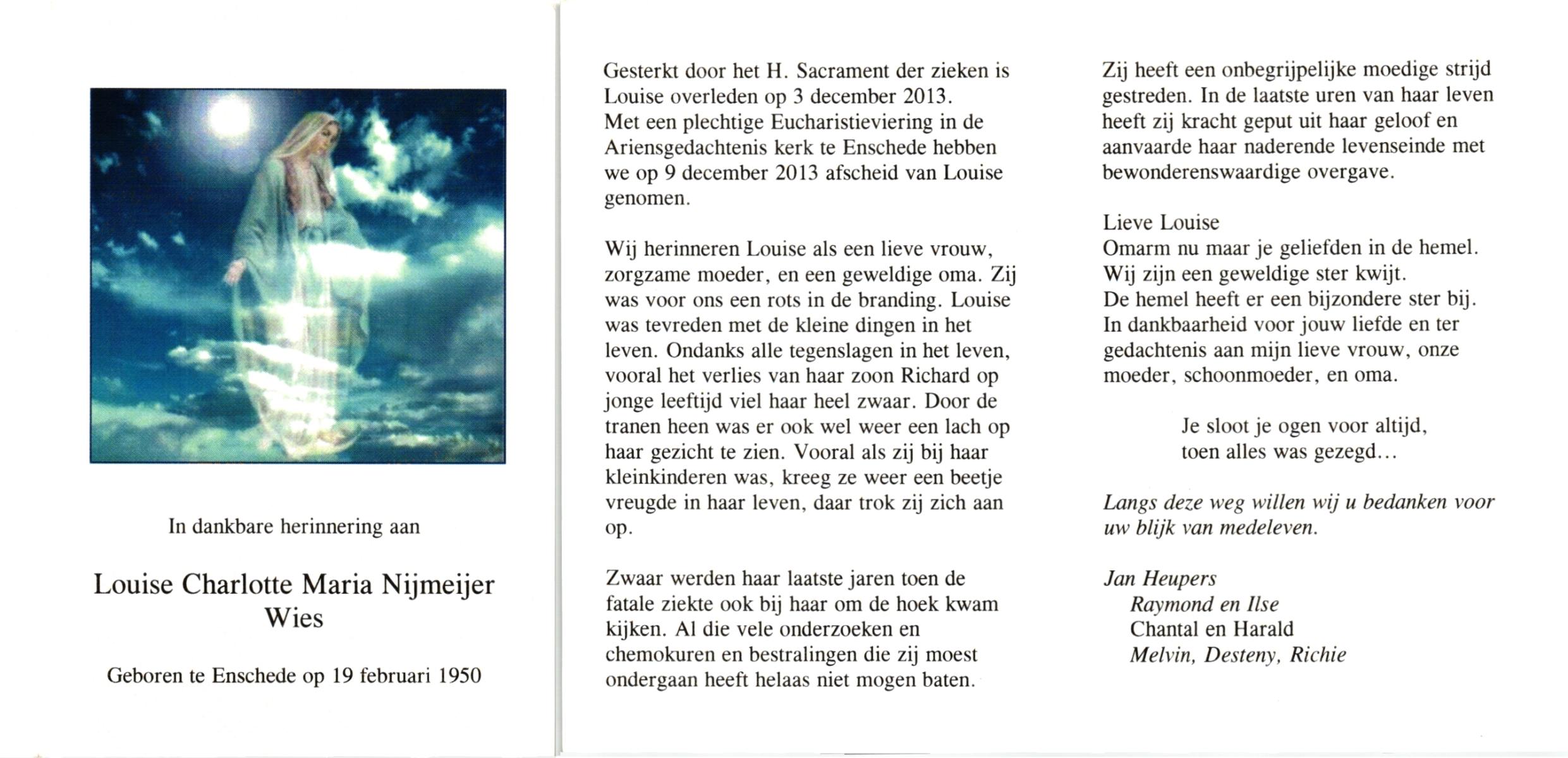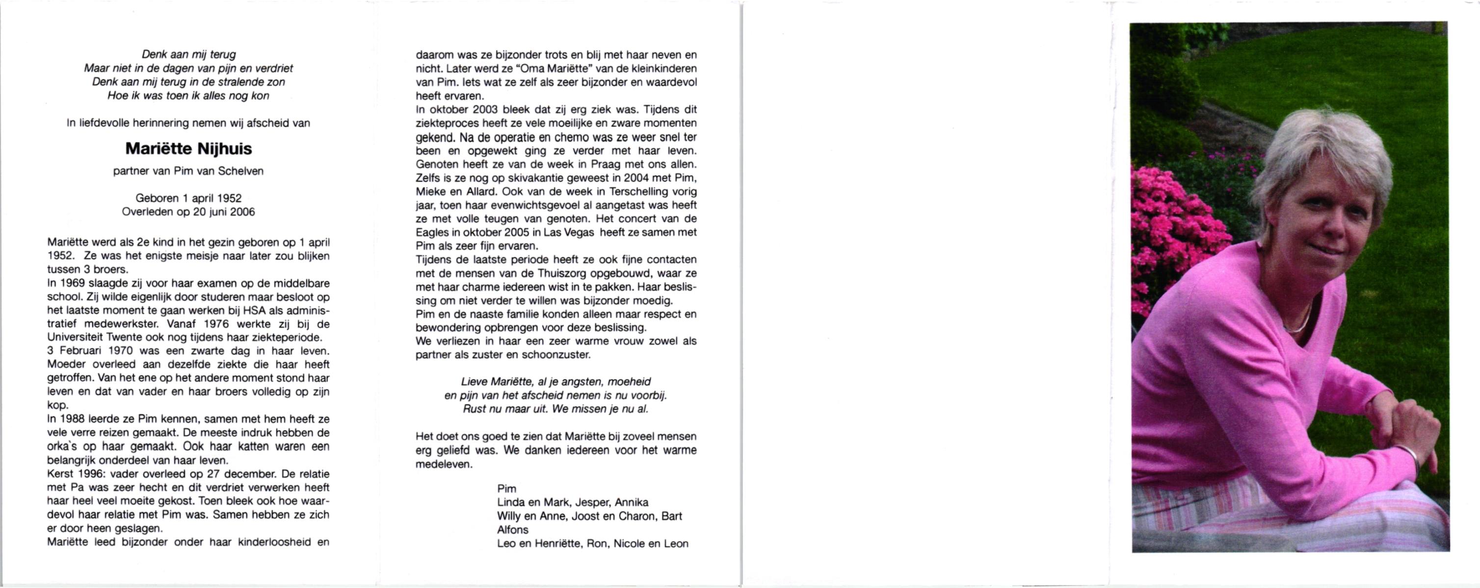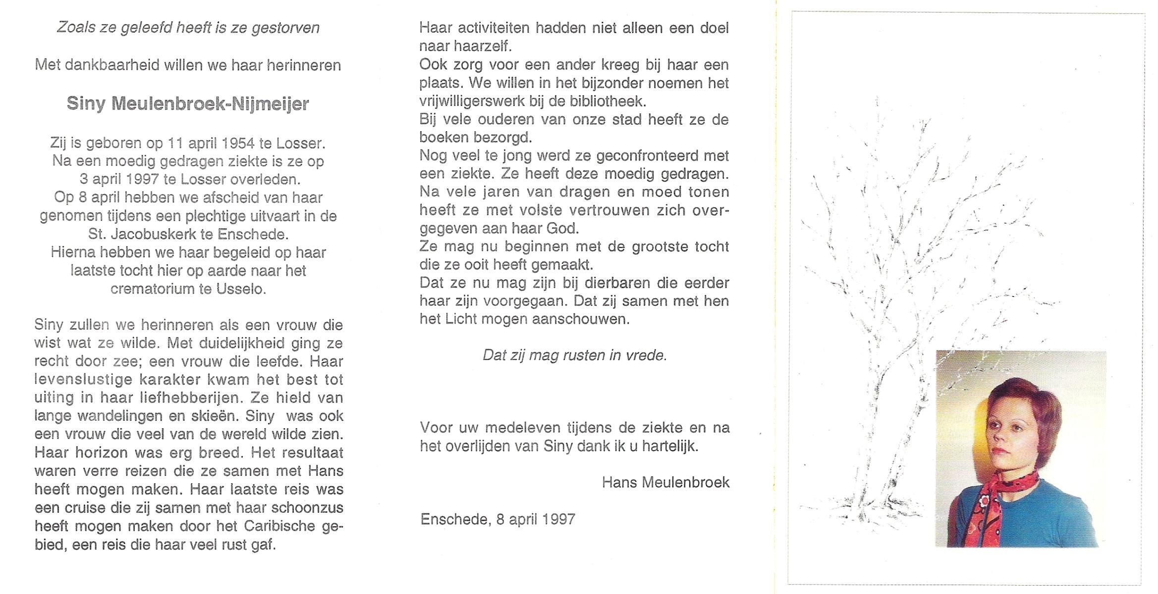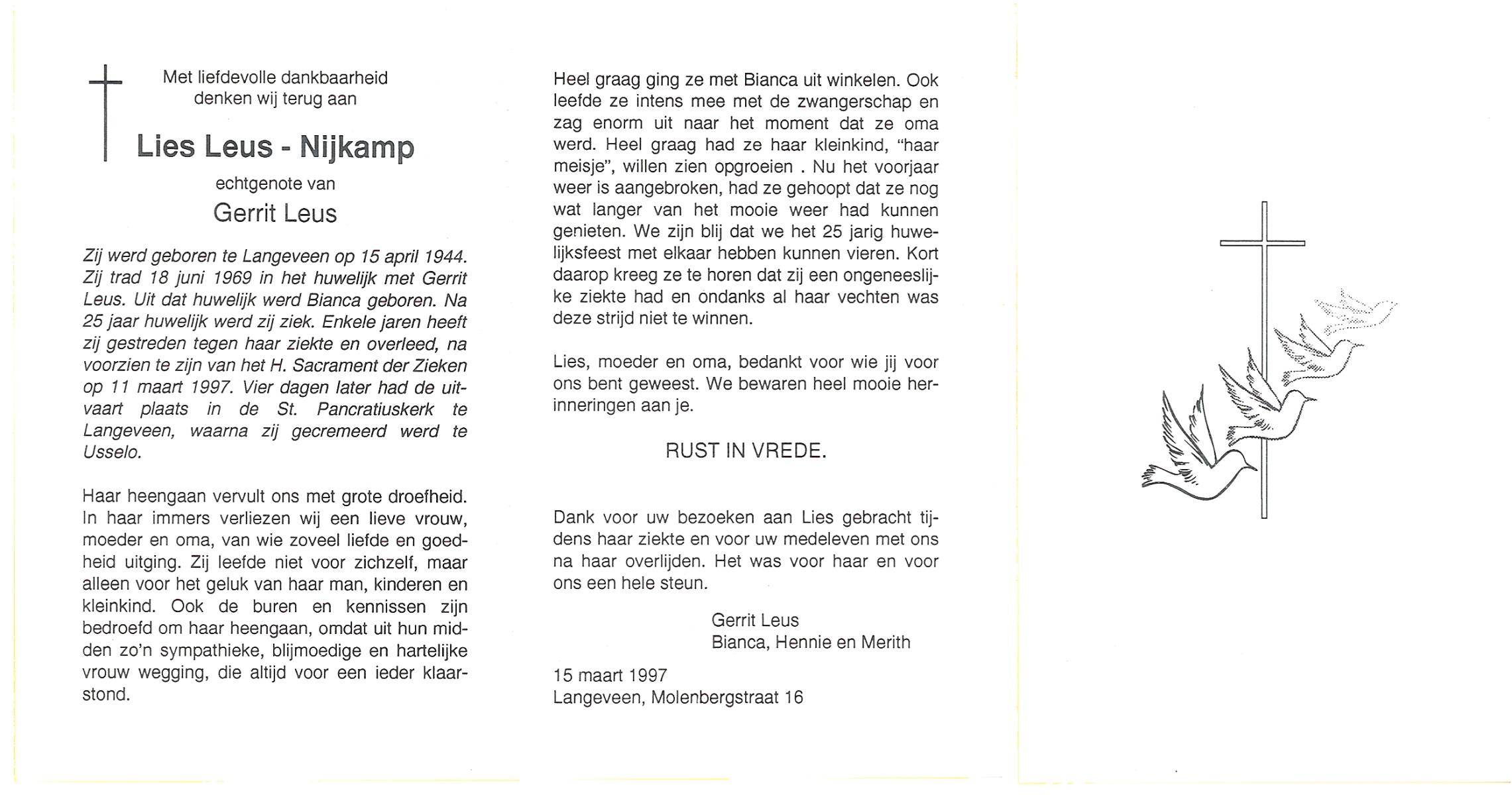 NIJKAMP, Lies, geboren op 15-4-1944 te Langeveen, overleden op 11-3-1997 op 52-jarige leeftijd, begraven op 15-3-1997 te Usselo.
