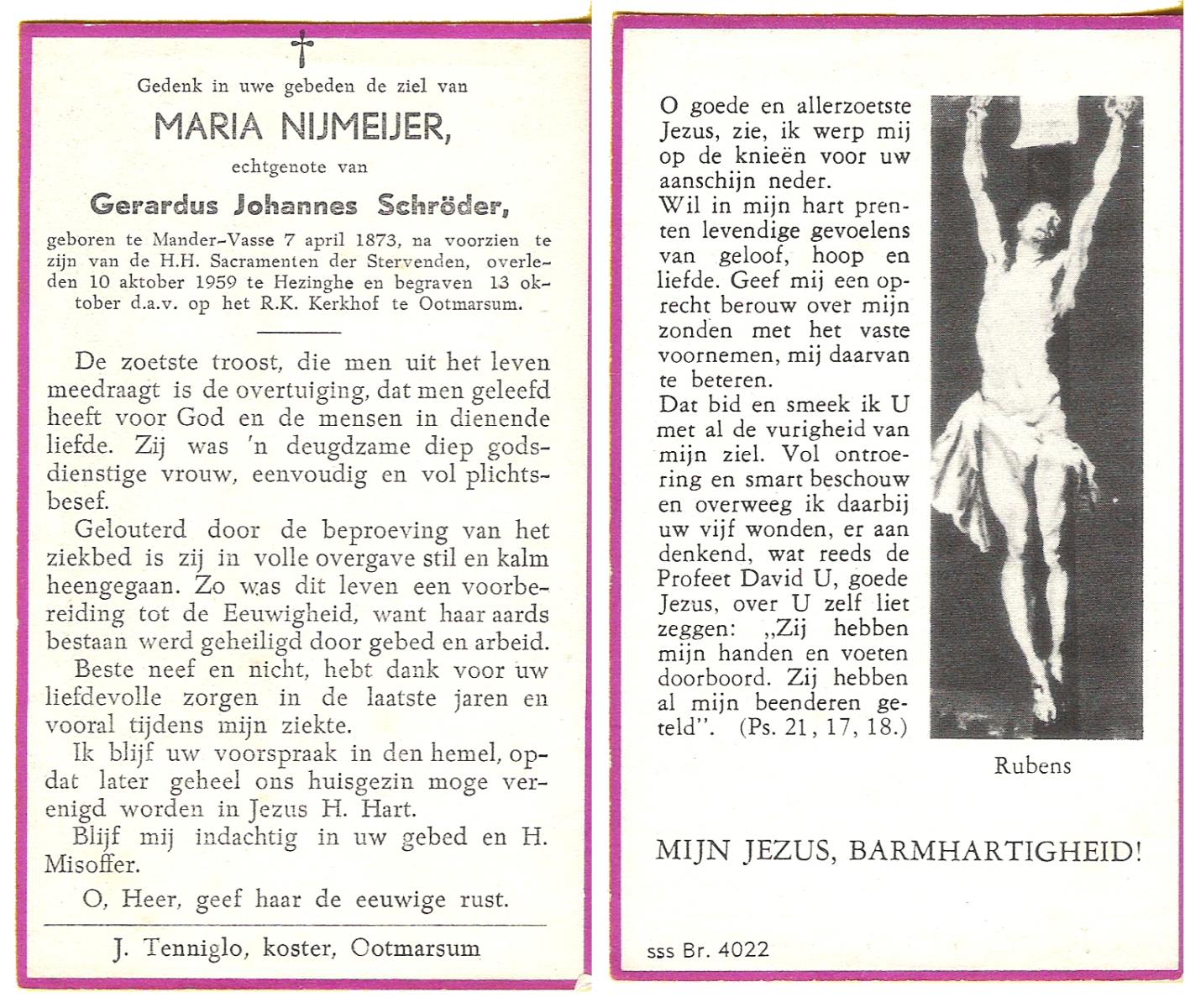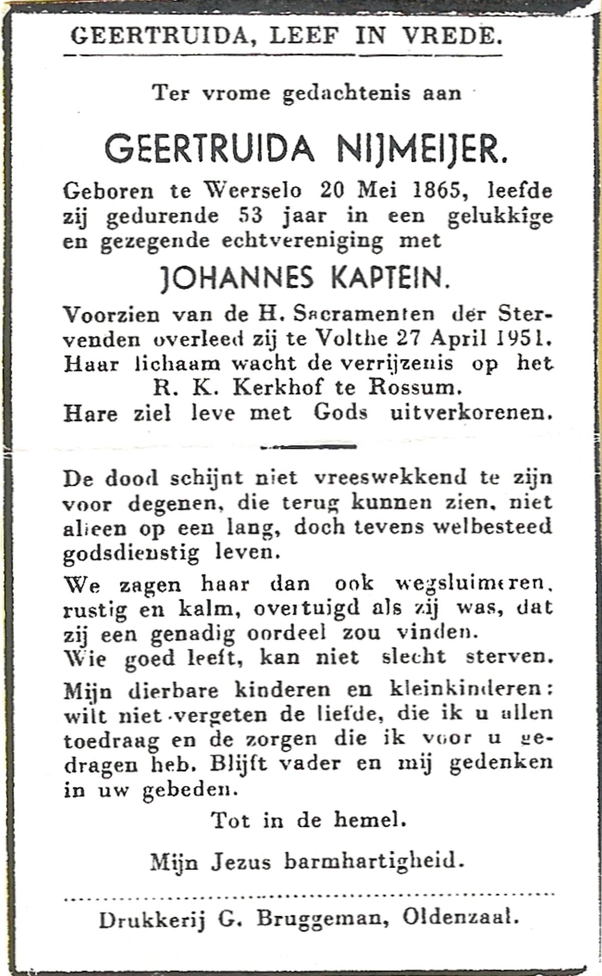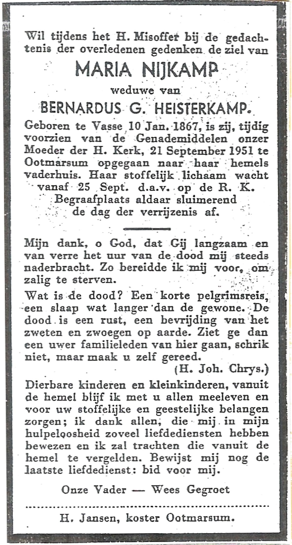 NIJKAMP, Maria, geboren op 10-01-1867 te Vasse, overleden op 21-9-1951 te Ootmarsum op 84-jarige leeftijd, begraven op 25-9-1951 te Ootmarsum.