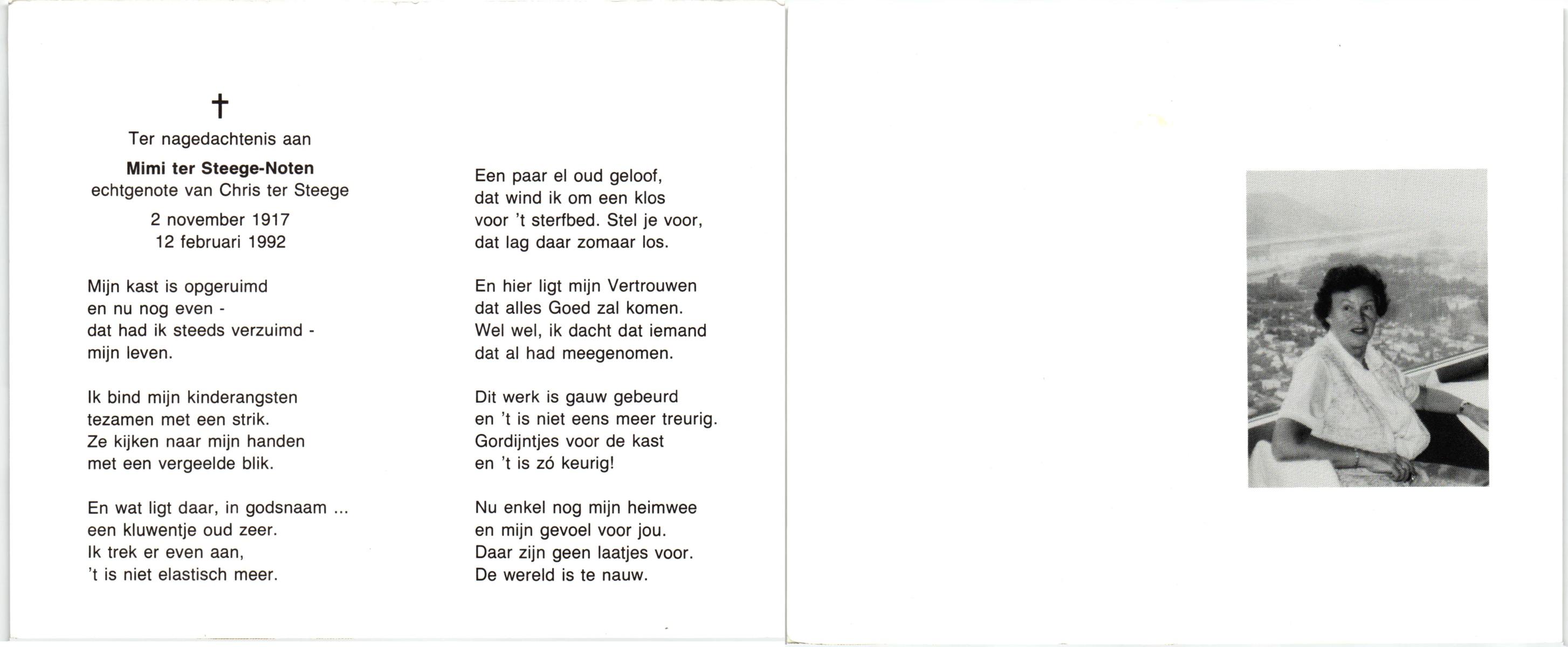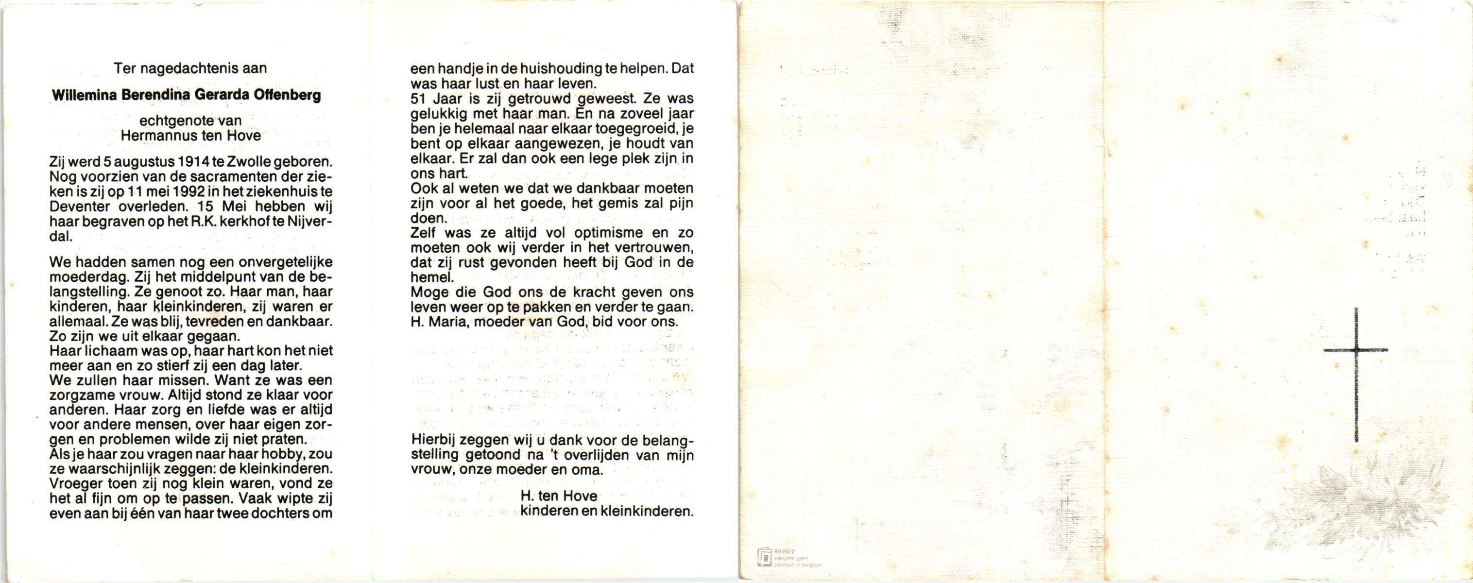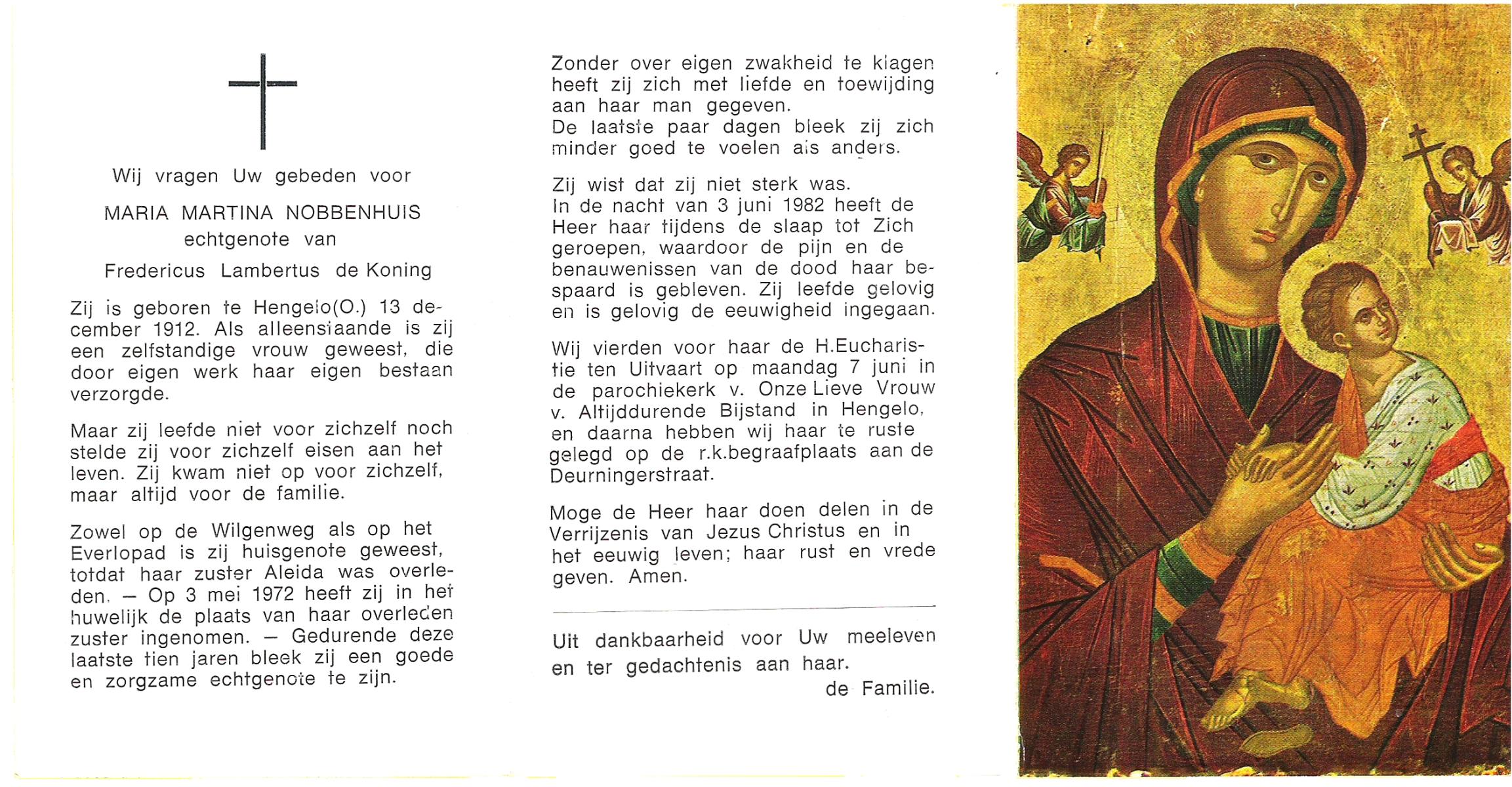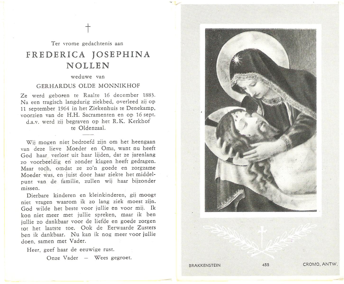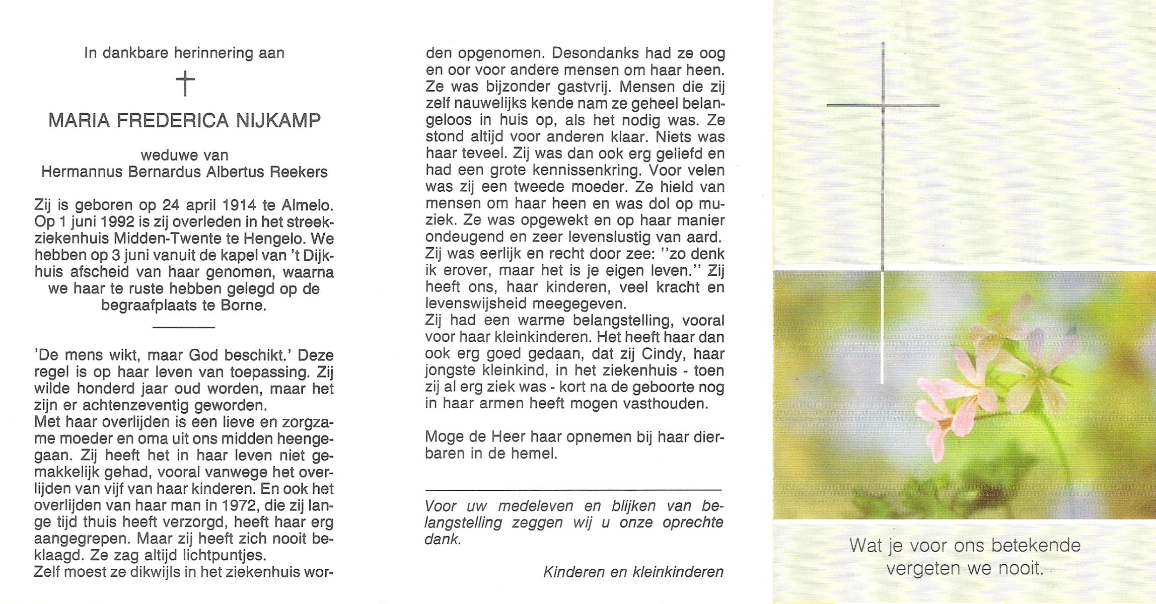 NIJKAMP, Maria Frederica, geboren op 24-4-1914 te Almelo, overleden op 1-6-1992 te Hengelo (Ov.) op 78-jarige leeftijd, begraven op 3-6-1992 te Borne.