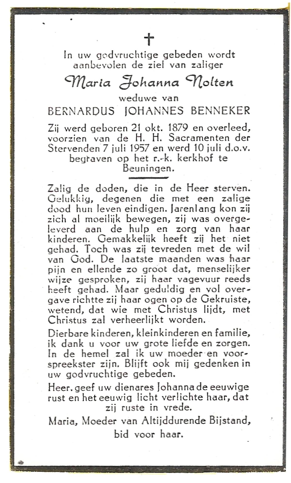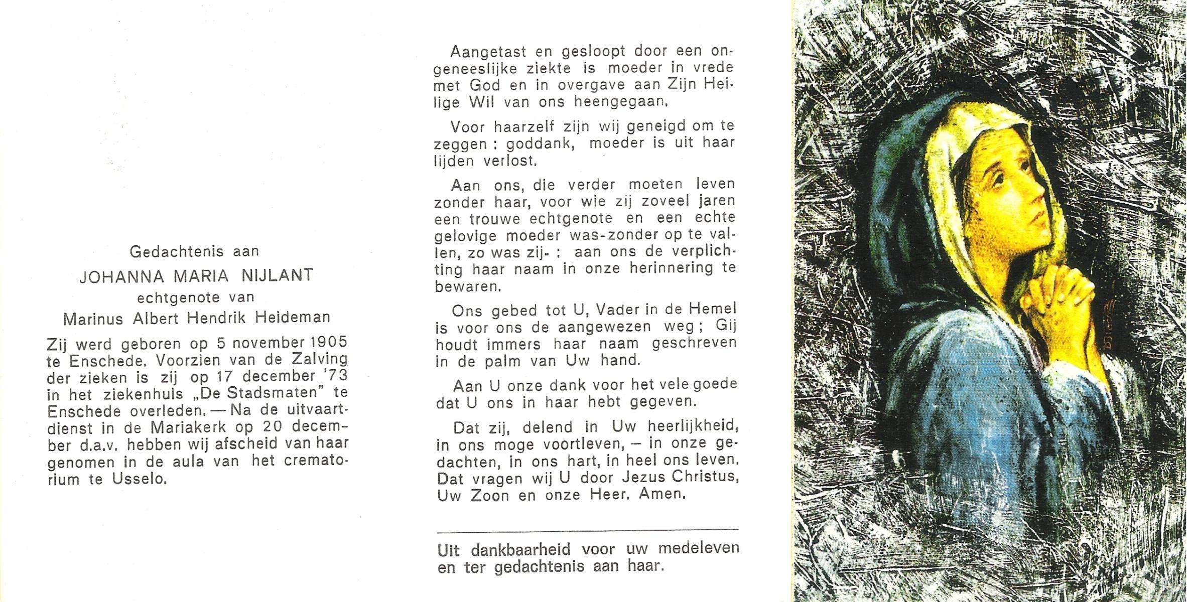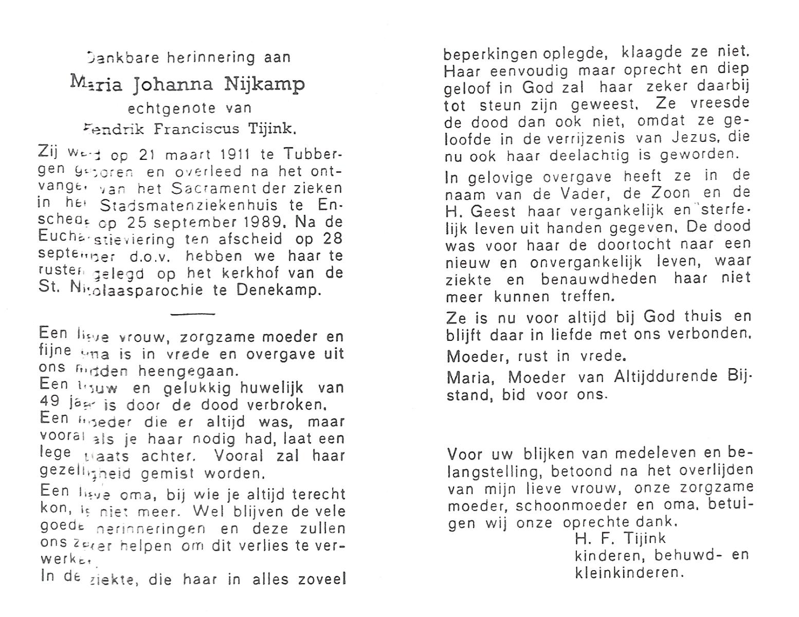 NIJKAMP, Maria Johanna, geboren op 21-3-1911 te Tubbergen, overleden op 25-9-1989 te Enschede op 78-jarige leeftijd, begraven op 28-9-1989 te Denekamp.