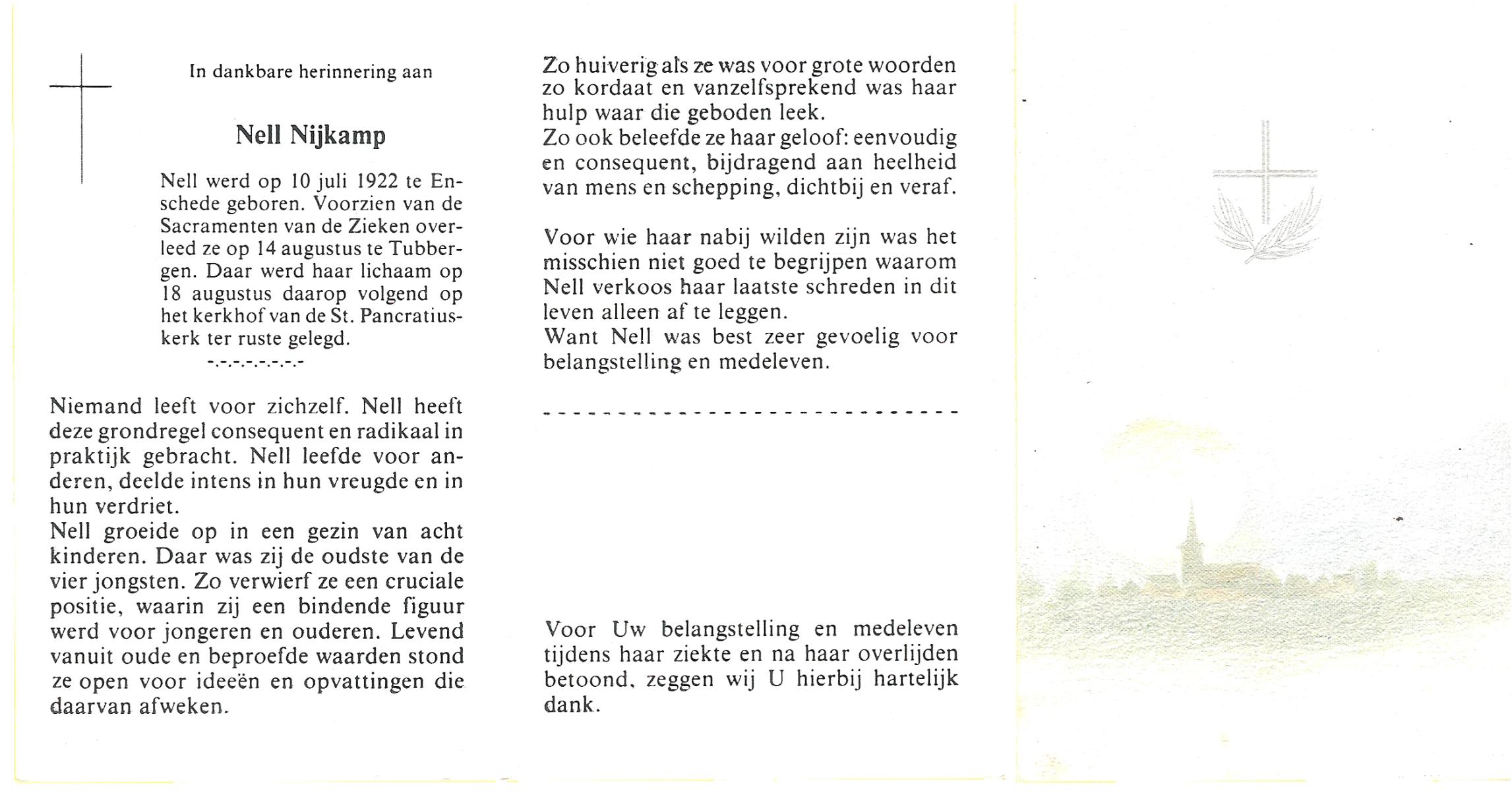 NIJKAMP, Nell, geboren op 10-7-1922 te Enschede, overleden op 14-08-0000 te Tubbergen, begraven op 18-08-0000 te Tubbergen.