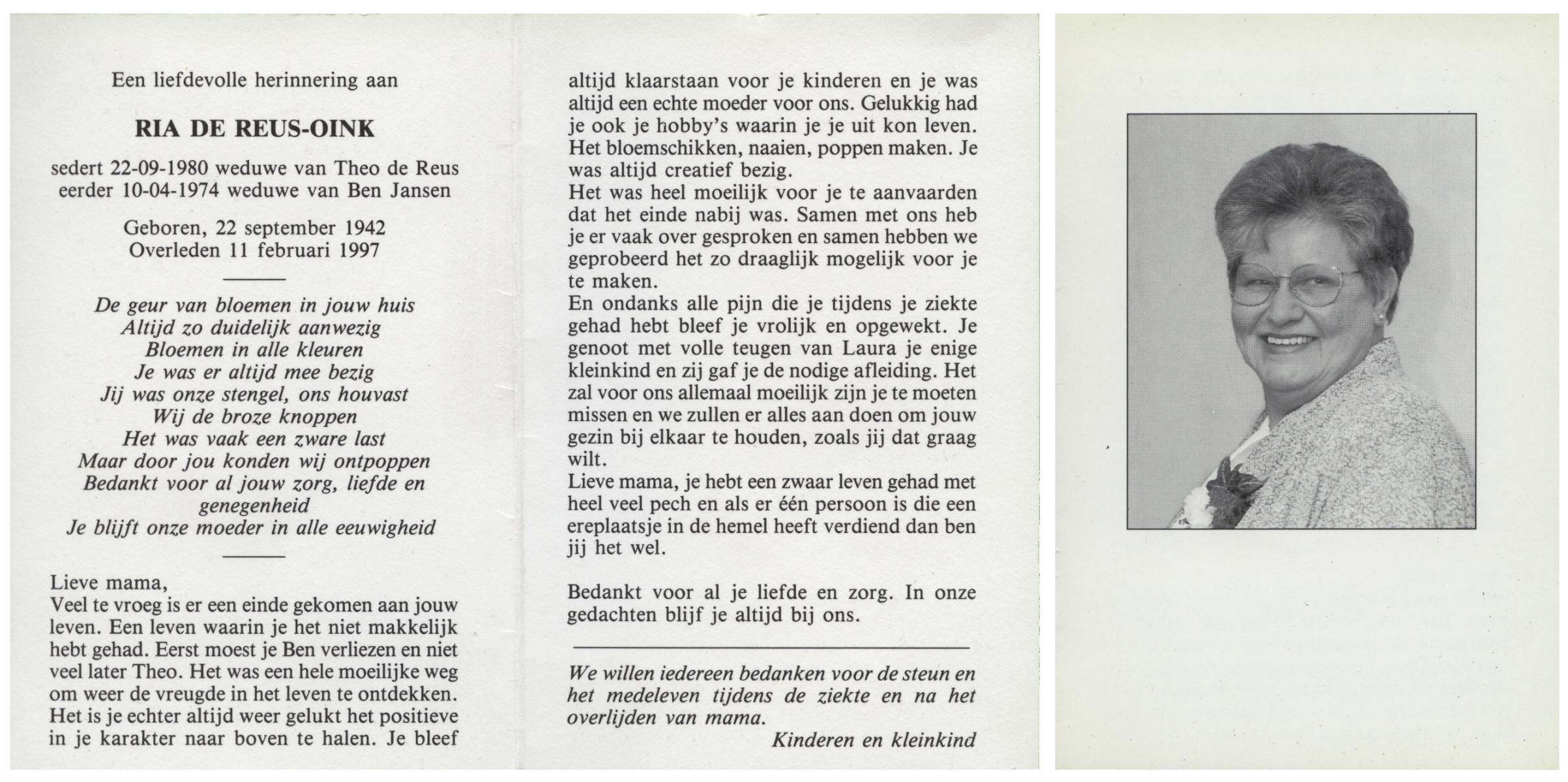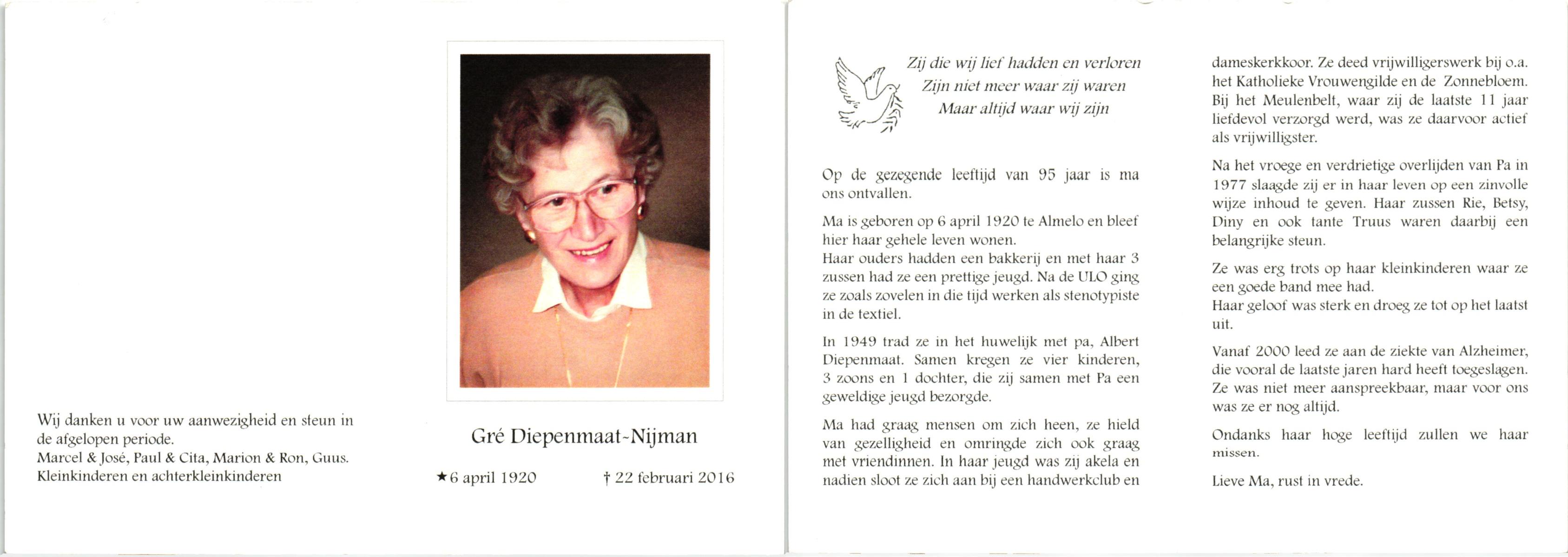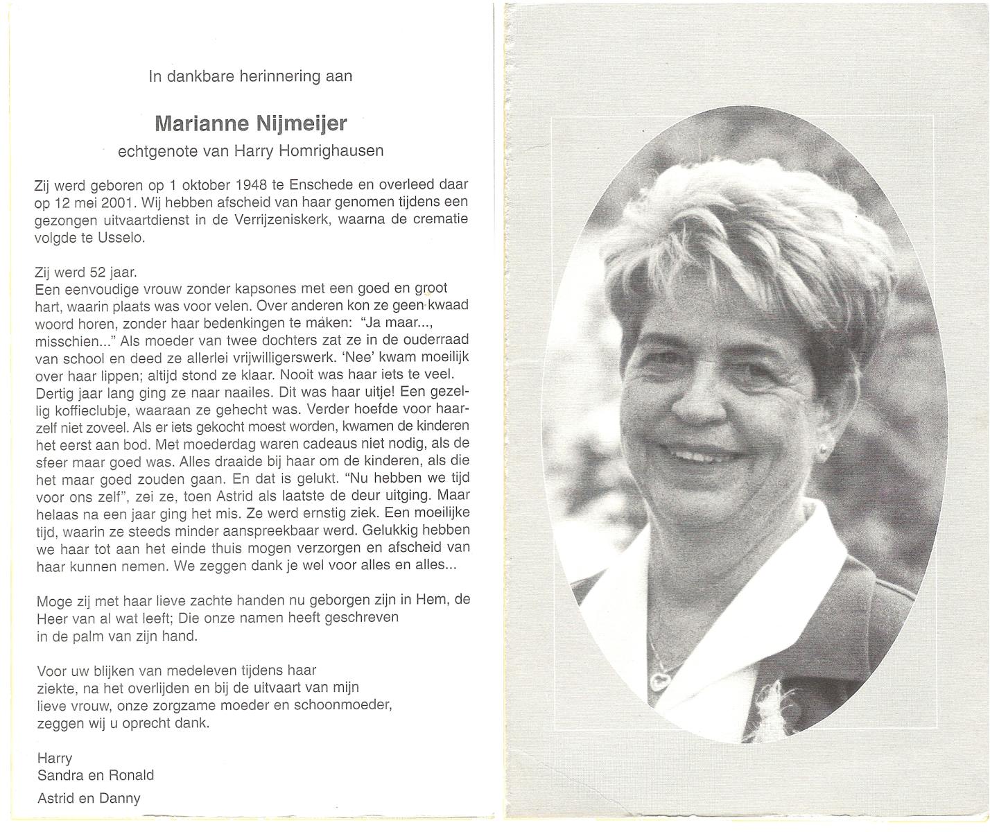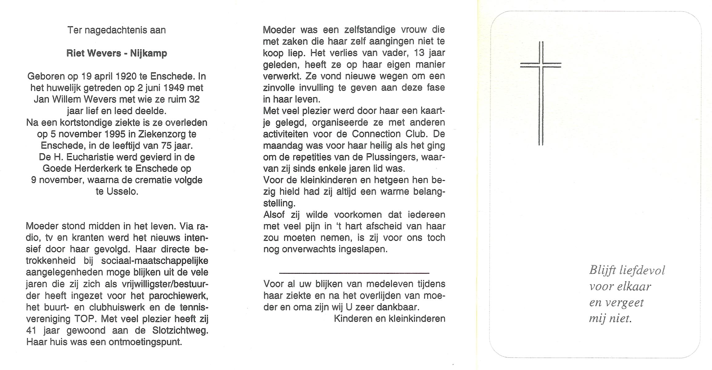 NIJKAMP, Riet, geboren op 19-4-1920 te Enschede, overleden op 5-11-1995 te Enschede op 75-jarige leeftijd, gecremeerd op 9-11-1995 te Usselo.