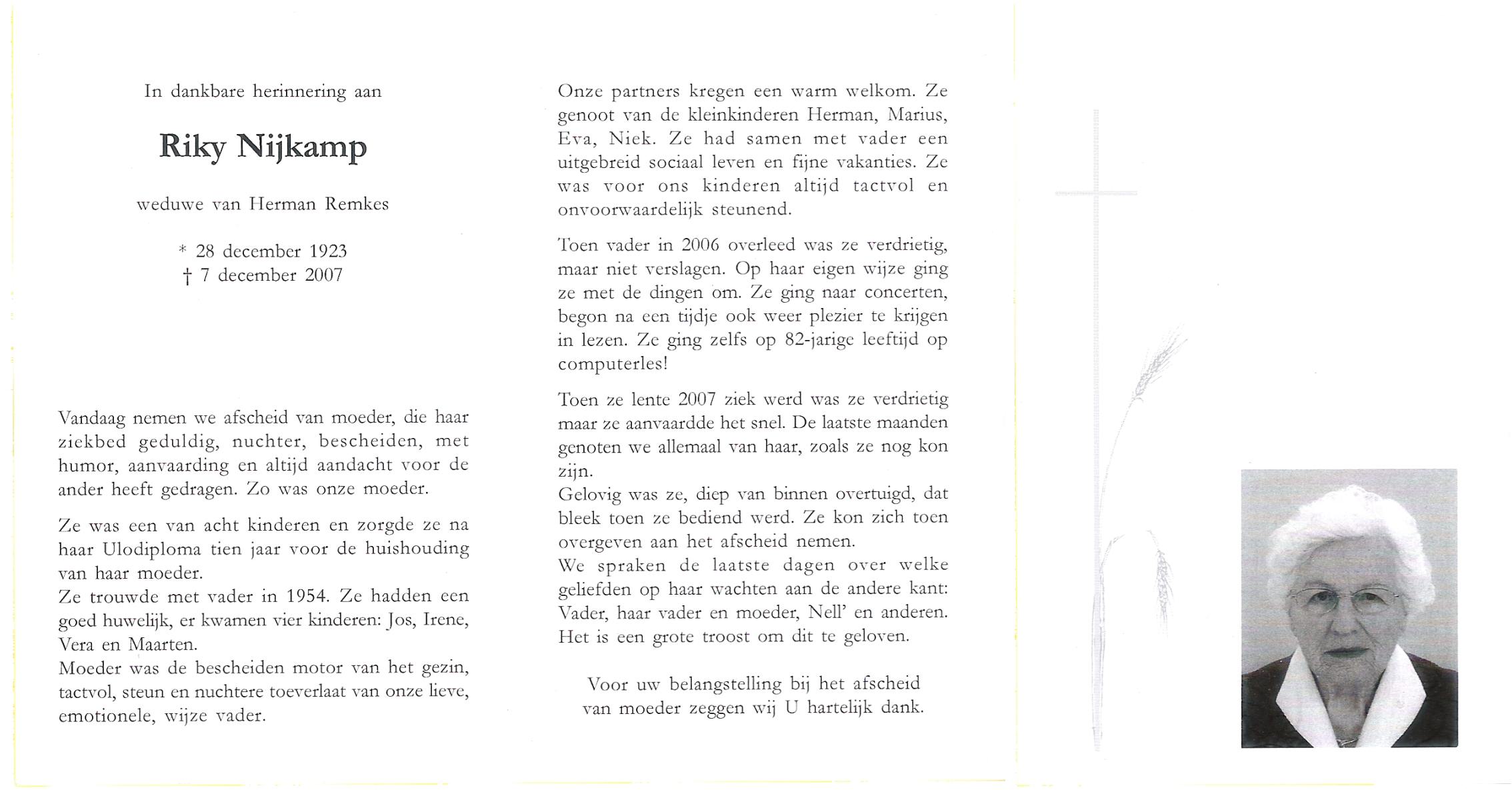 NIJKAMP, Riky, geboren op 28-12-1923, overleden op 7-12-2007 op 83-jarige leeftijd.