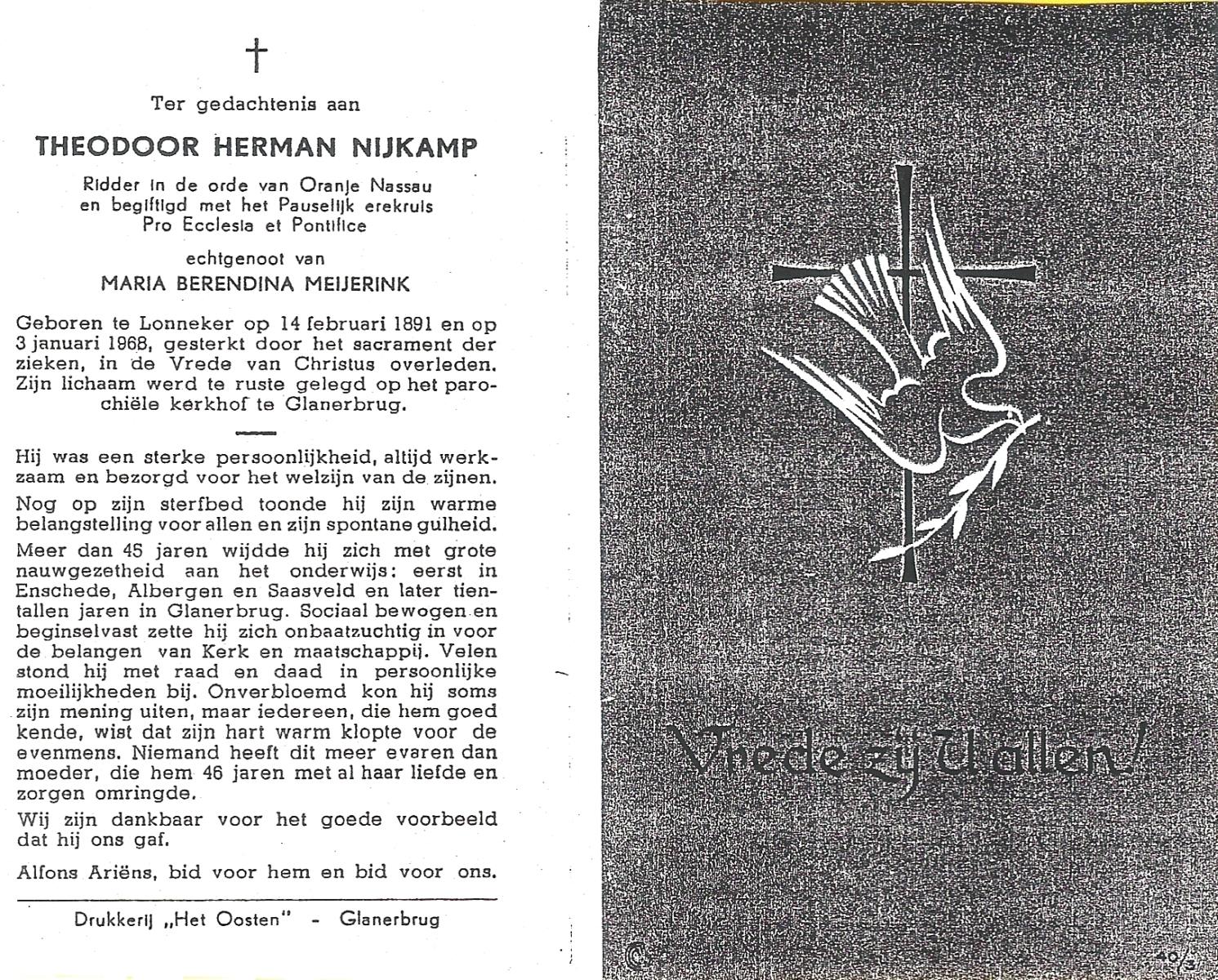 NIJKAMP, Theodoor Herman, geboren op 14-02-1891 te Lonneker, overleden op 3-1-1968 op 76-jarige leeftijd, begraven te Glanerbrug.