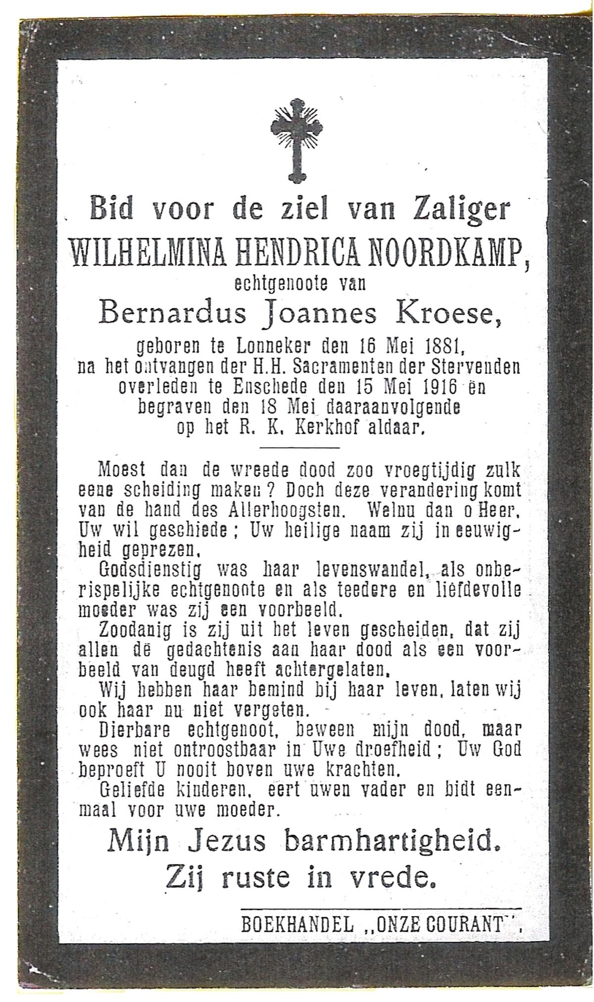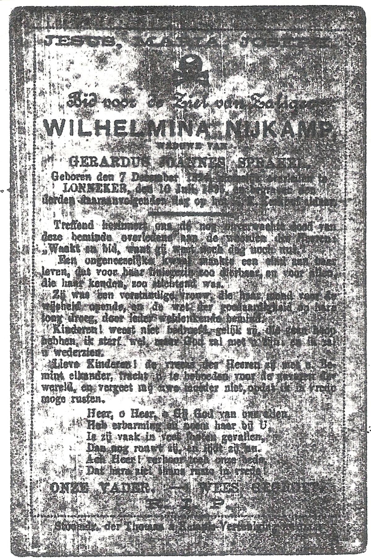 NIJKAMP, Wilhelmina, geboren op 07-12-1824 te Lonneker, overleden op 10-07-1896 te Lonneker op 70-jarige leeftijd, begraven op 13-07-1896 te Lonneker.