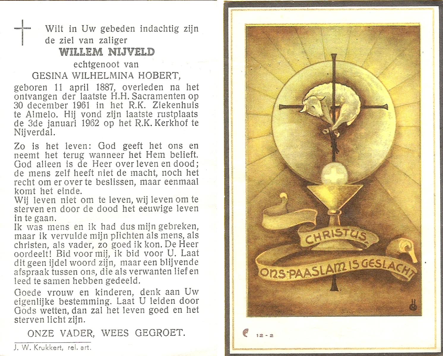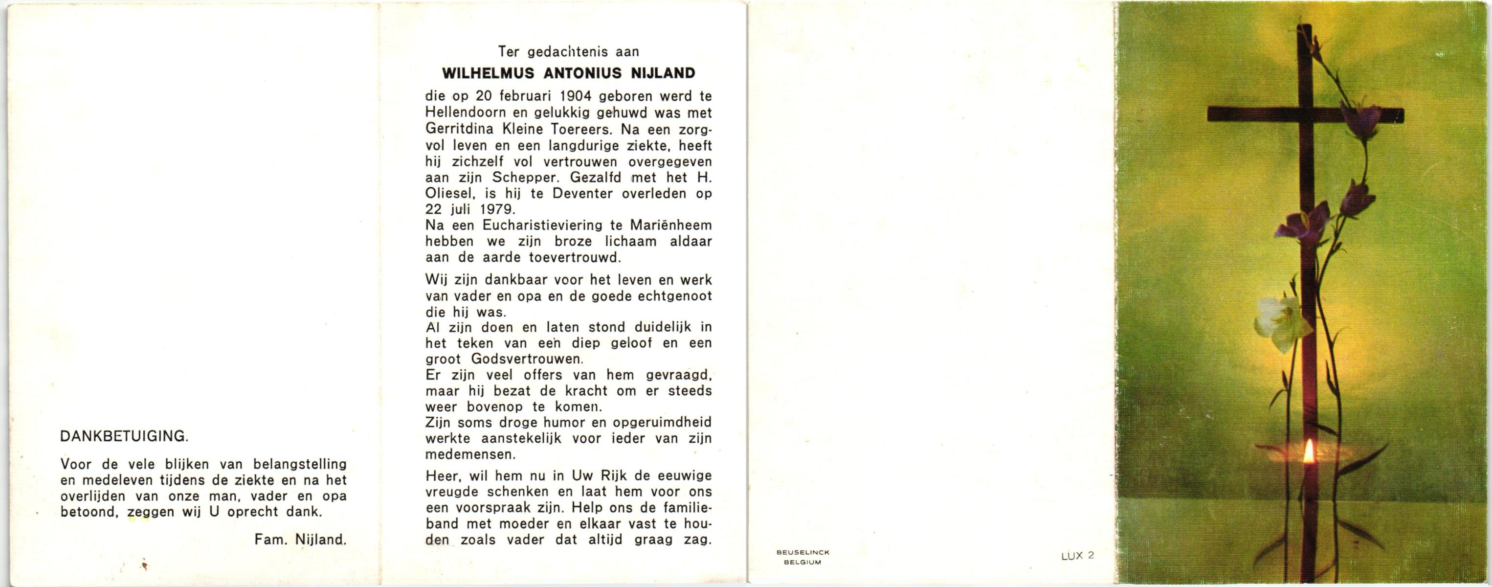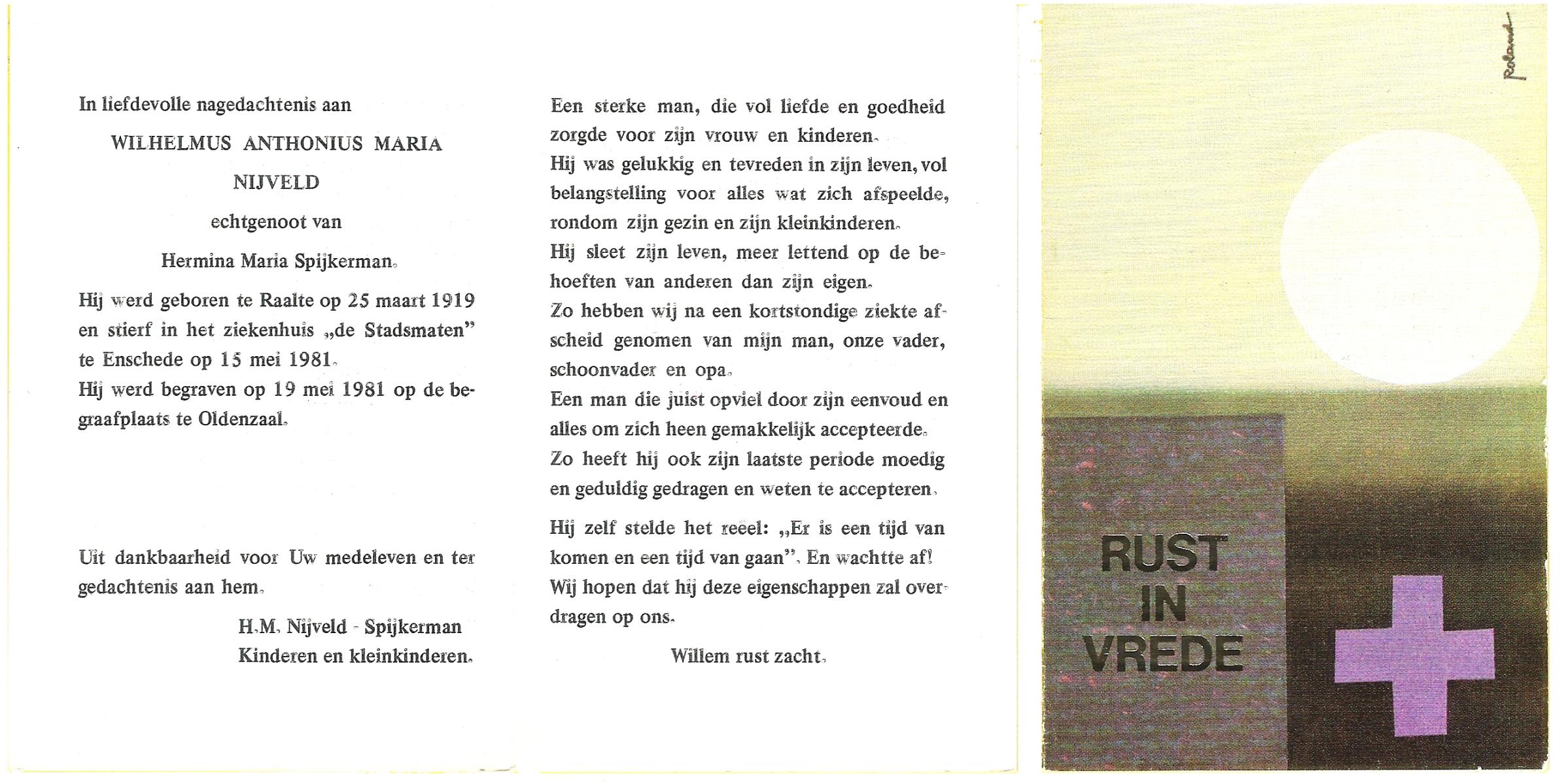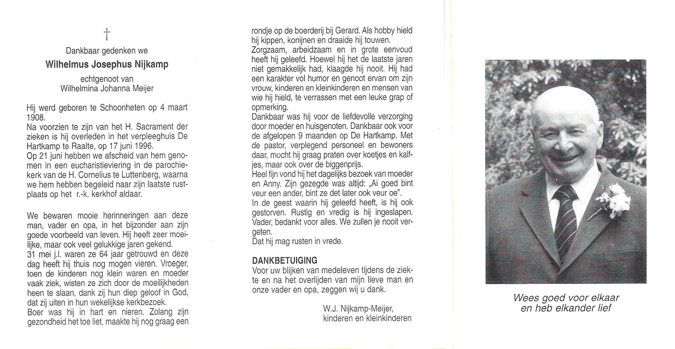 NIJKAMP, Wilhelmus Josephus, geboren op 4-3-1908 te Schoonheten, overleden op 17-6-1996 te Raalte op 88-jarige leeftijd, begraven op 21-6-1996 te Luttenberg, Raalte.